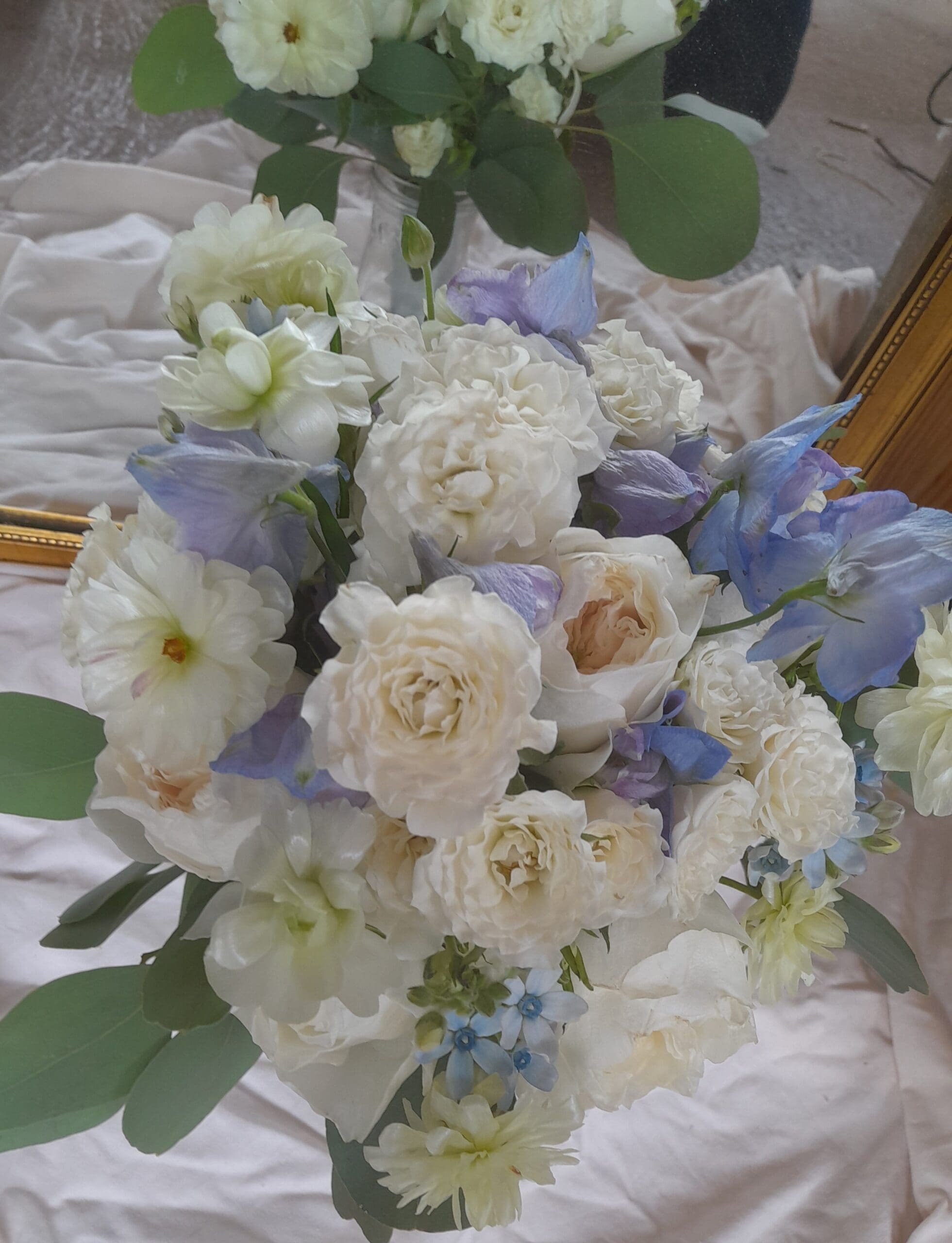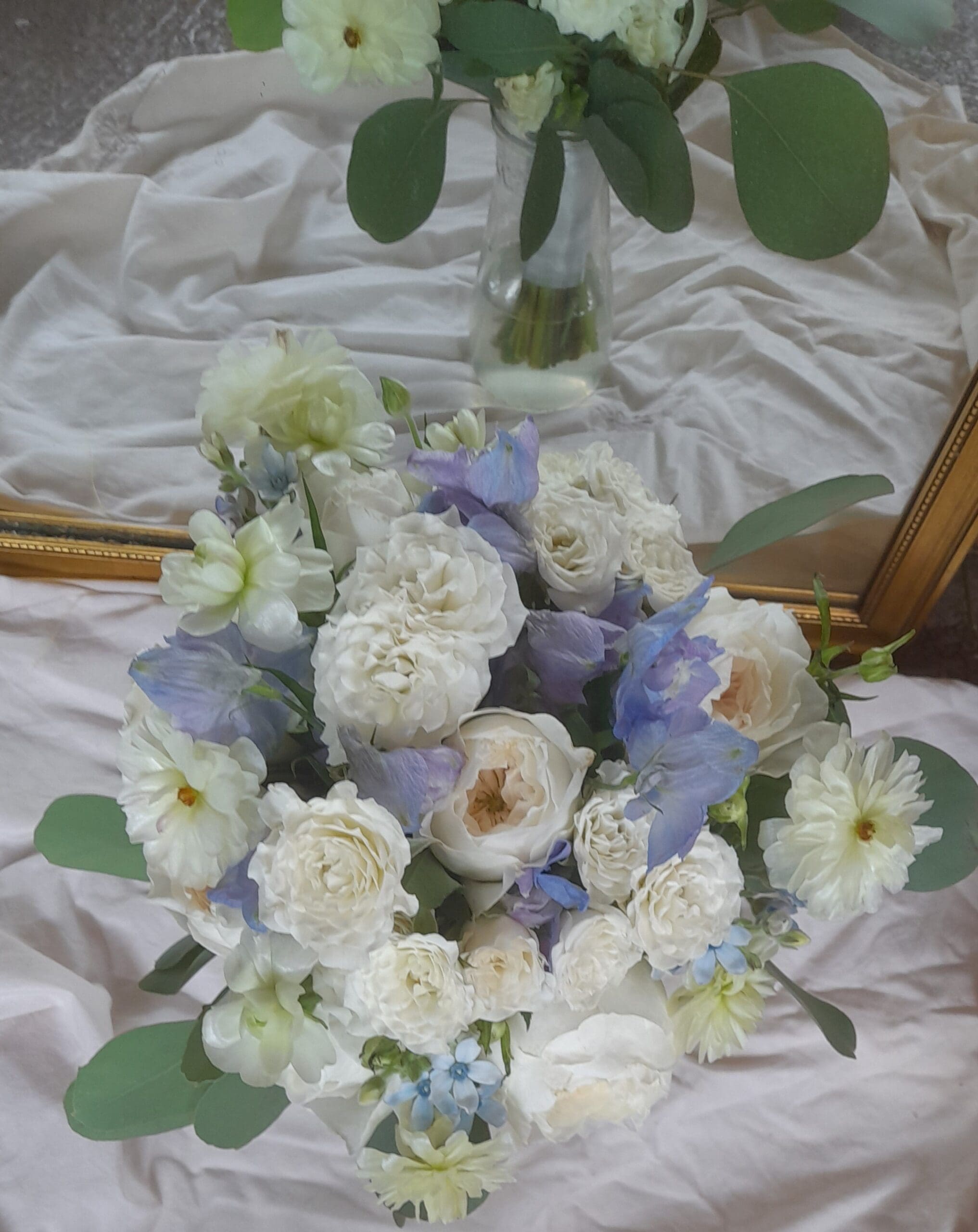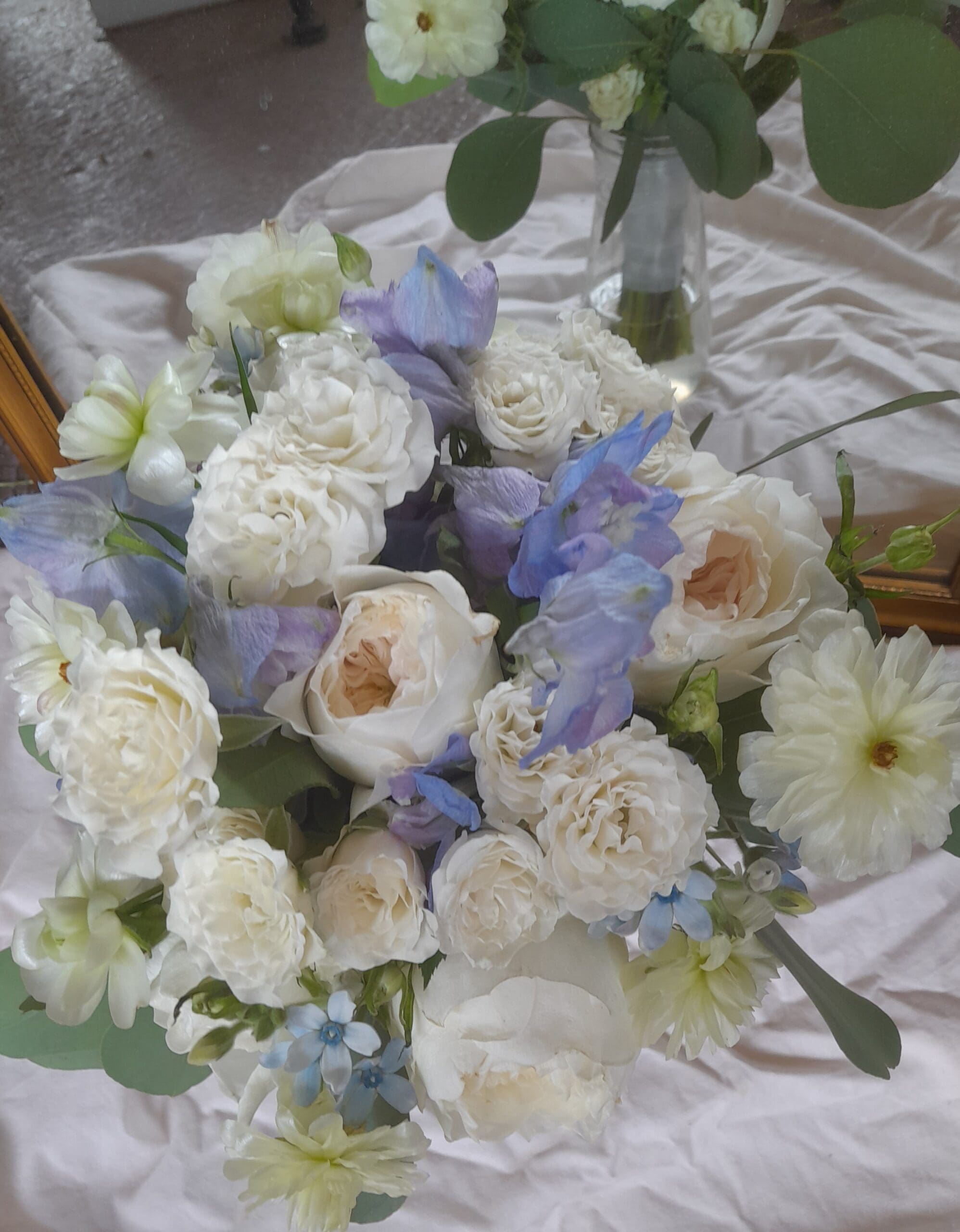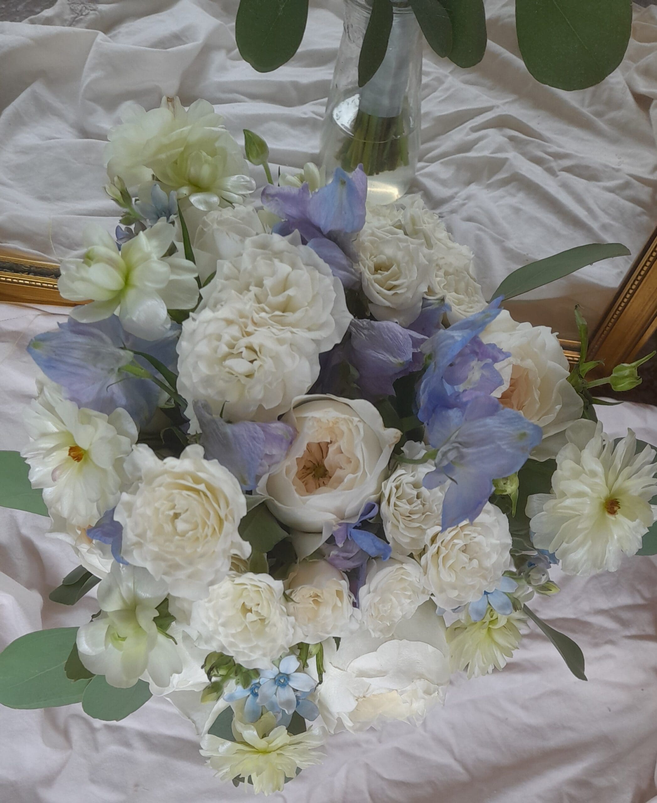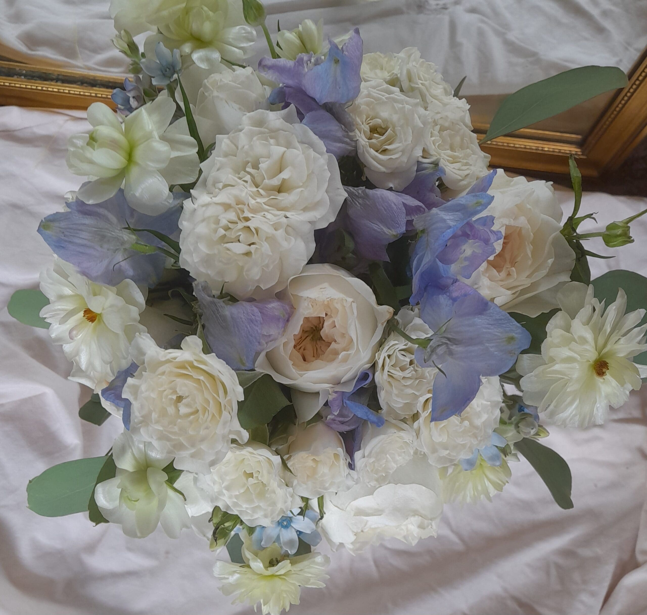 Bouquet rond composé avec fleurs de saison bleu Ciel et rose de jardin romantique et chic absolu