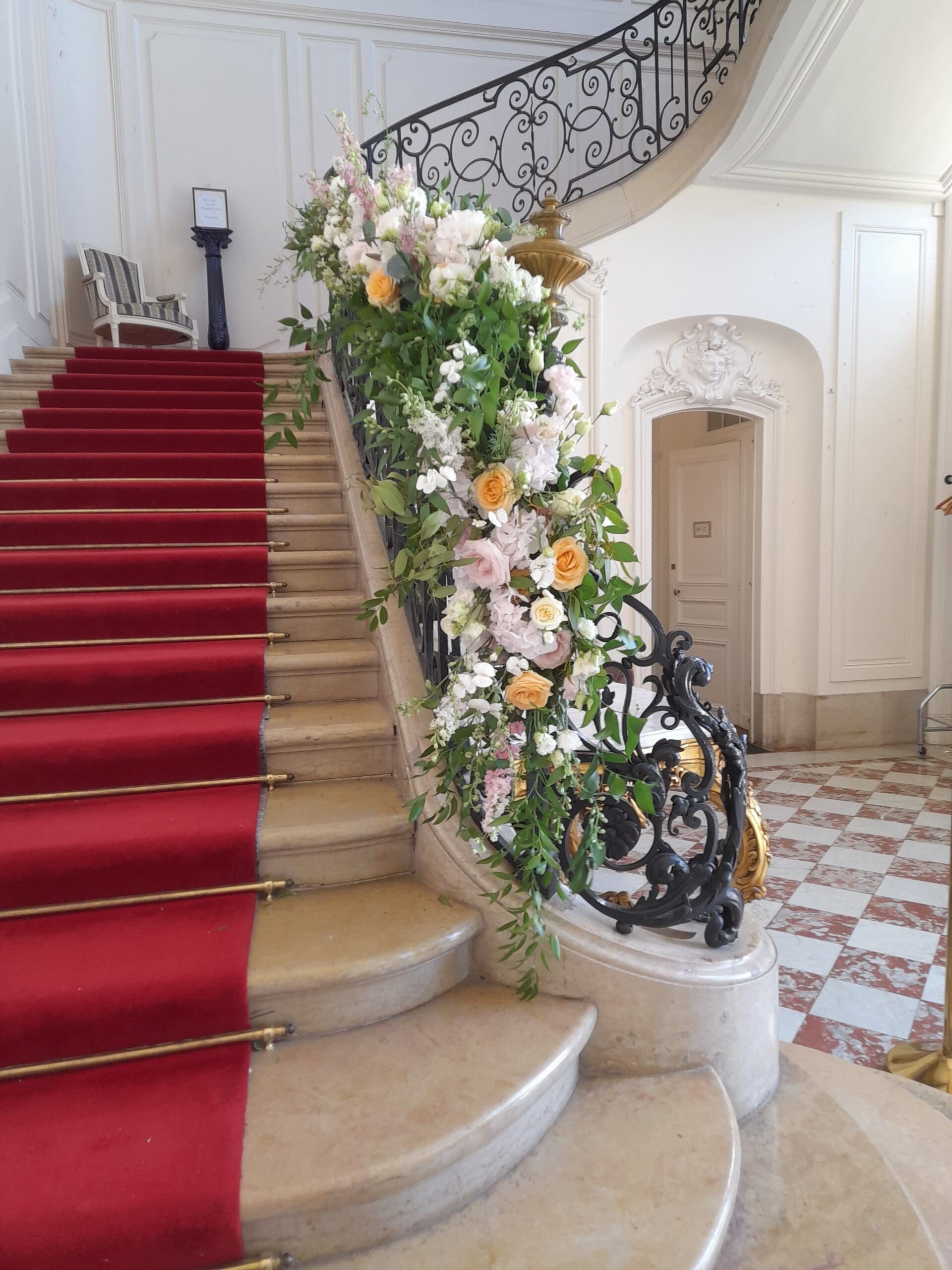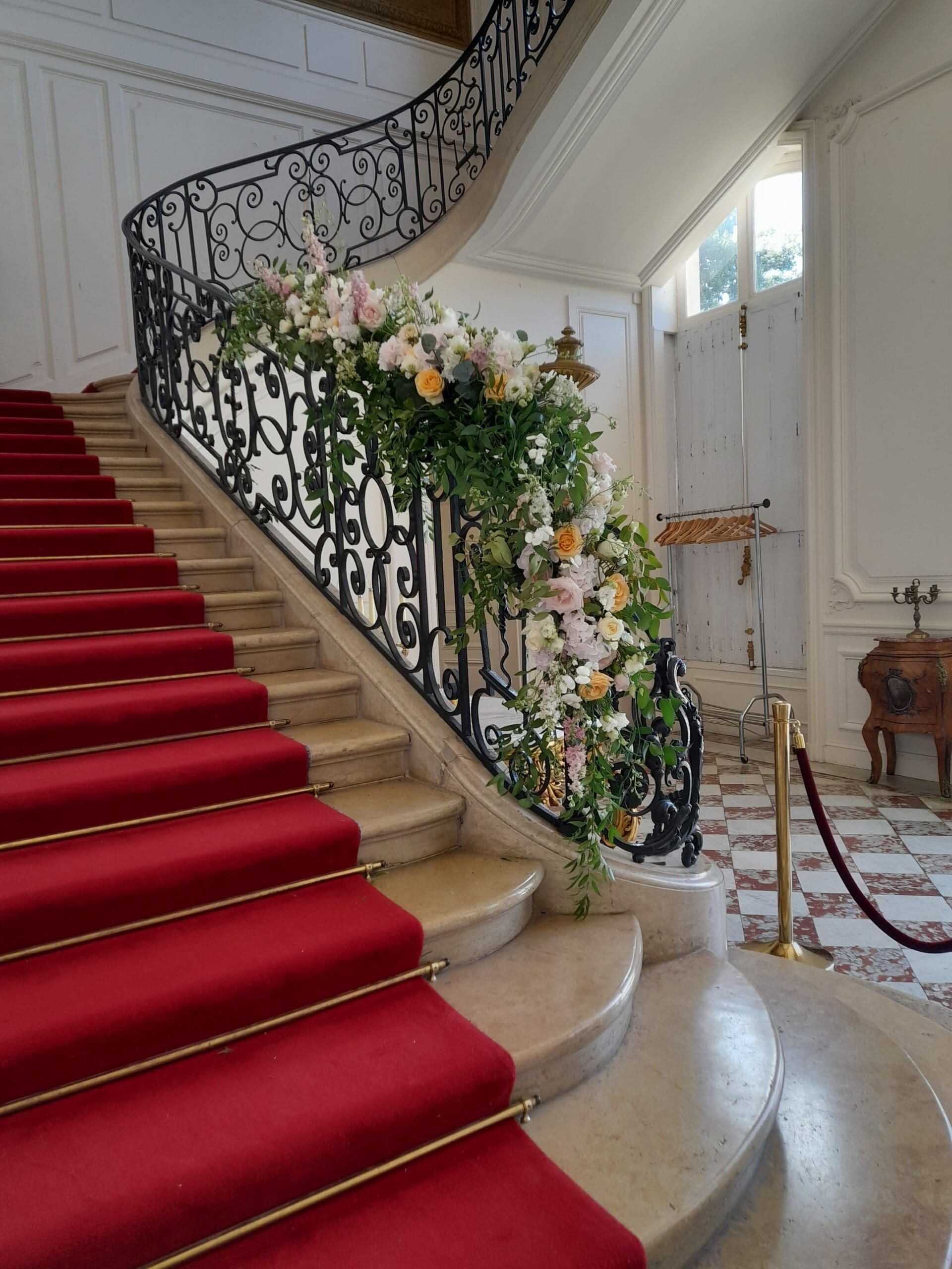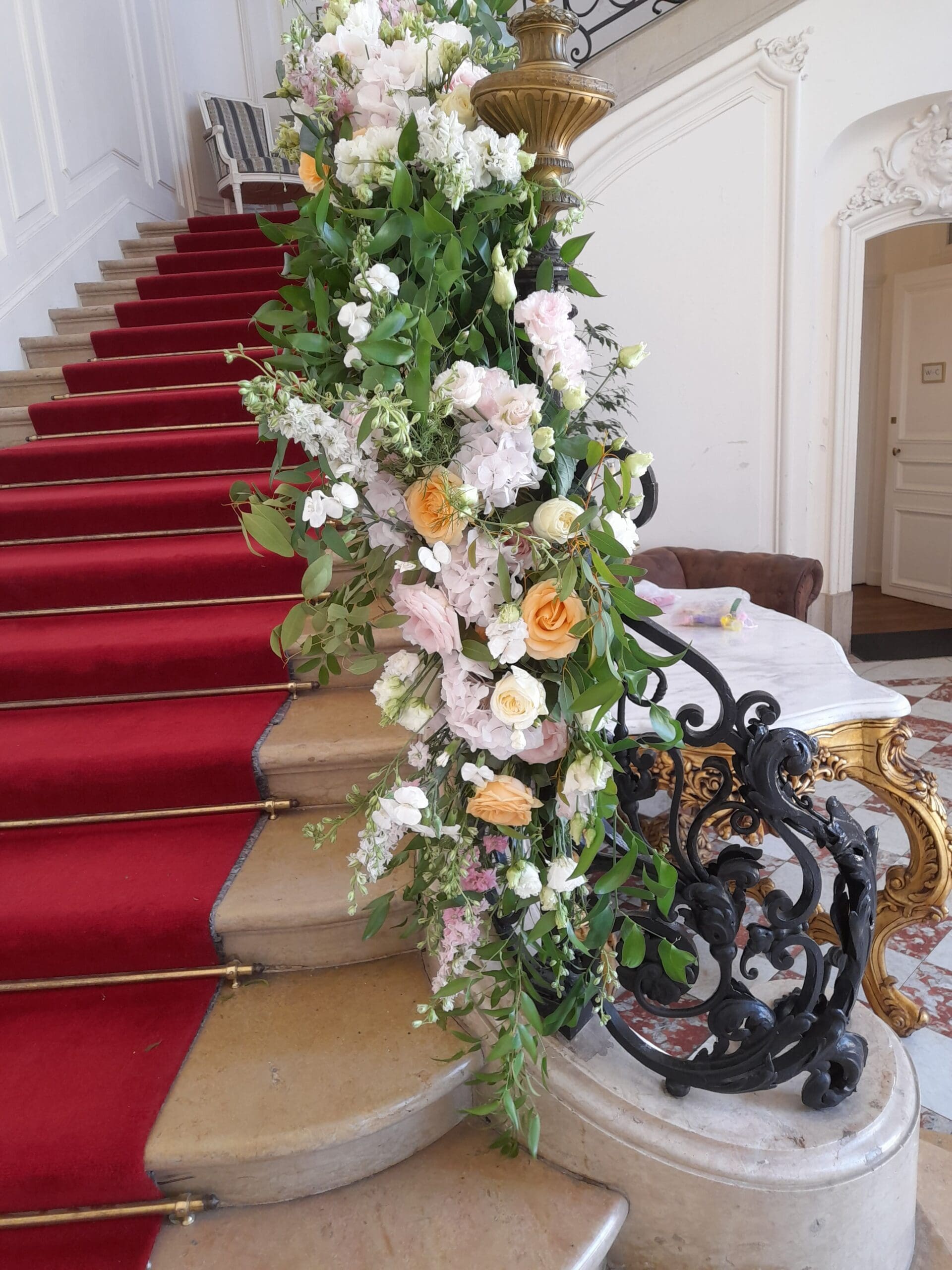 Décoration escalier réalisée en fleurs aux teintes douces , possibilité de le réaliser dans toutes les couleurs de votre mariage, prix indiqué par mettre linéaire, a partir de 120€ du mettre n’hésitez pas à nous consulter pour obtenir votre devis personnalisé,