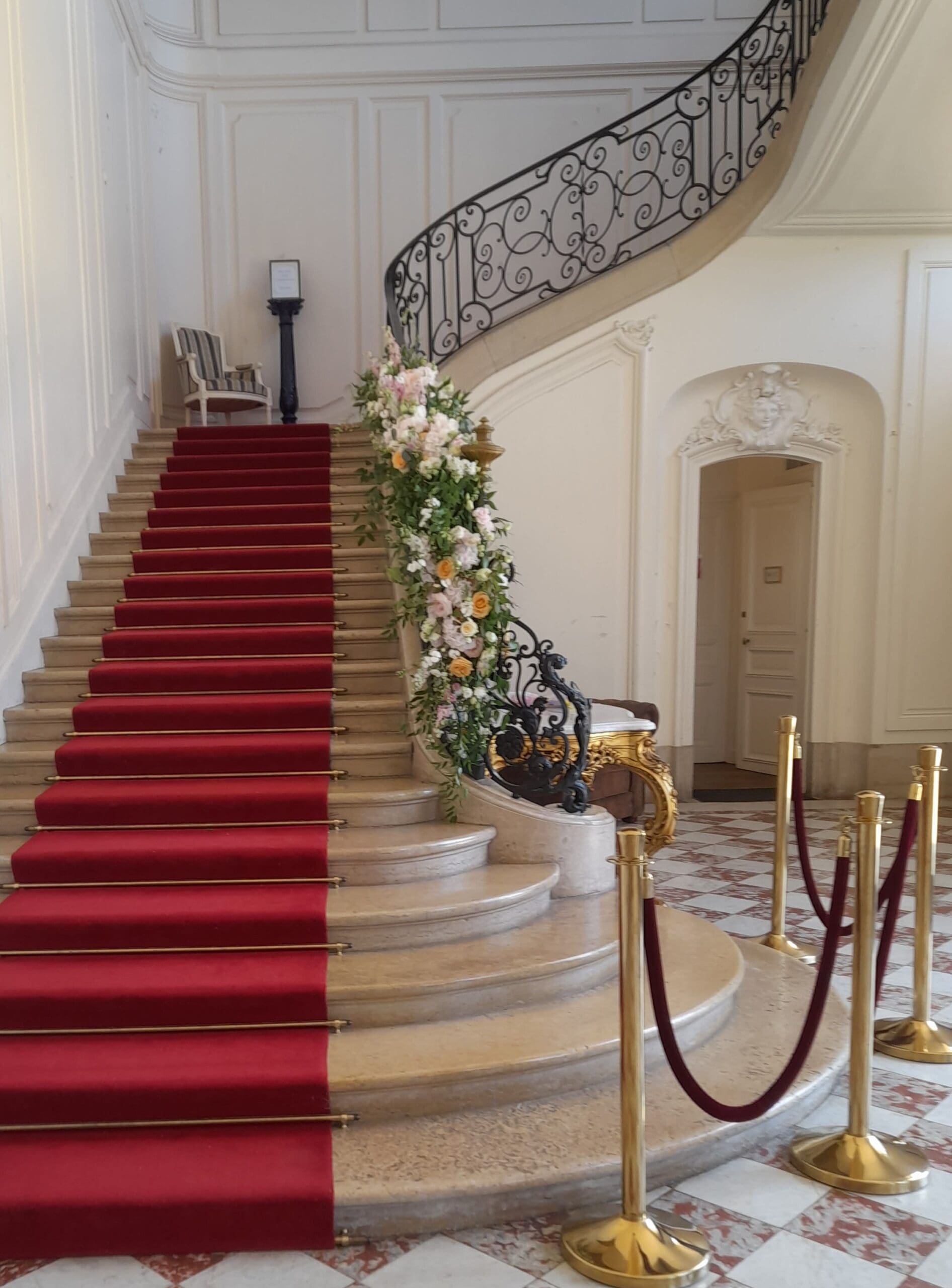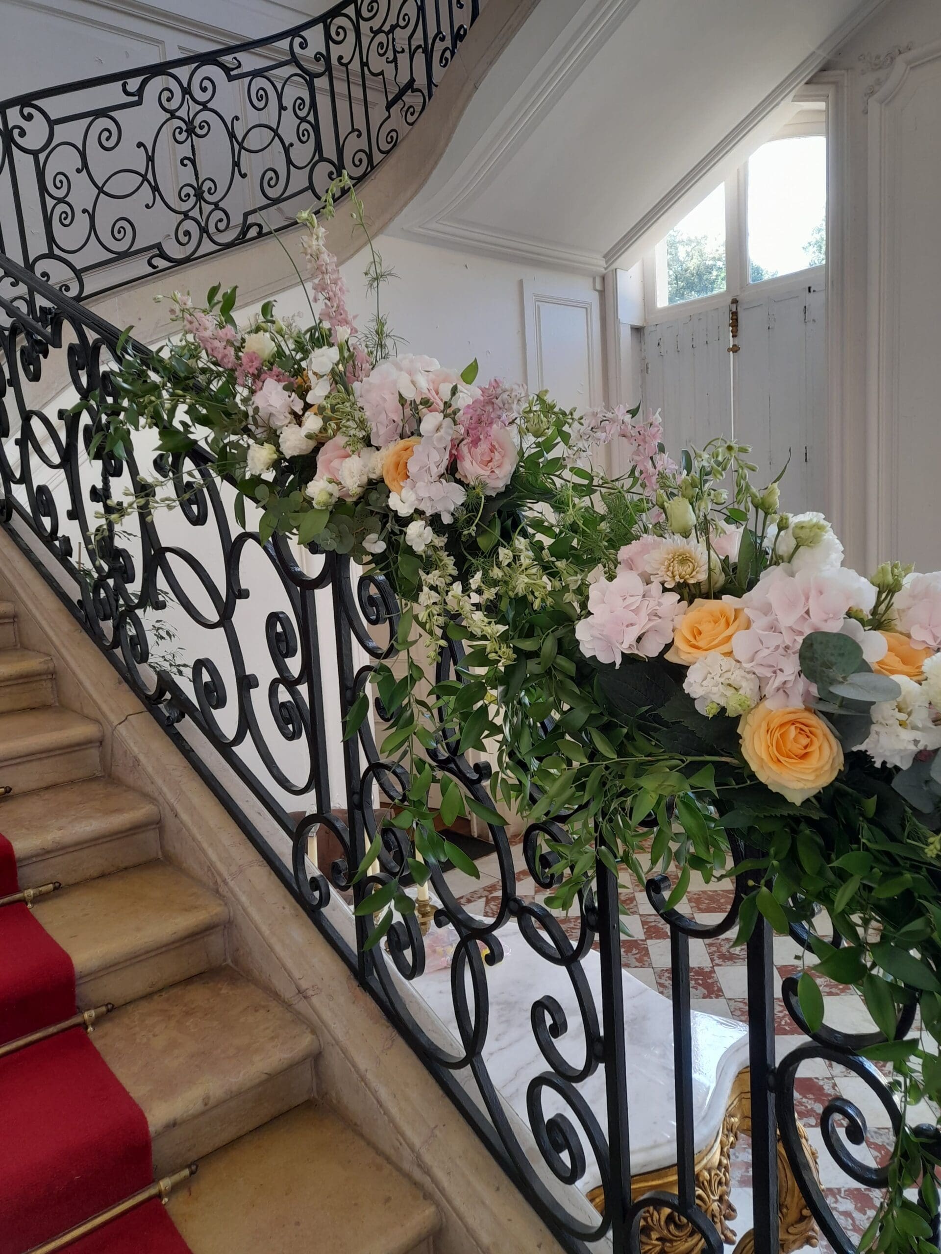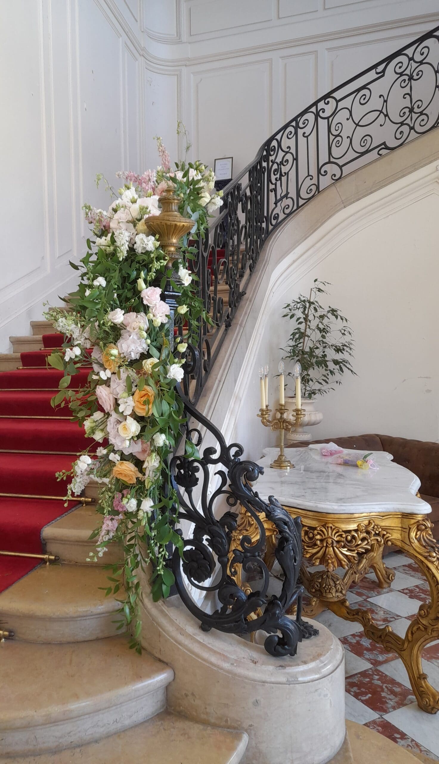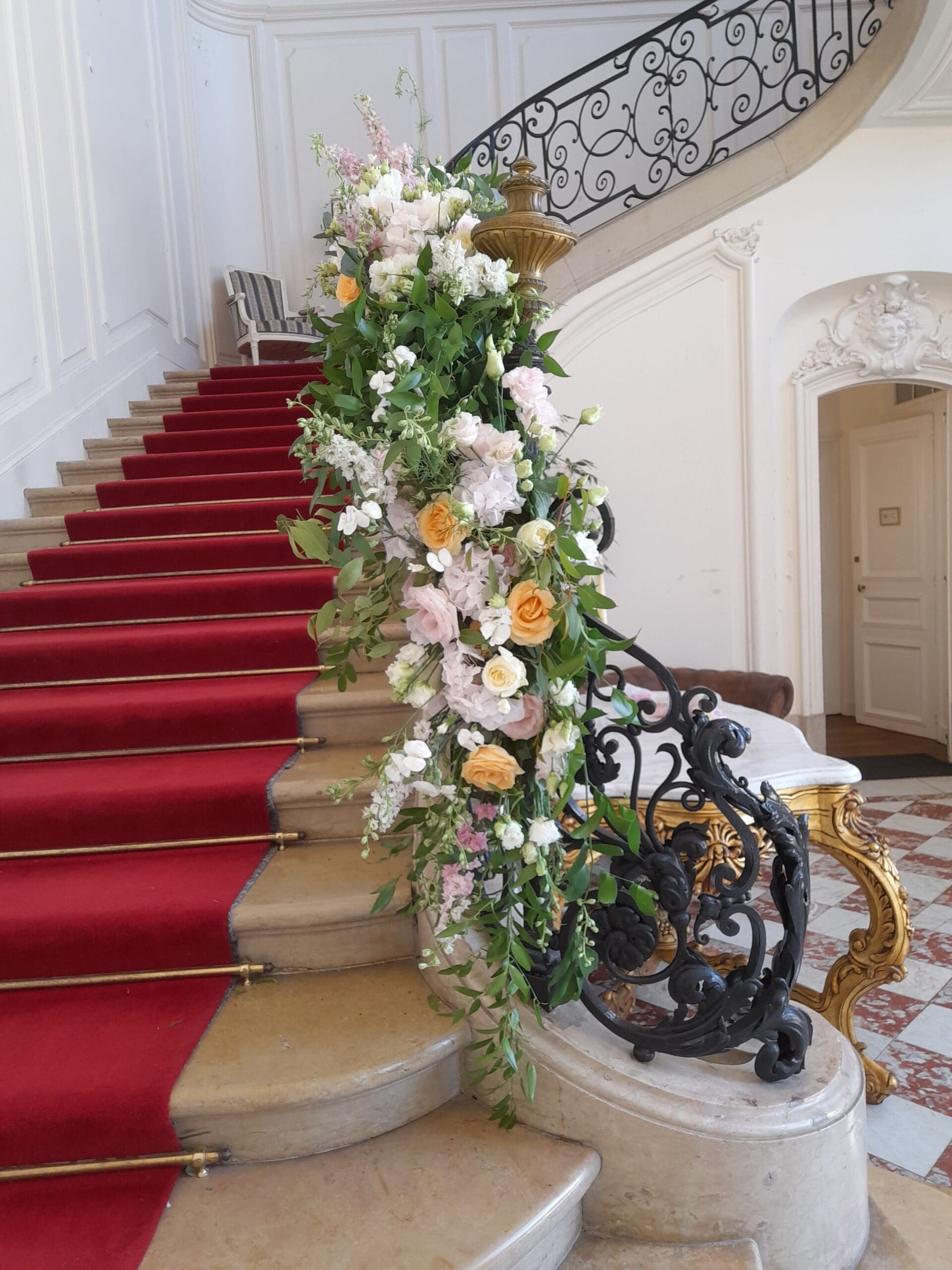 Décoration escalier réalisée en fleurs aux teintes douces , possibilité de le réaliser dans toutes les couleurs de votre mariage, prix indiqué par mettre linéaire, a partir de 120€ du mettre n’hésitez pas à nous consulter pour obtenir votre devis personnalisé,