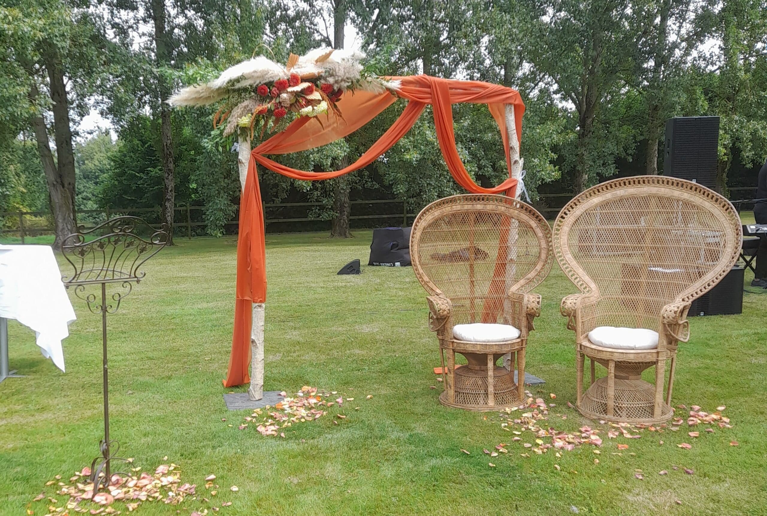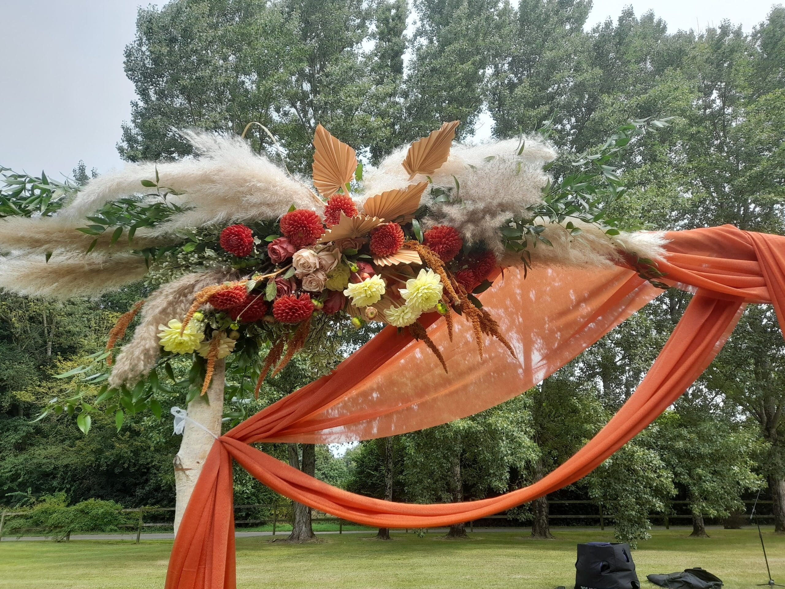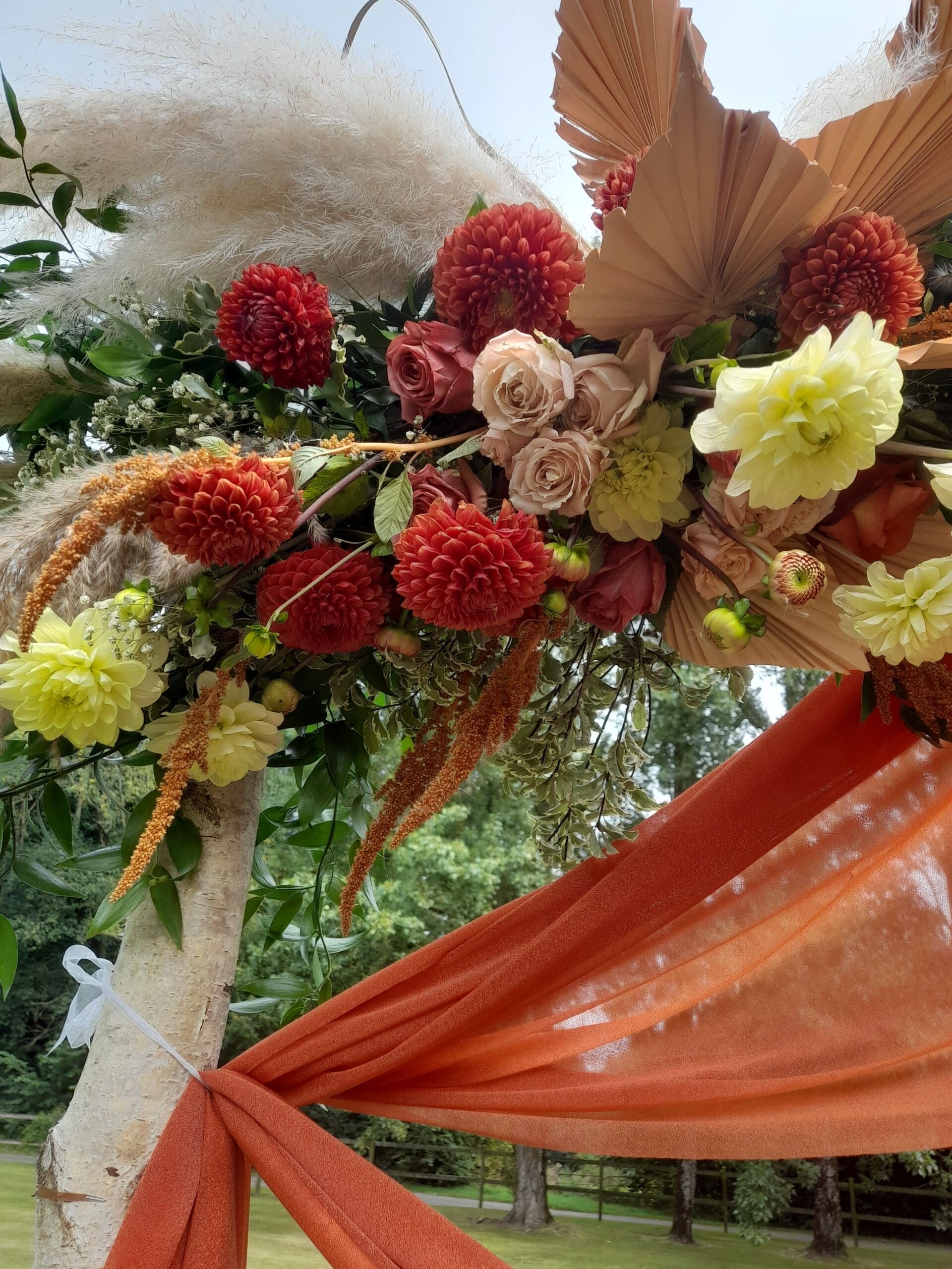 Arche en bouleau thème terra cotta, fleurs fraîches couleurs chocolat, crème, feuille de palme et pampa, prix indiqué pour le fleurissent et la location arche et voilage inclus, installation et démontage non inclus,