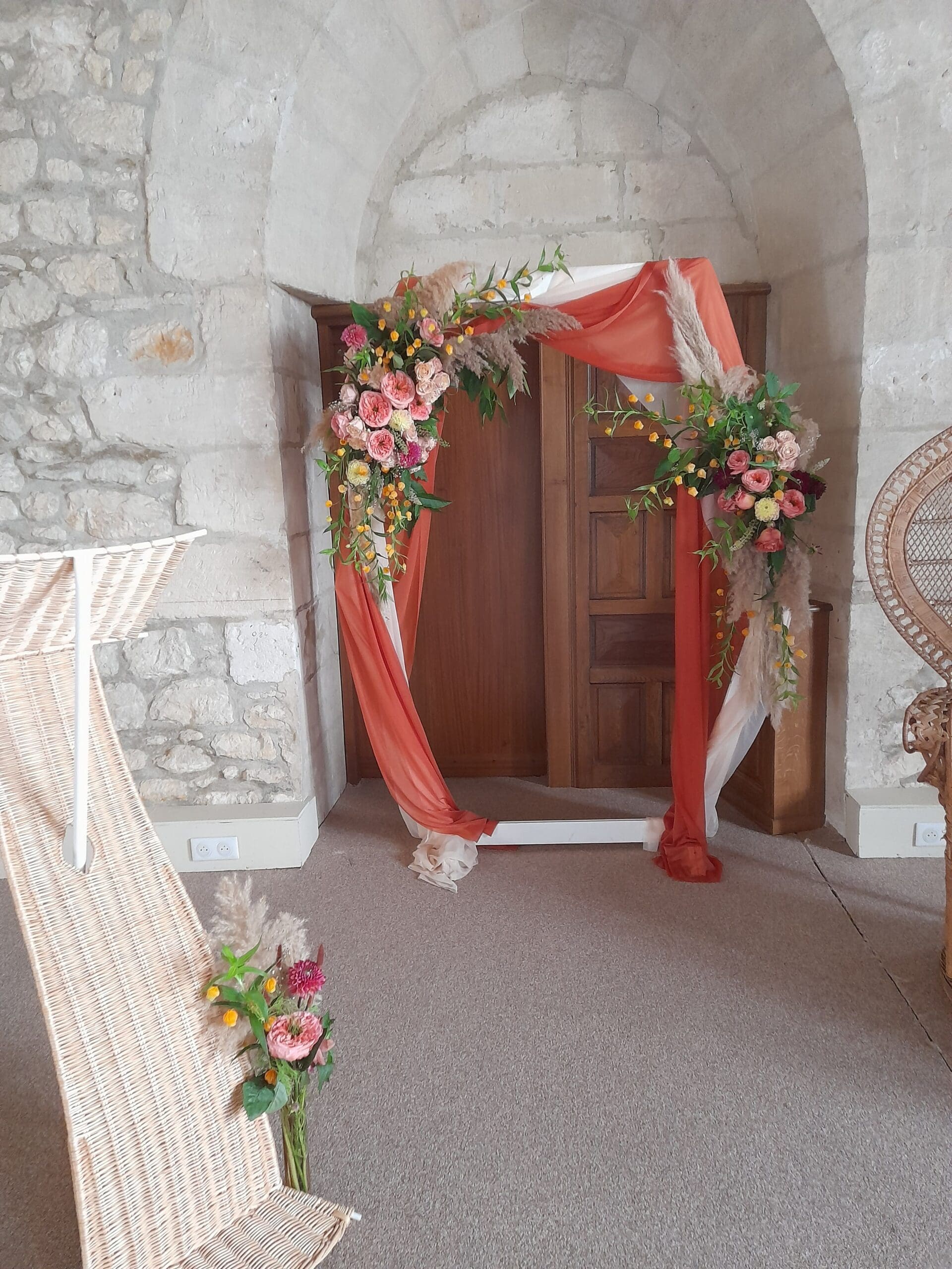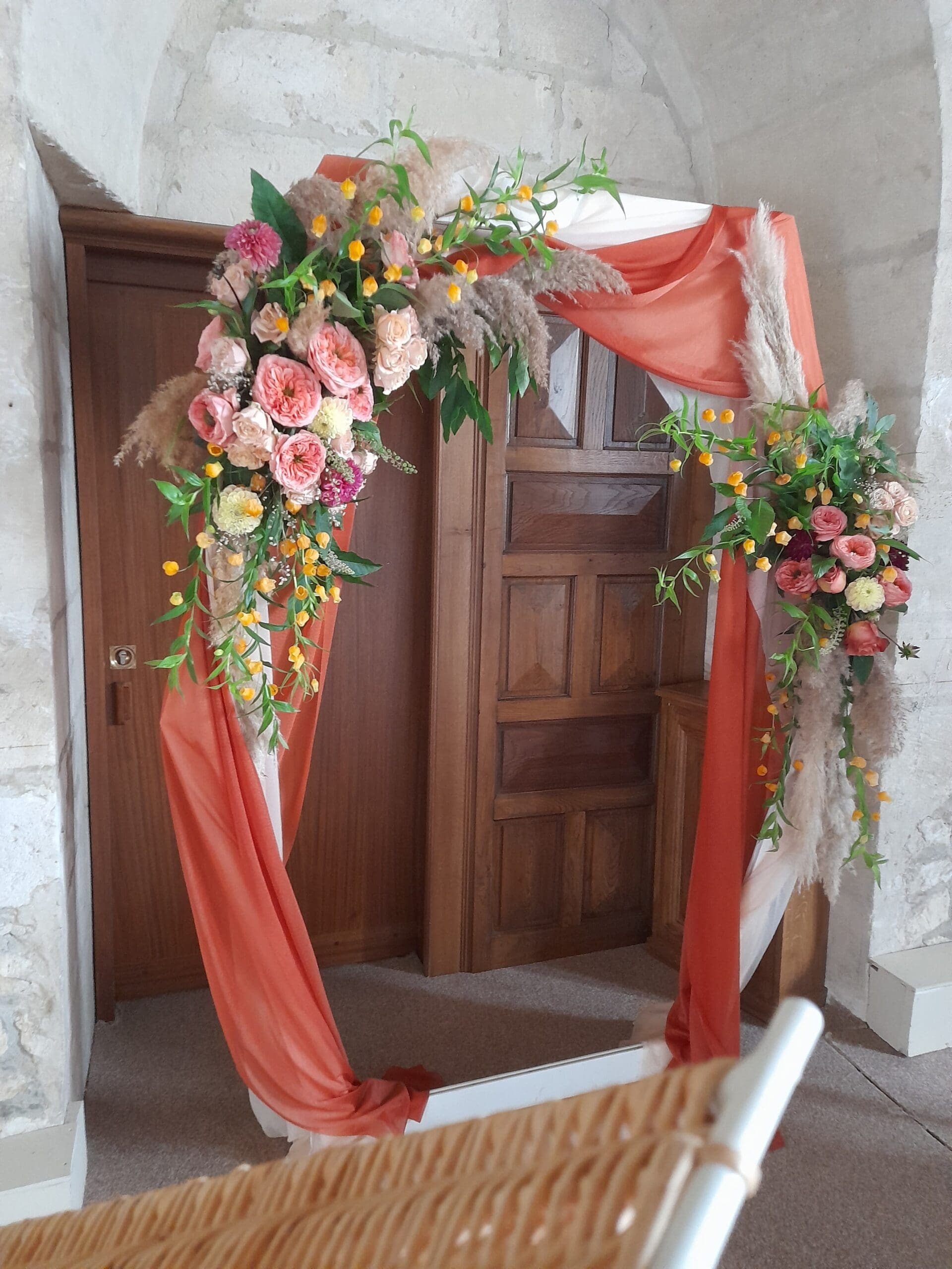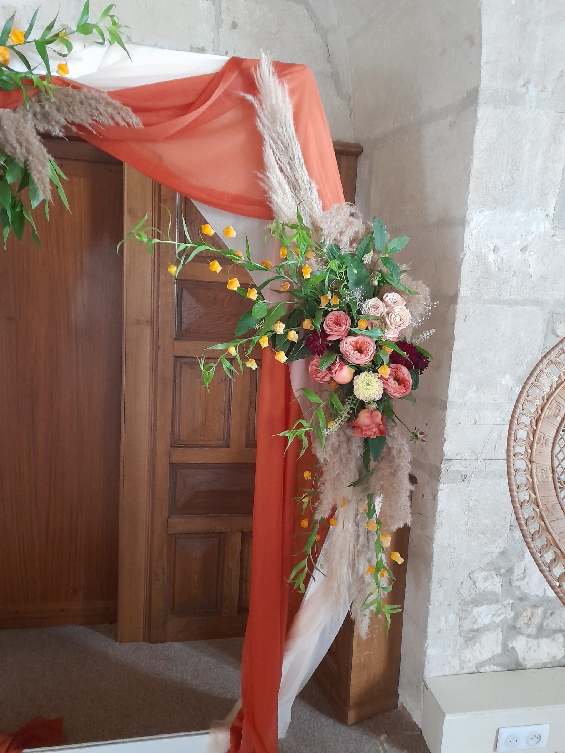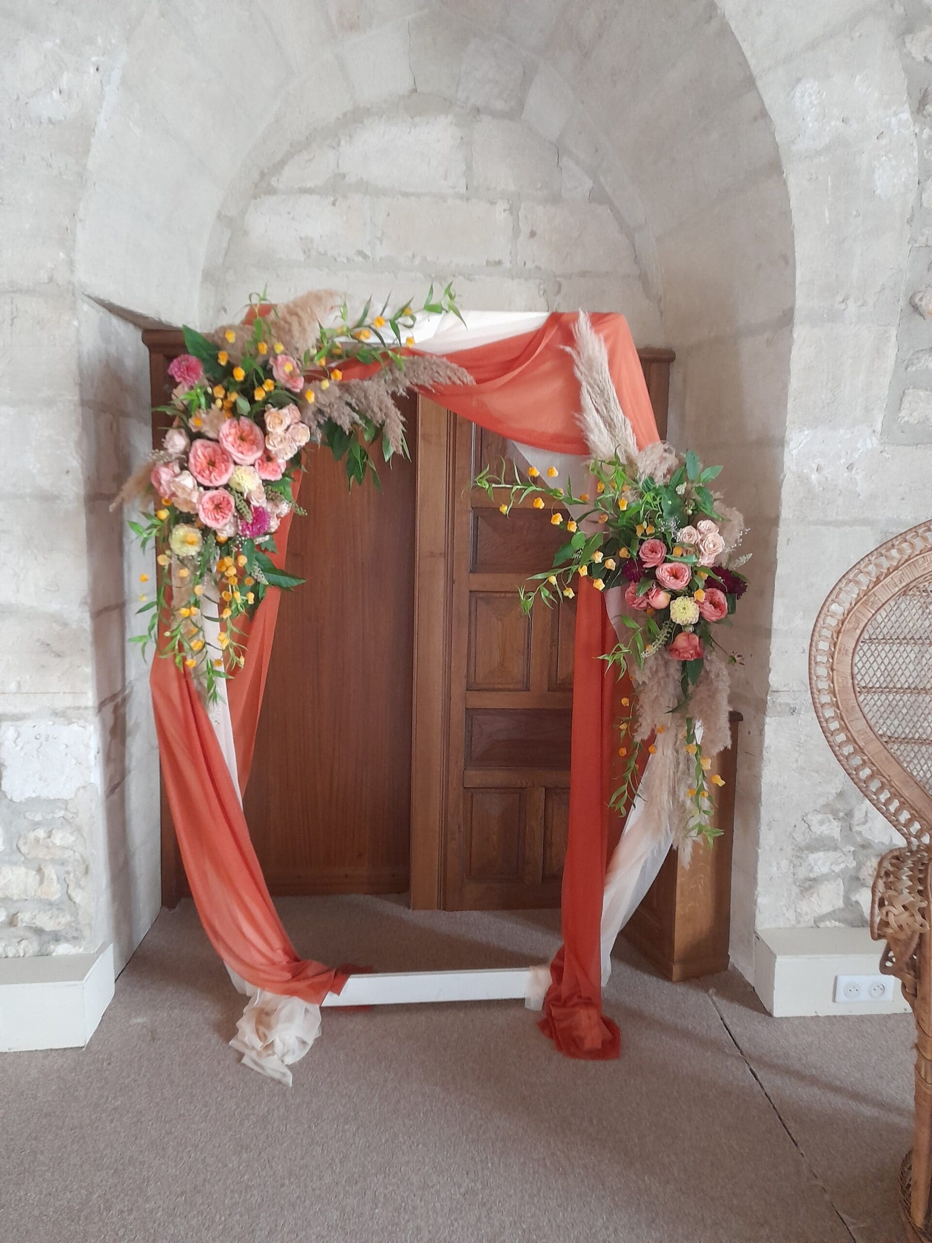 Arche blanche habillés de fleurs sur le thème bohème chic, terra cotta, orange, chocolat, pêche, possibilité de le réalisé dans toutes les couleurs de votre mariage, prix indiqué pour le fleurissent présenté, arche et voilage en location inclus, installation et démontage non inclus