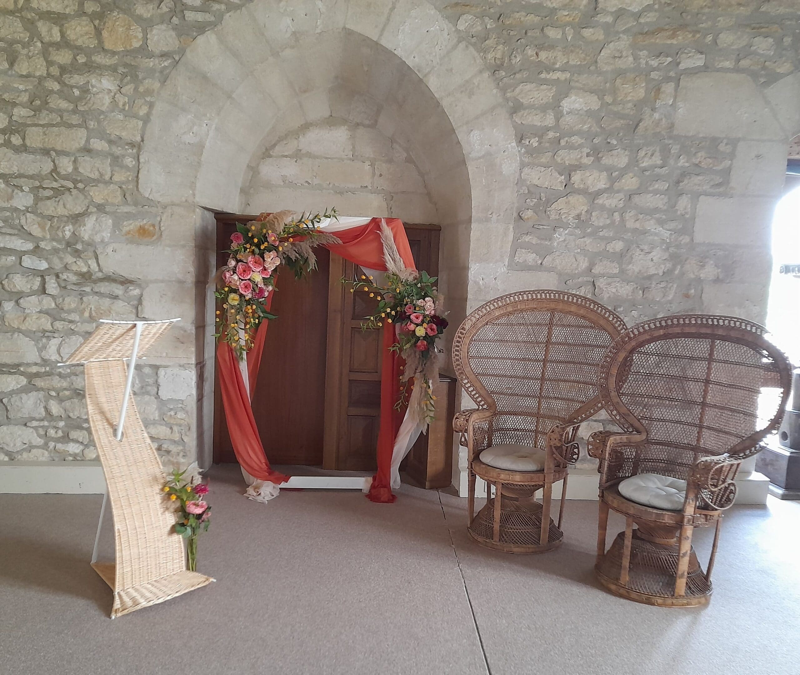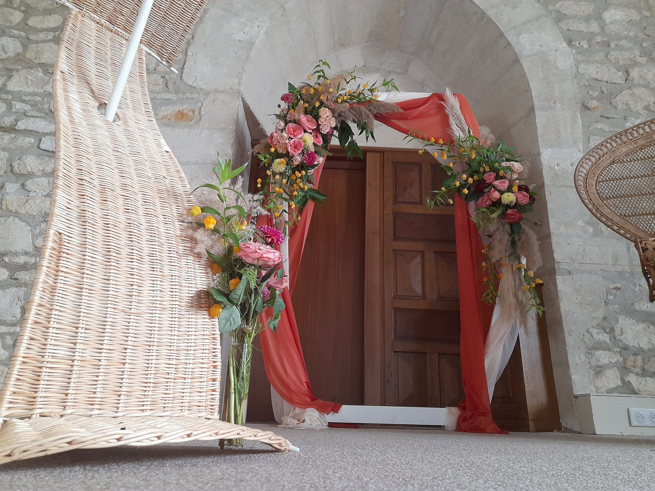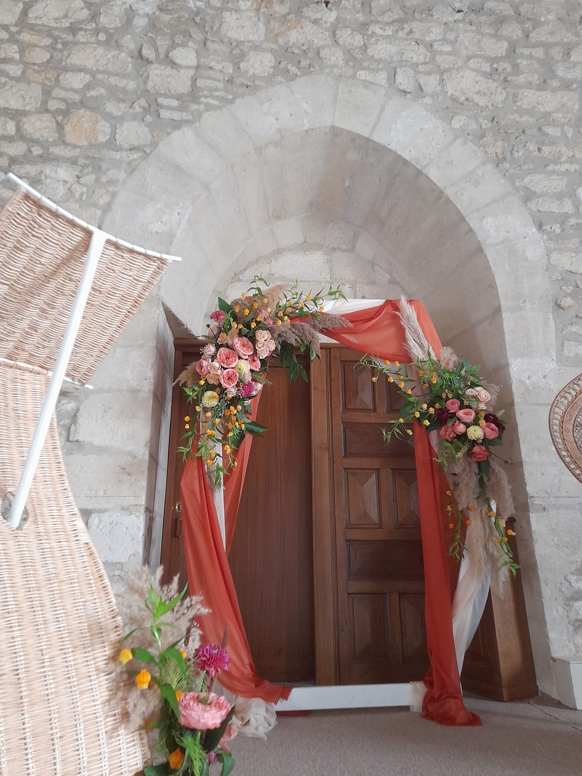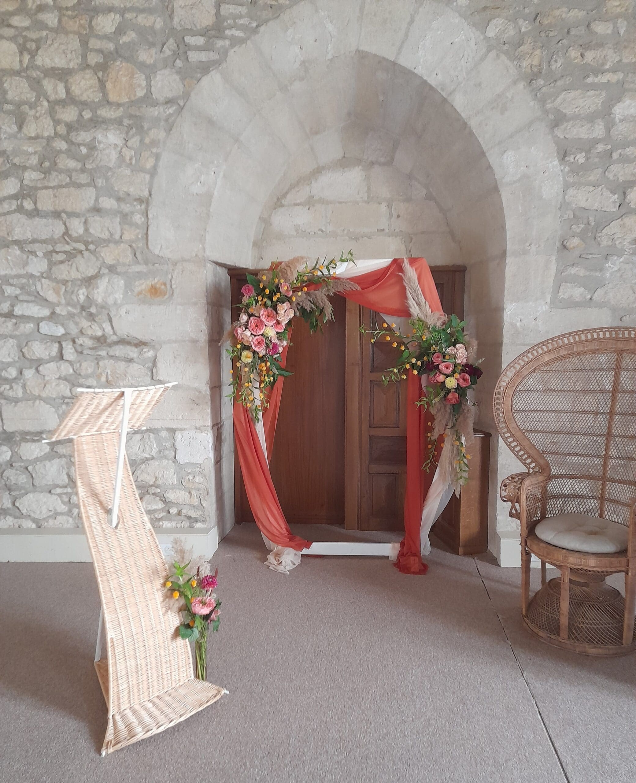 Arche blanche habillés de fleurs sur le thème bohème chic, terra cotta, orange, chocolat, pêche, possibilité de le réalisé dans toutes les couleurs de votre mariage, prix indiqué pour le fleurissent présenté, arche et voilage en location inclus, installation et démontage non inclus