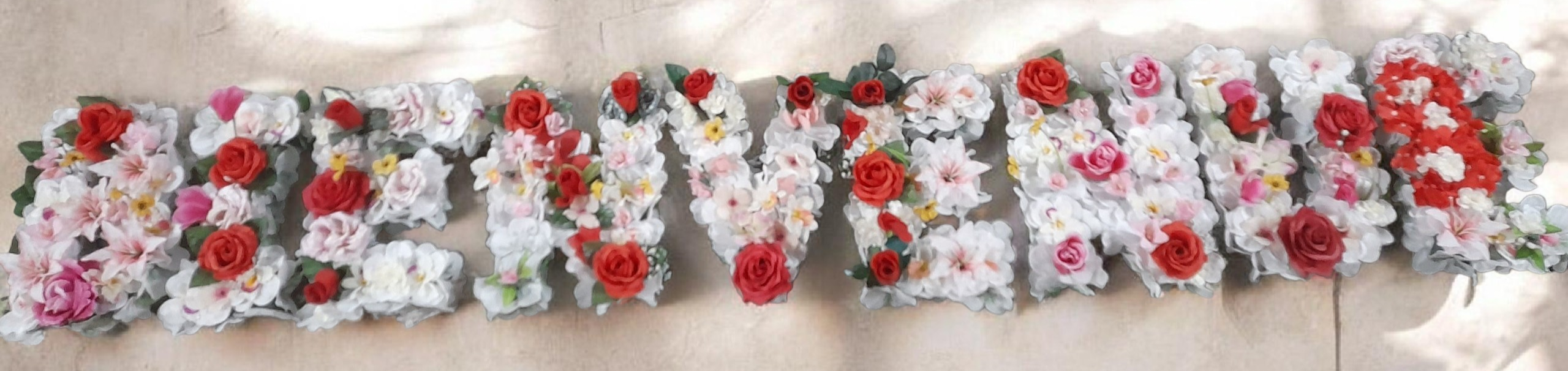 Envie de changer du panneau d’accueil traditionnel; Découvrez notre BIENVENUE qui donnera à vos invités une belle envie de découvrir votre lieu de réception ; lettres recouvertes de fleurs en tissus aux couleurs mélangez pour un panneau original qui s’adapte à toutes les ambiance ; prix indiqué pour une location sur deux jours installation et démontage non inclus