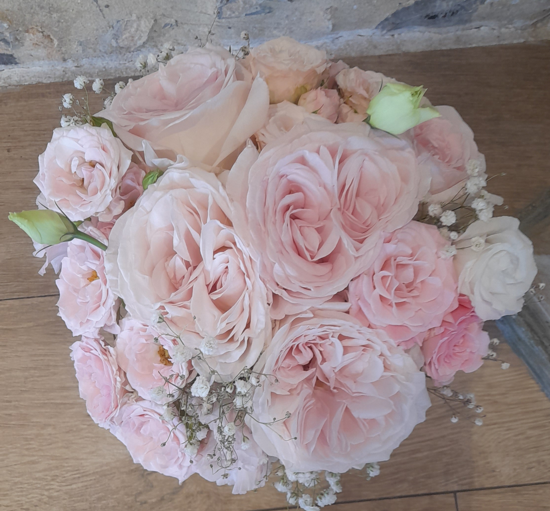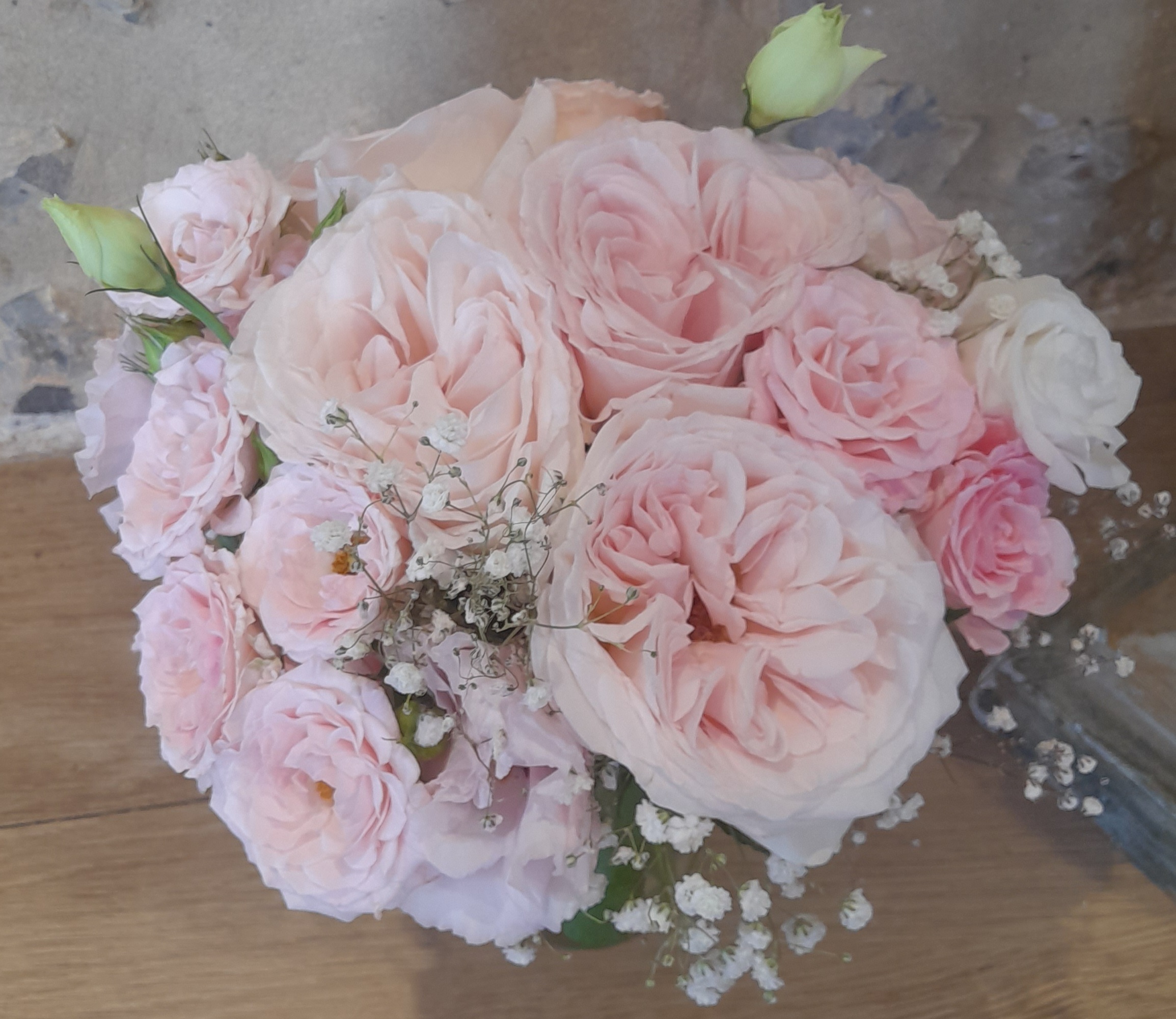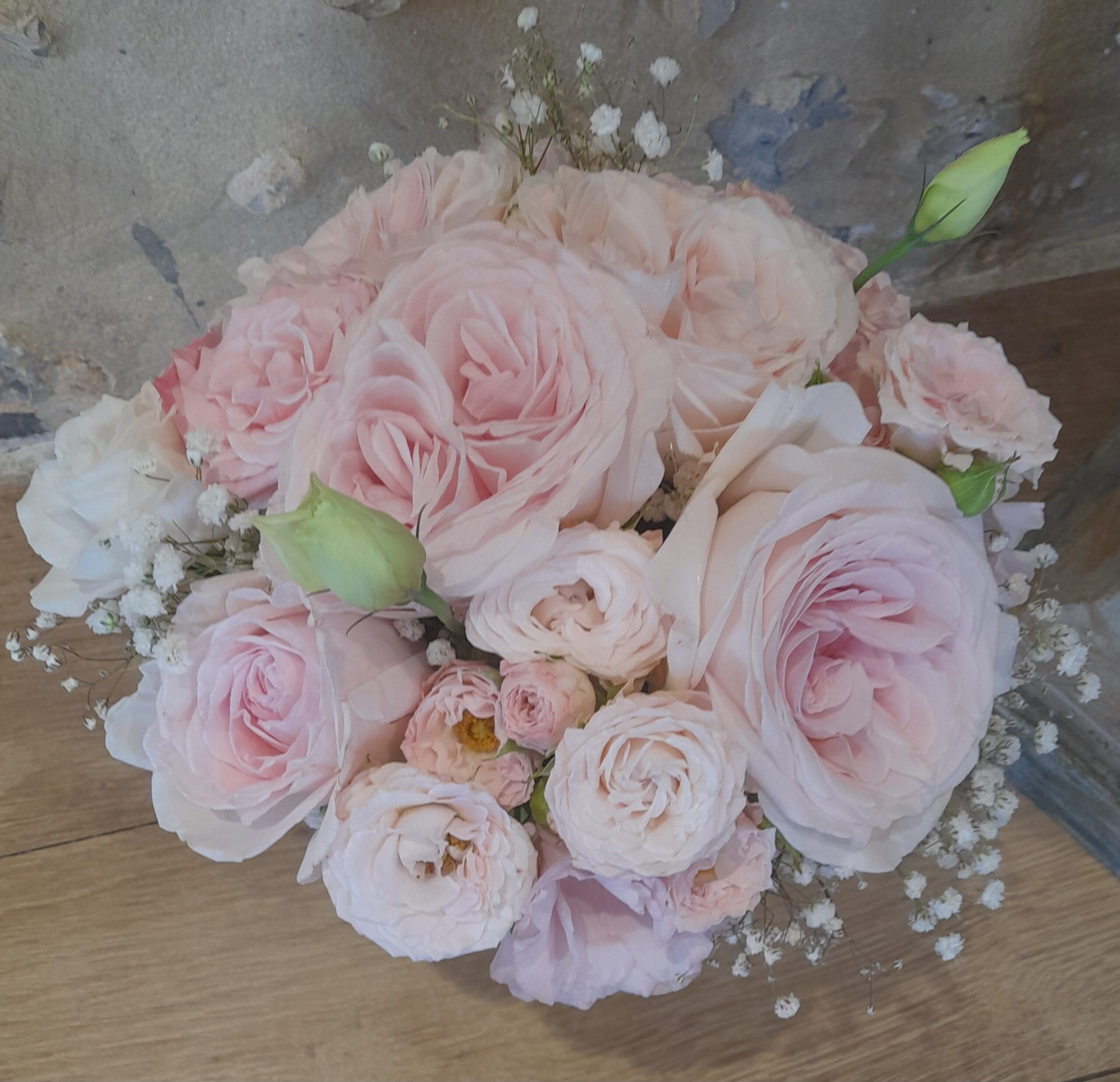 Magnifique bouquet rond composé de roses de jardin, de rose branchue et fleurs de saison,