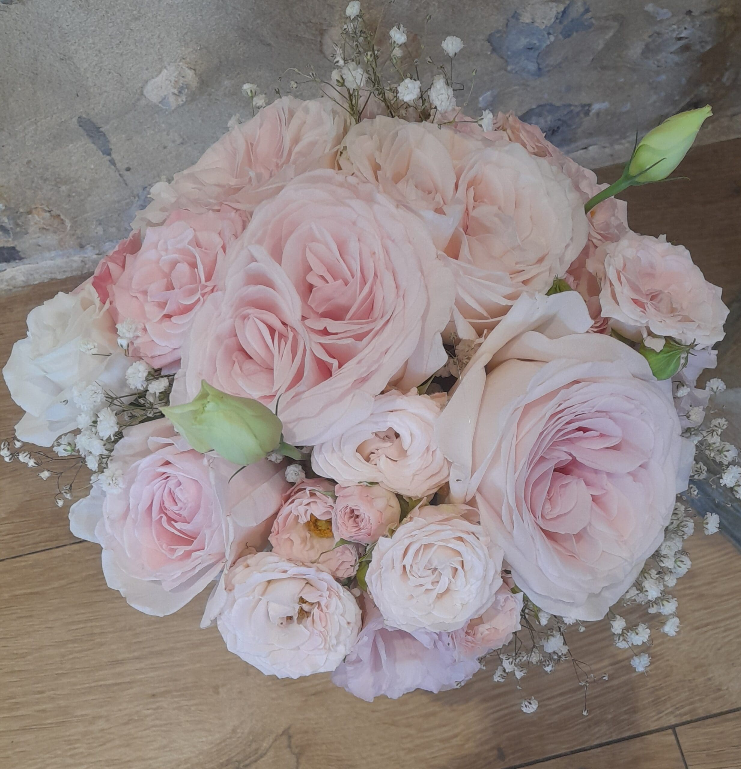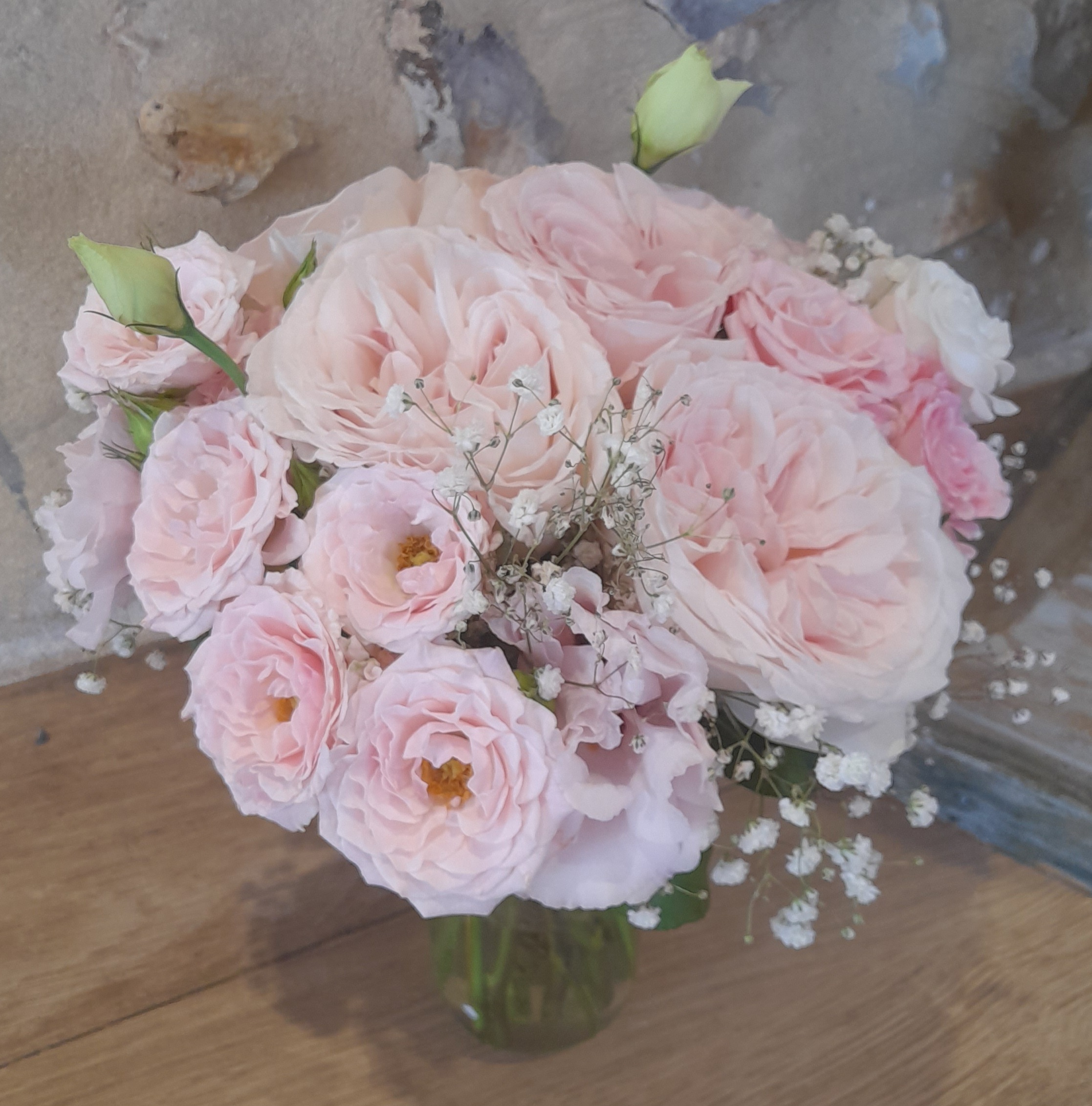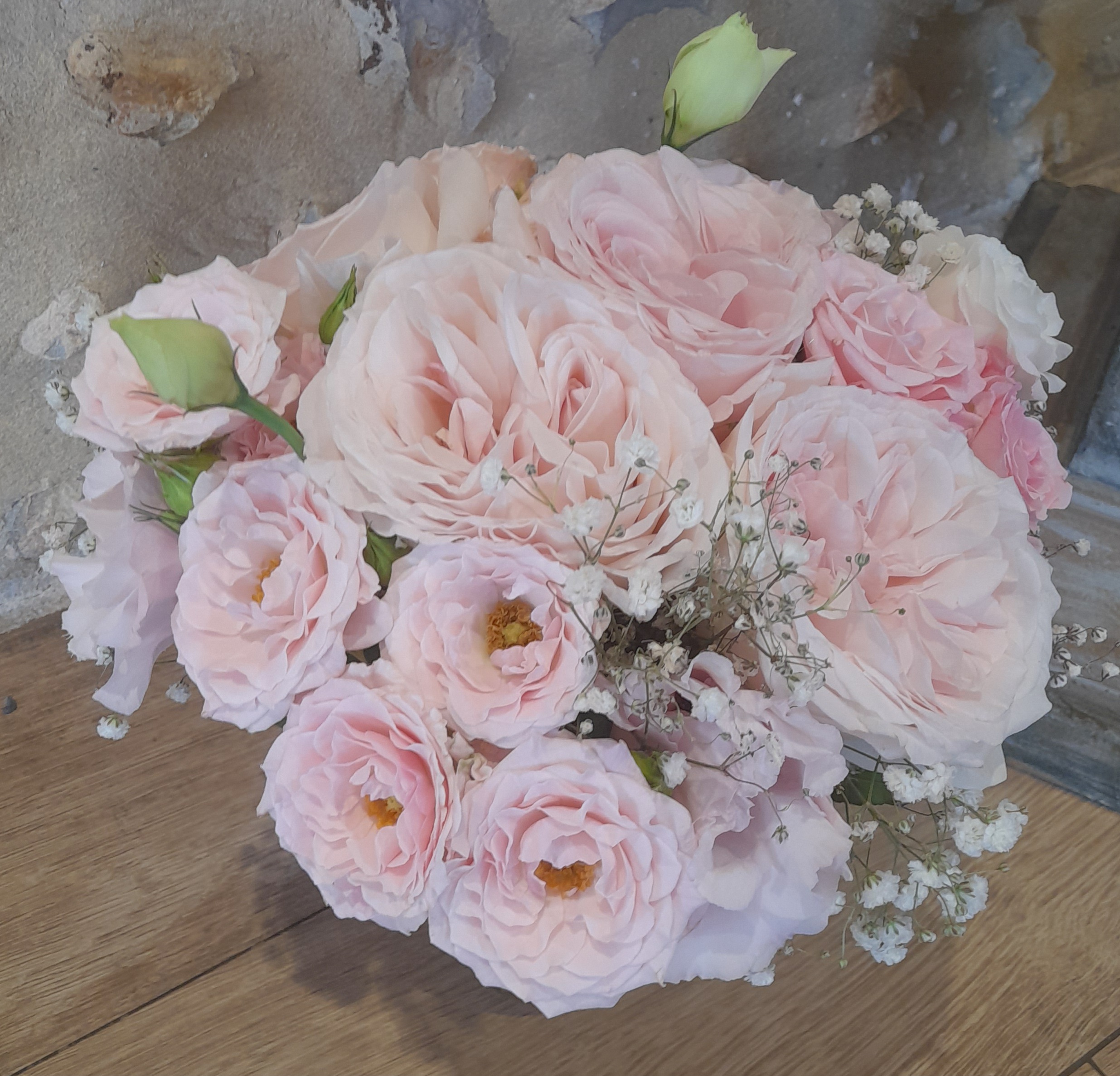 Magnifique bouquet rond composé de roses de jardin, de rose branchue et fleurs de saison,