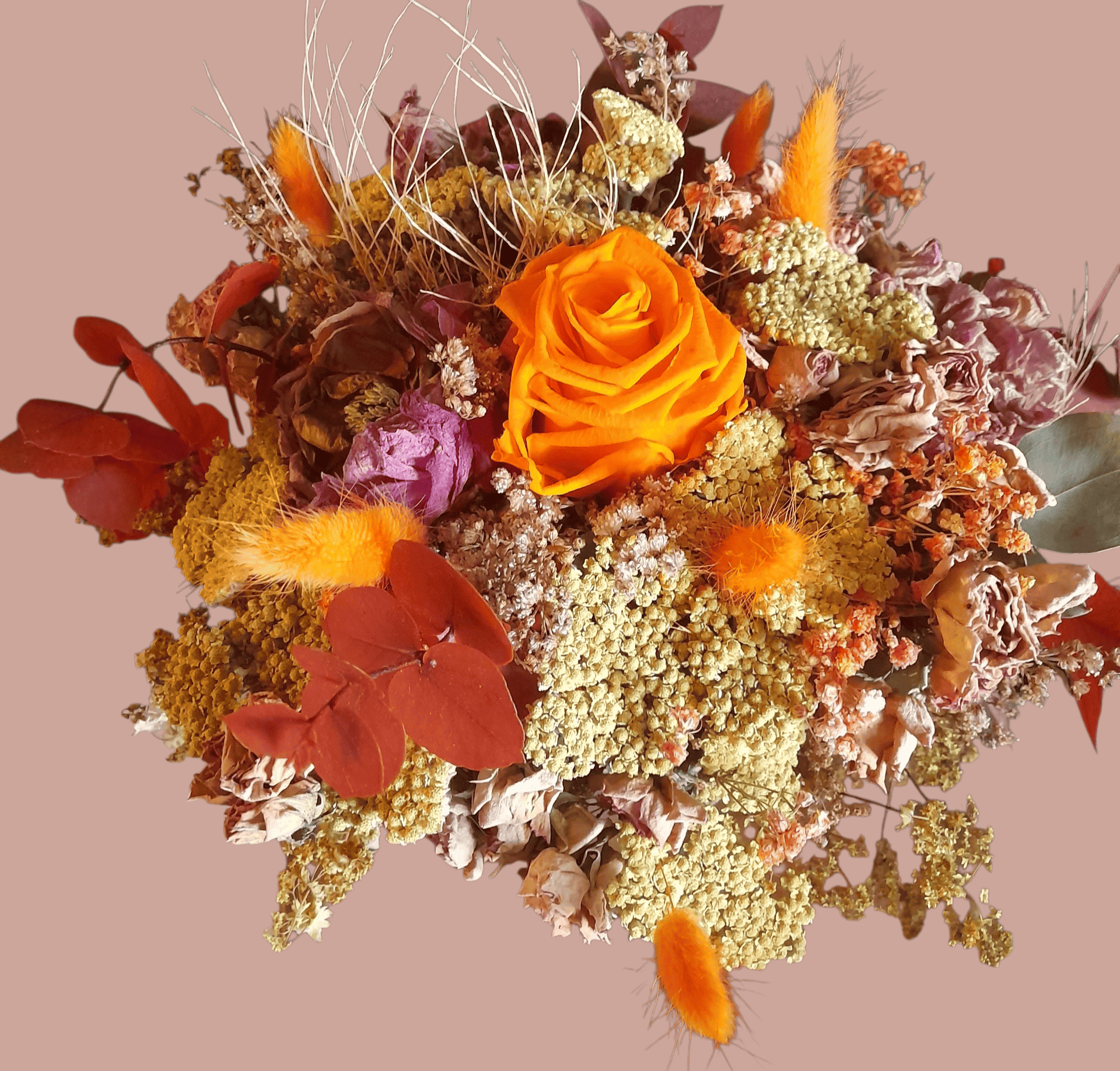 Bouquet de mariée composé de fleurs séchées naturellement , d’une rose stabilisé et de pivoine séchées; roses branchues séchées ;de feuillage et fleurs jaune pour un résultat peps et dynamique ;
