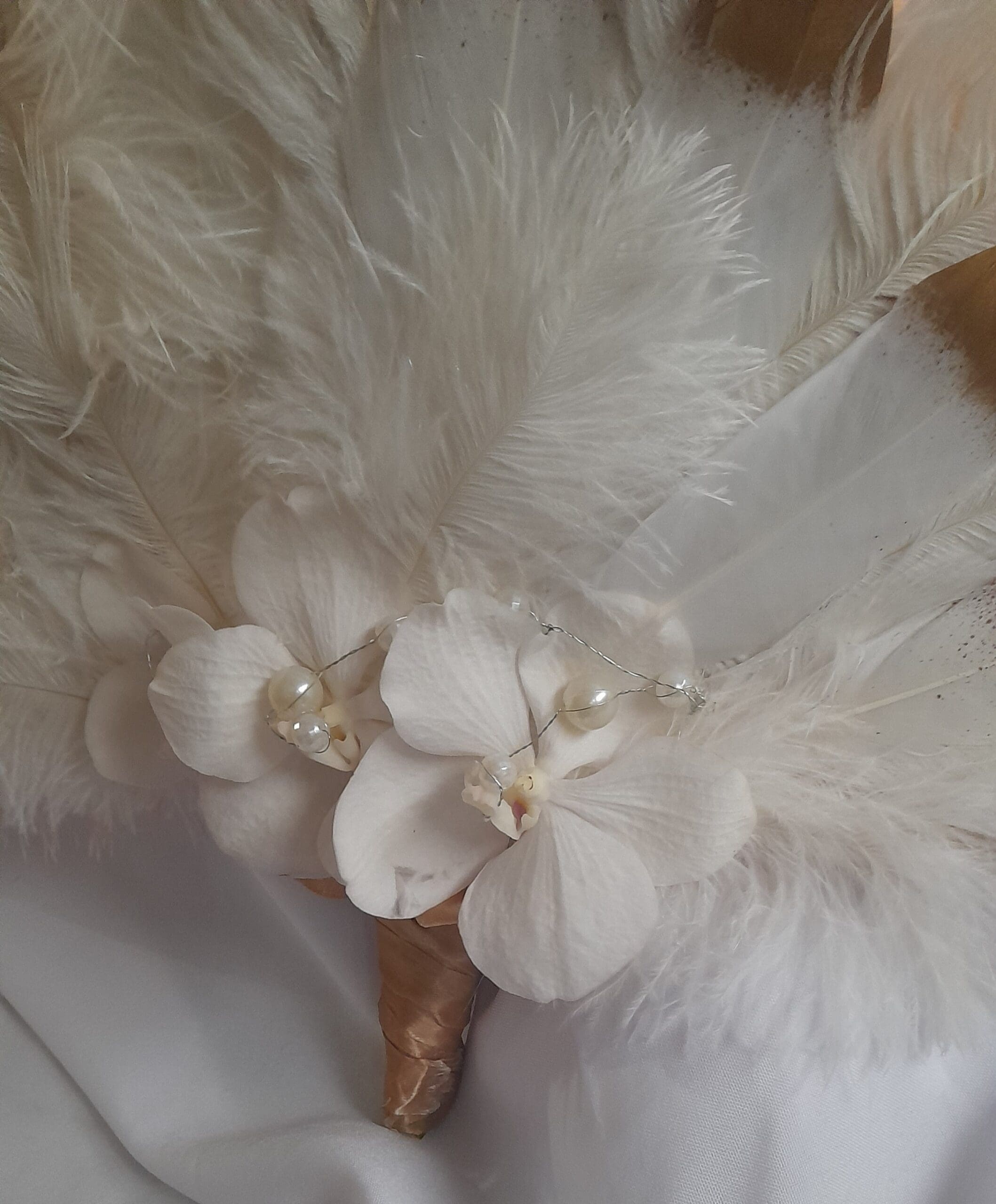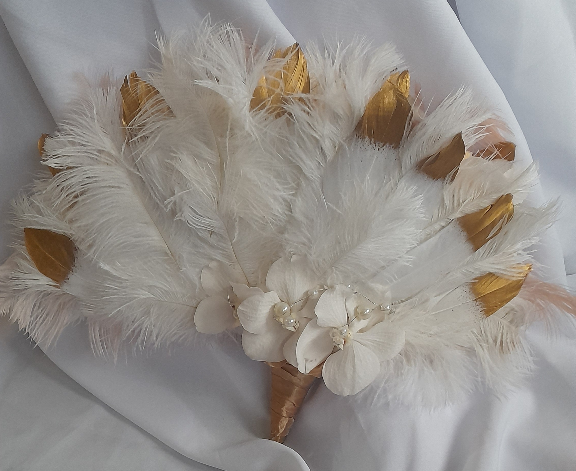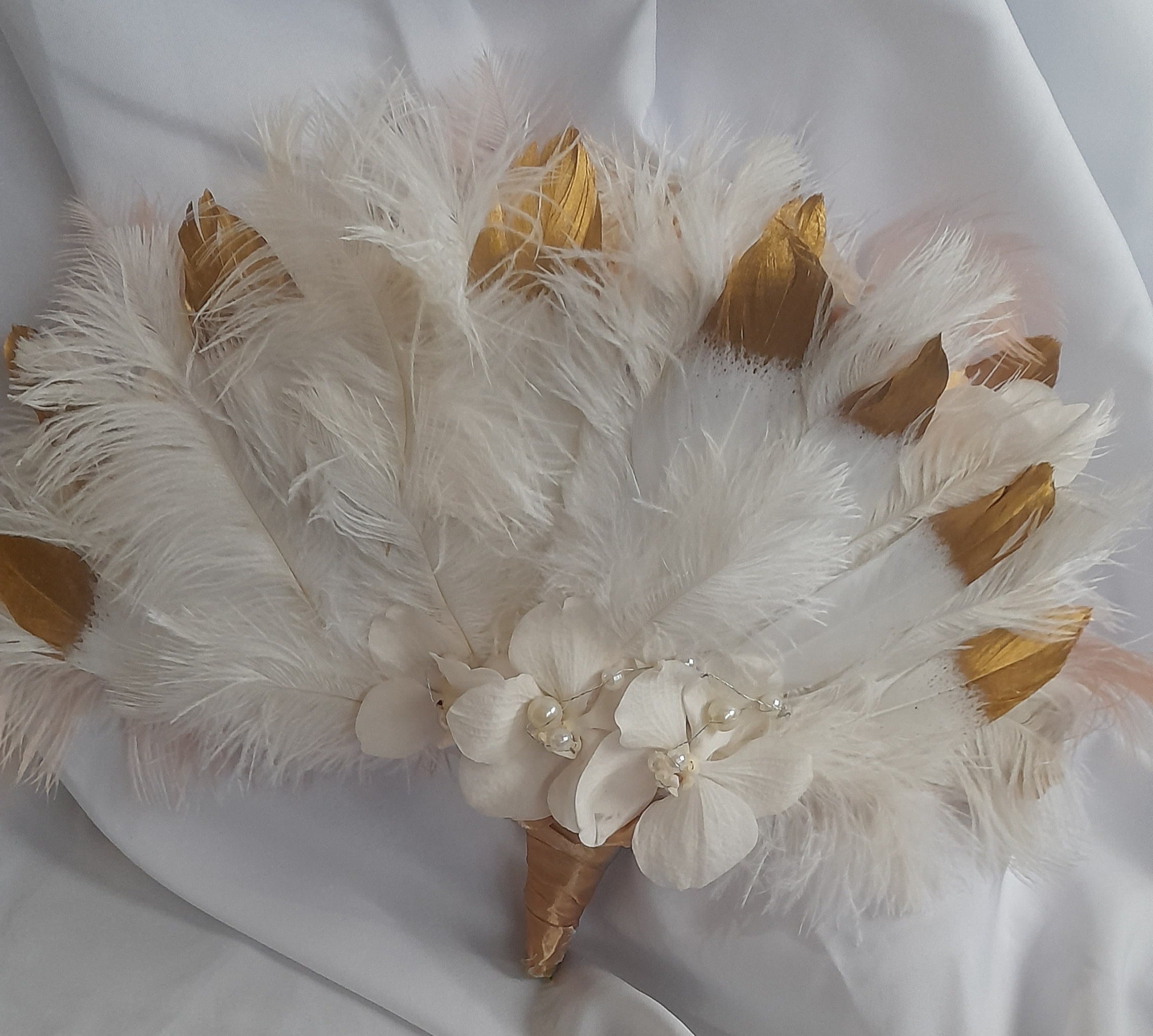 Magnifique création de bouquet éventail avec plume et fleurs naturelles