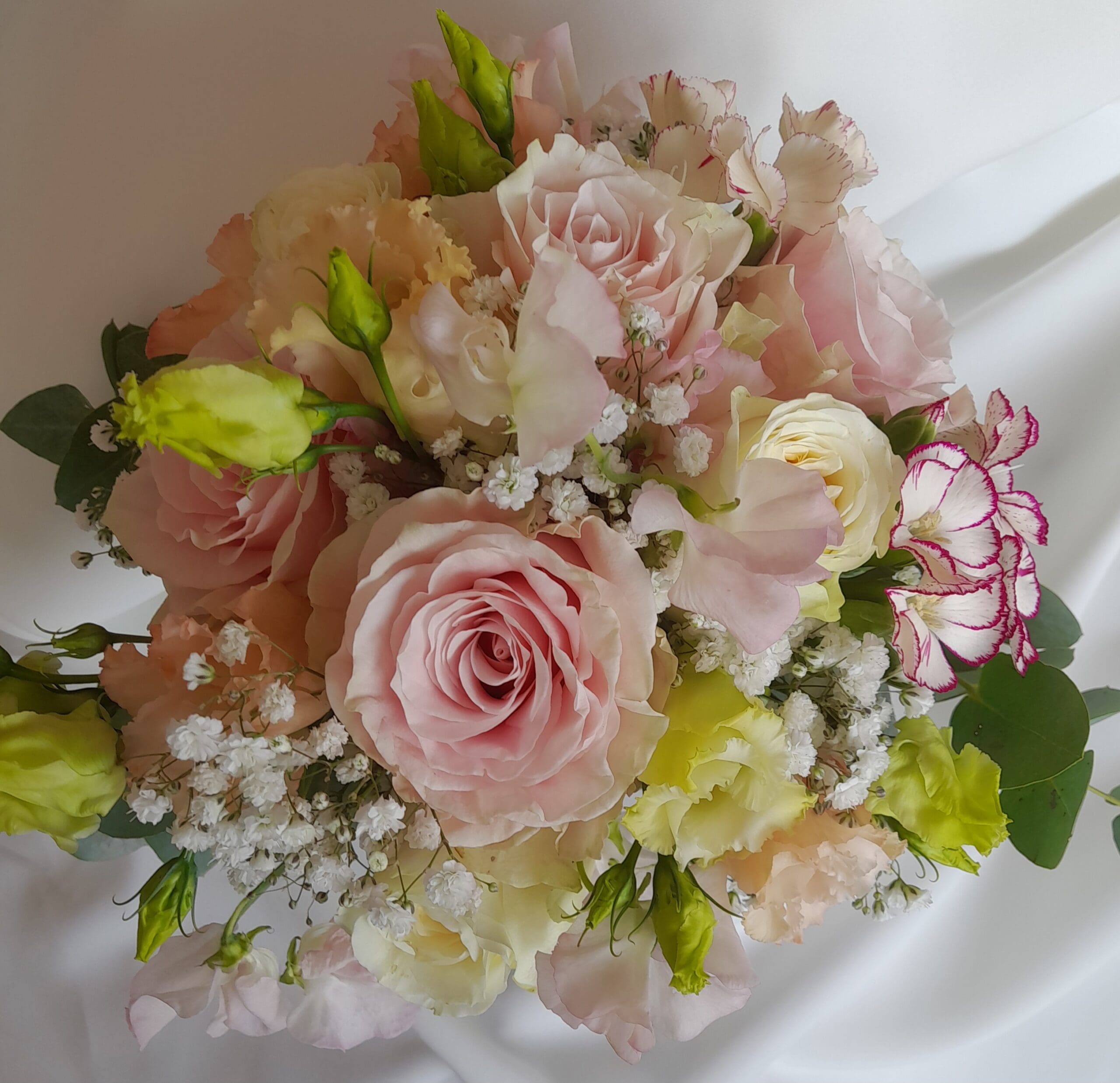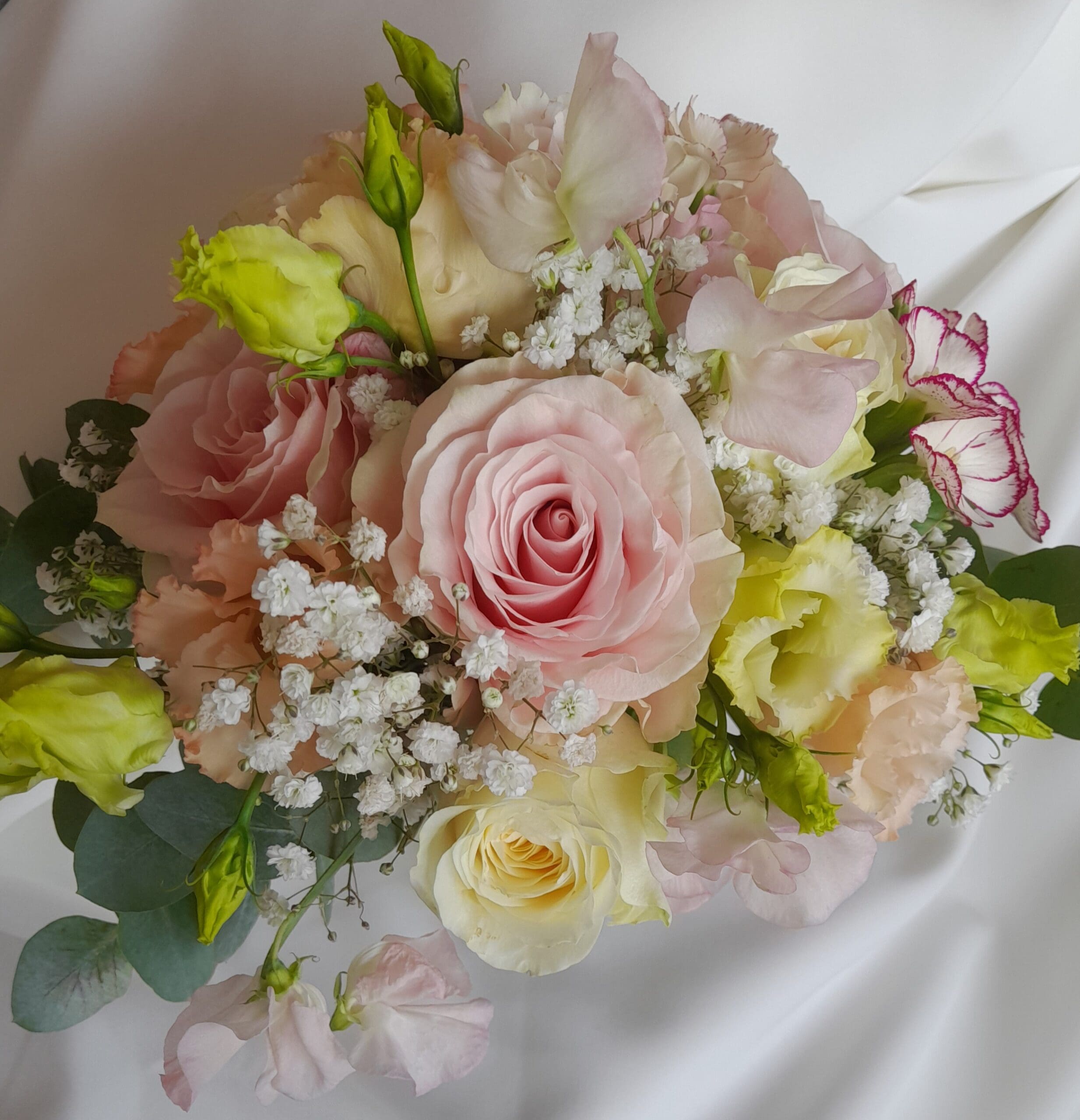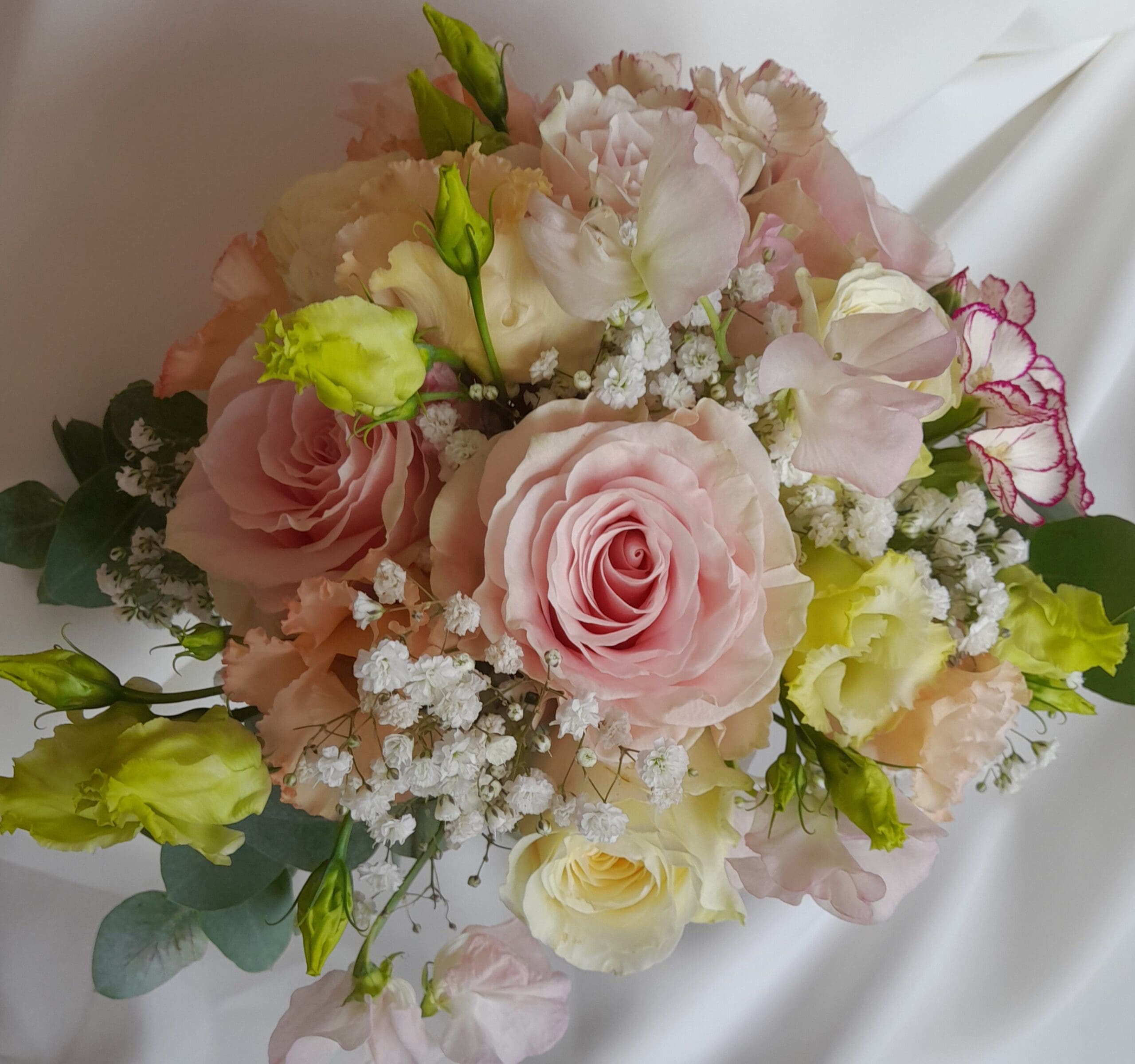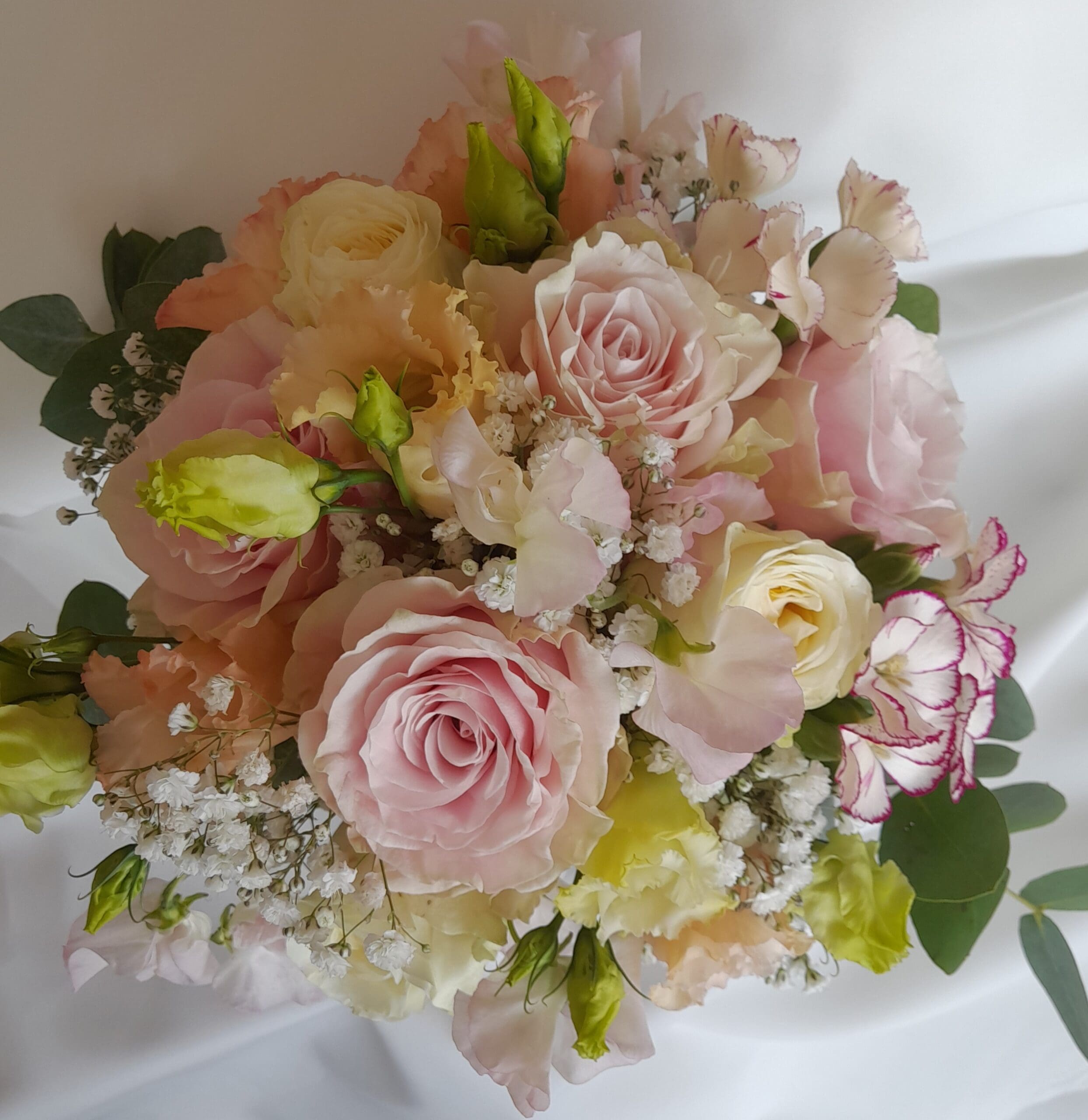 Bouquet de mariée rond classique composé de roses peche et roses lysianthus et fleurs de saison