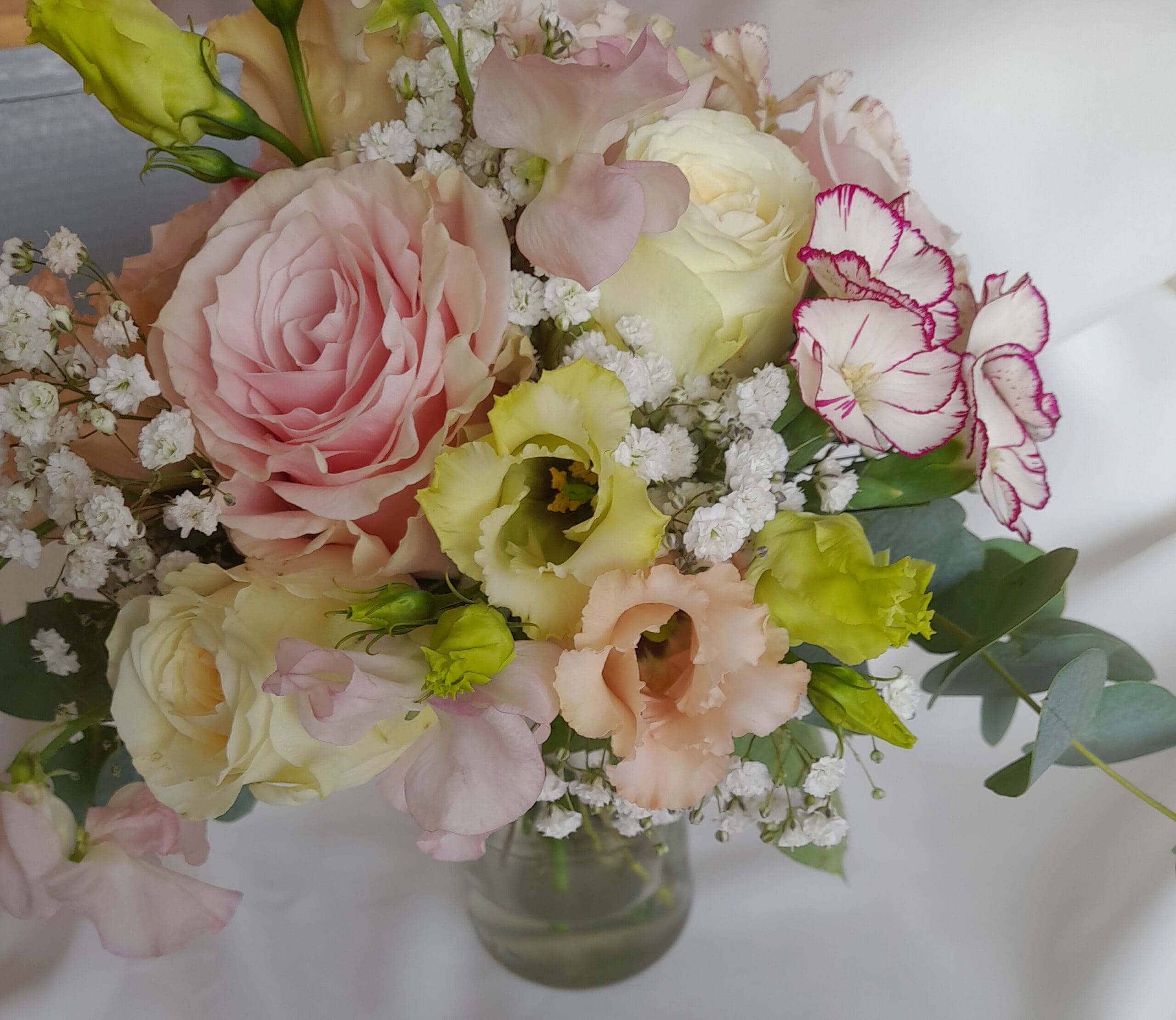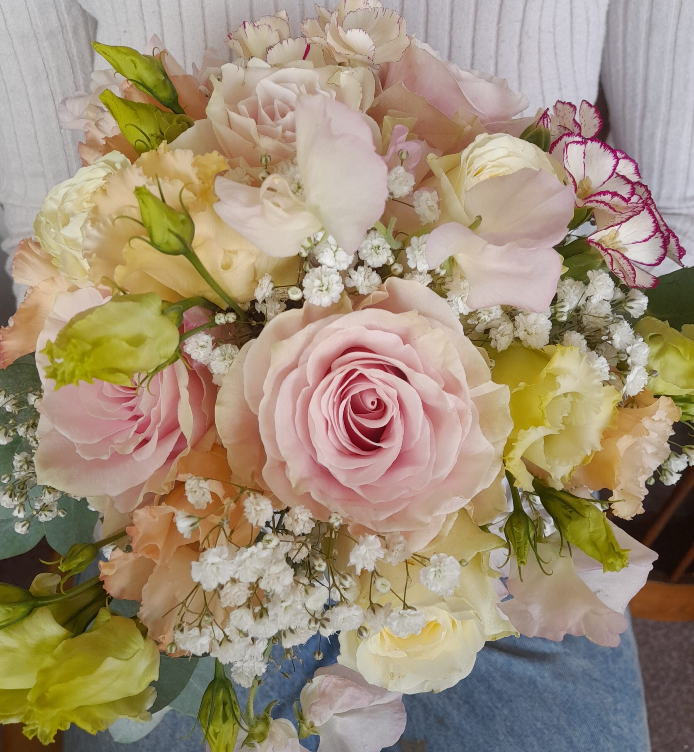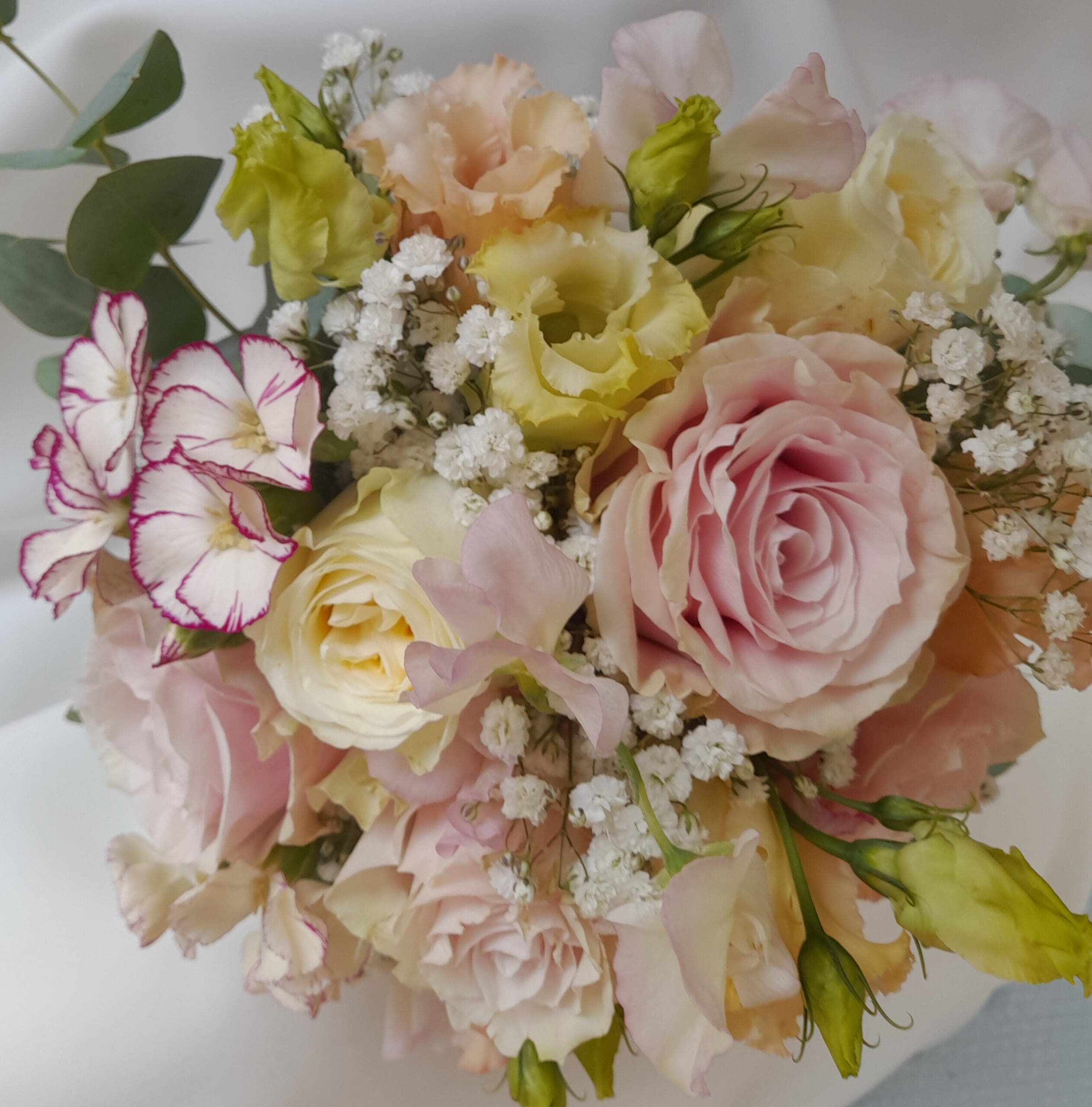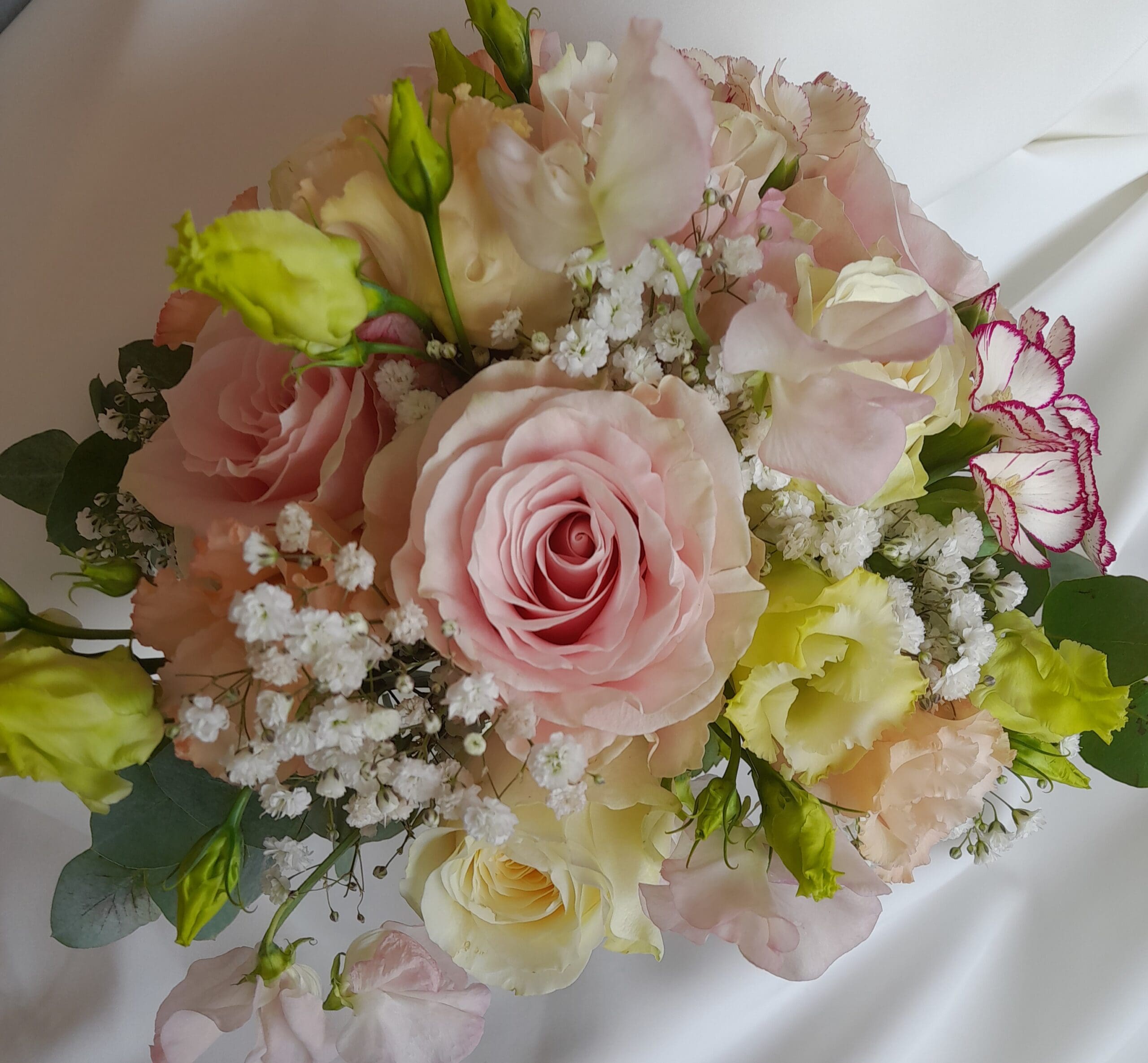 Bouquet de mariée rond classique composé de roses peche et roses lysianthus et fleurs de saison