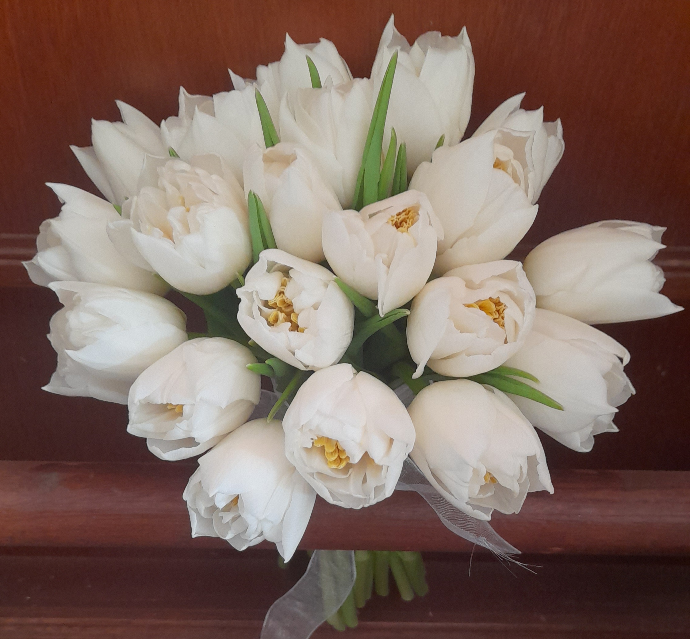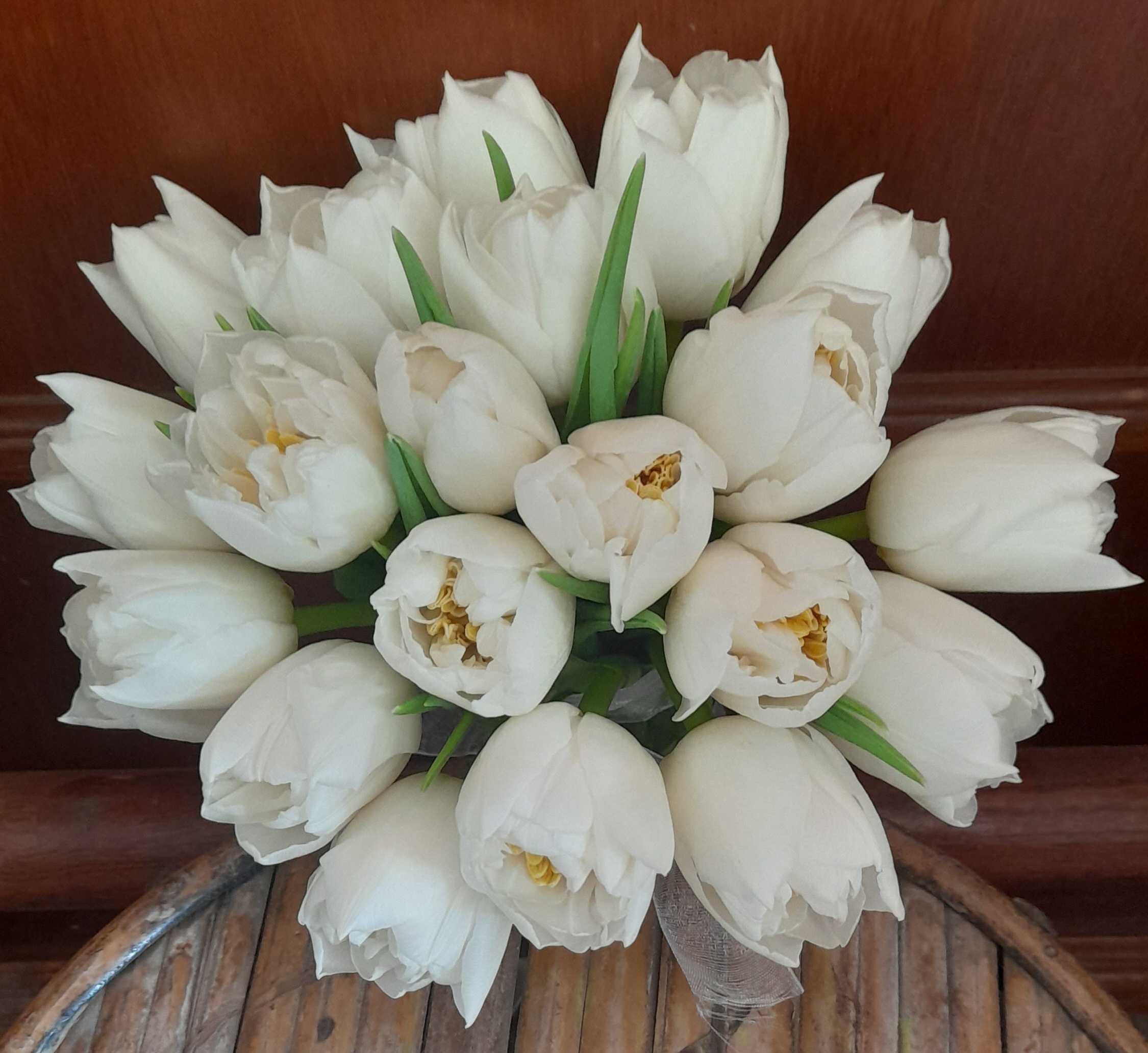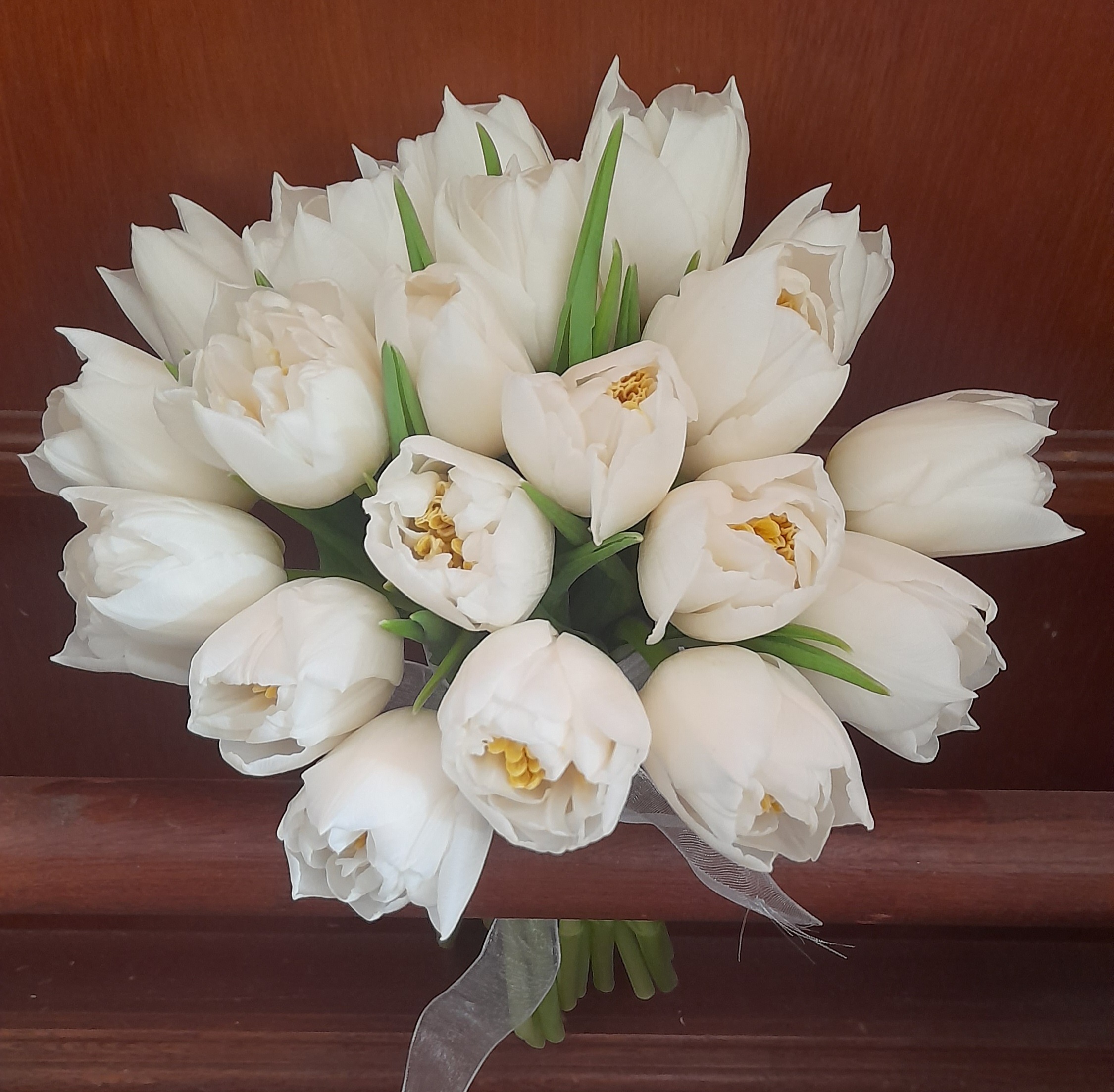 Bouquet de mariée uniquement composé de tulipes, un bouquet rond sobre et délicat,