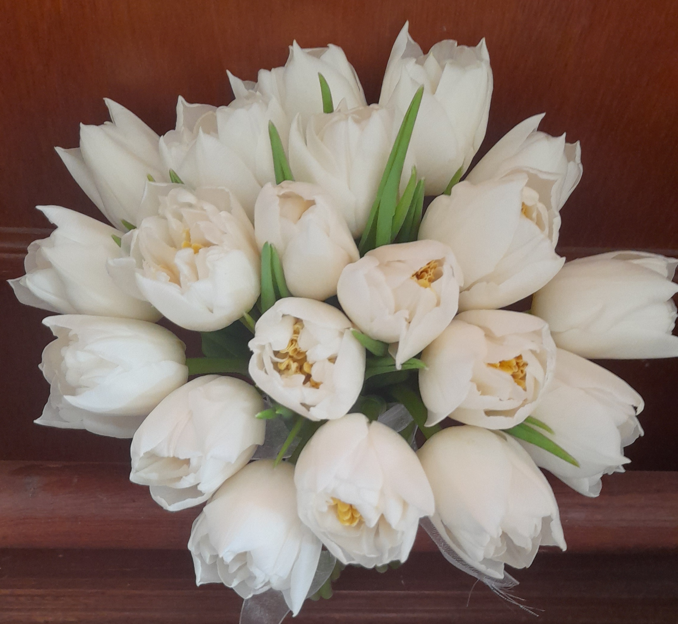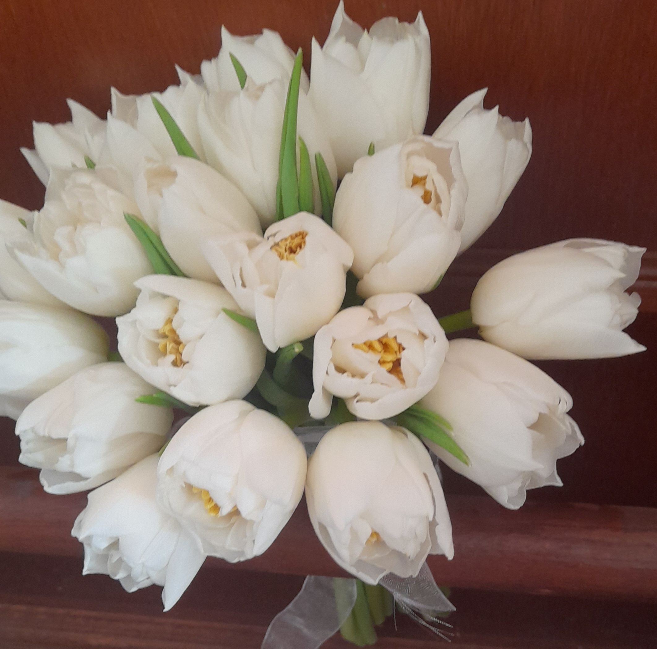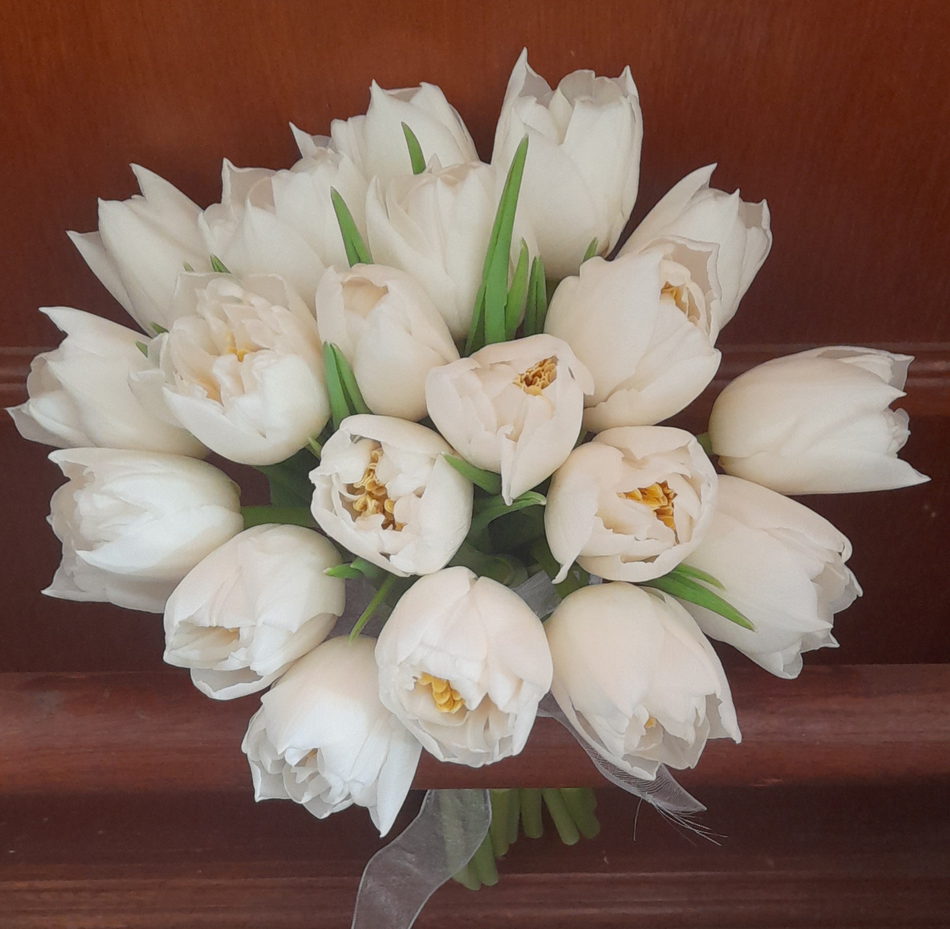 Bouquet de mariée uniquement composé de tulipes, un bouquet rond sobre et délicat,
