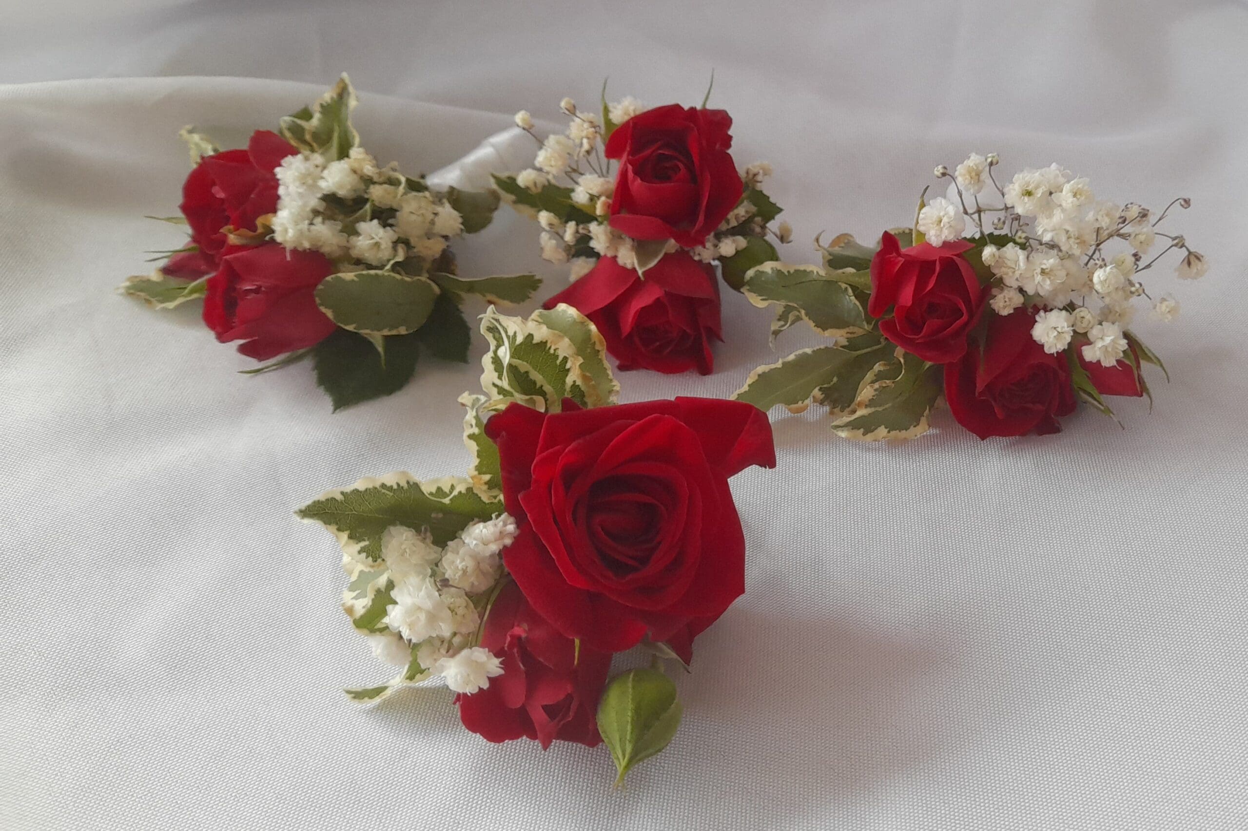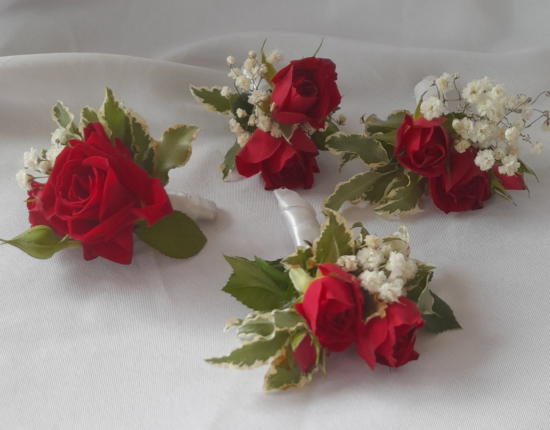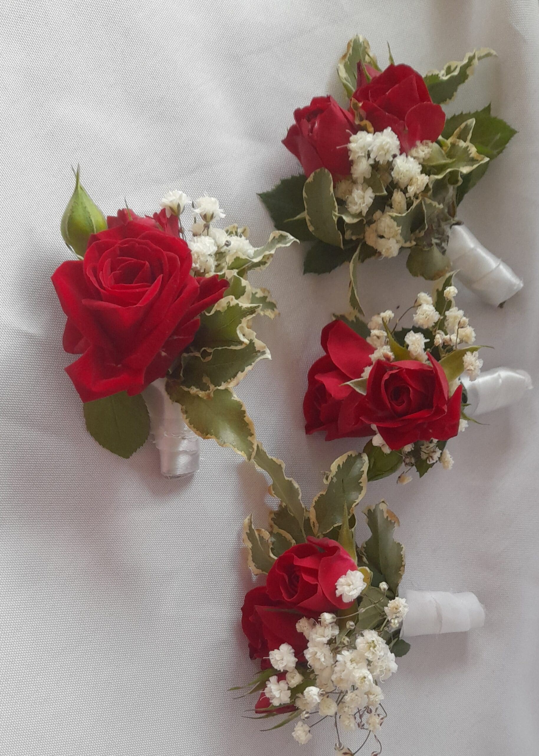 Boutonnière assortie au bouquet de mariée et ses Boutonnière de témoins assorties