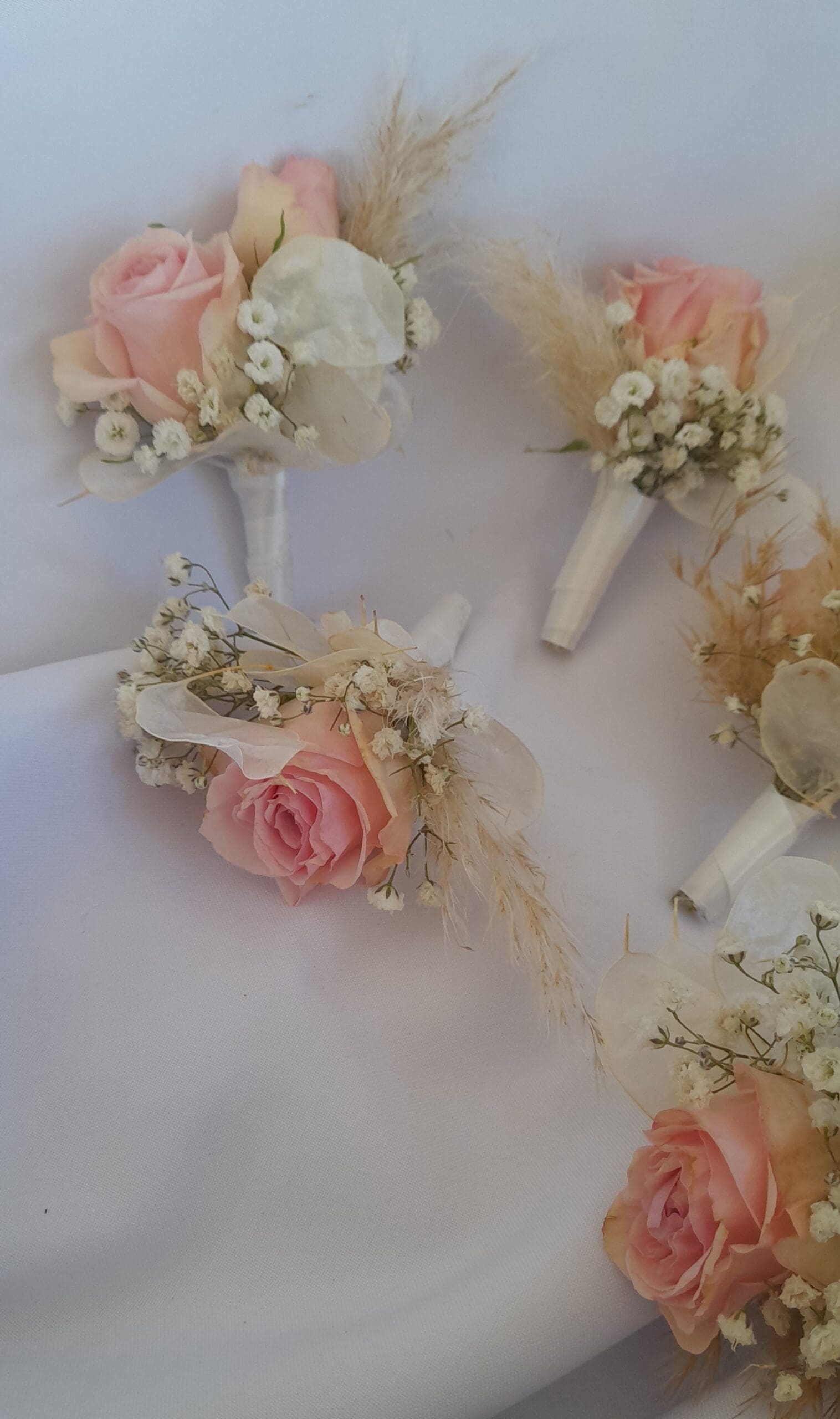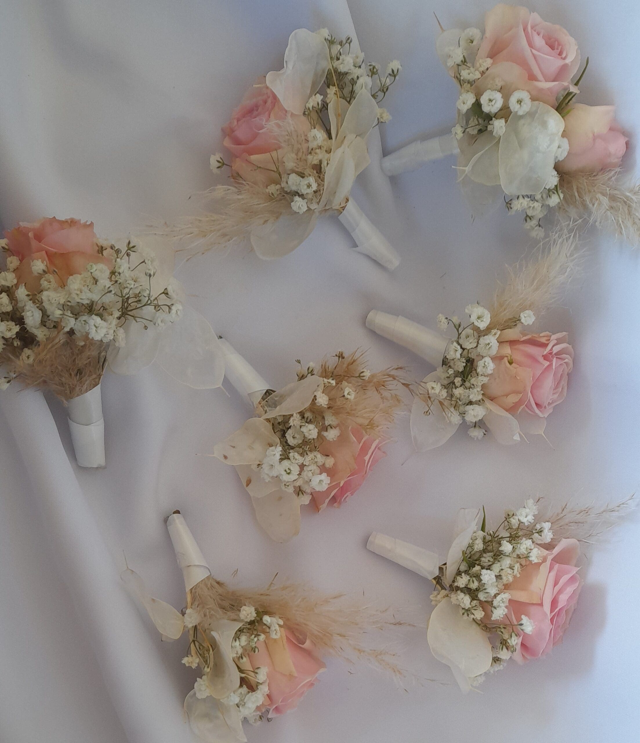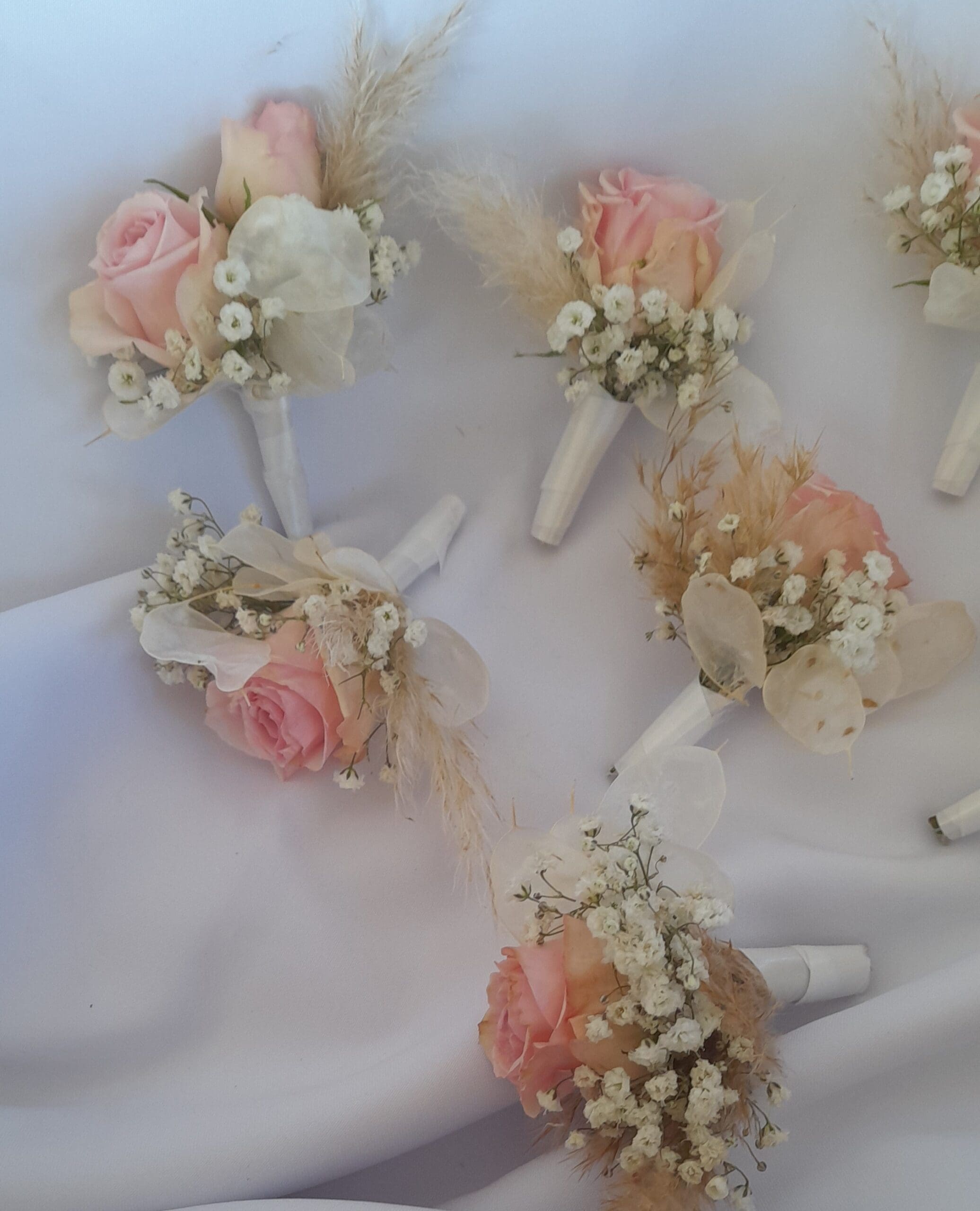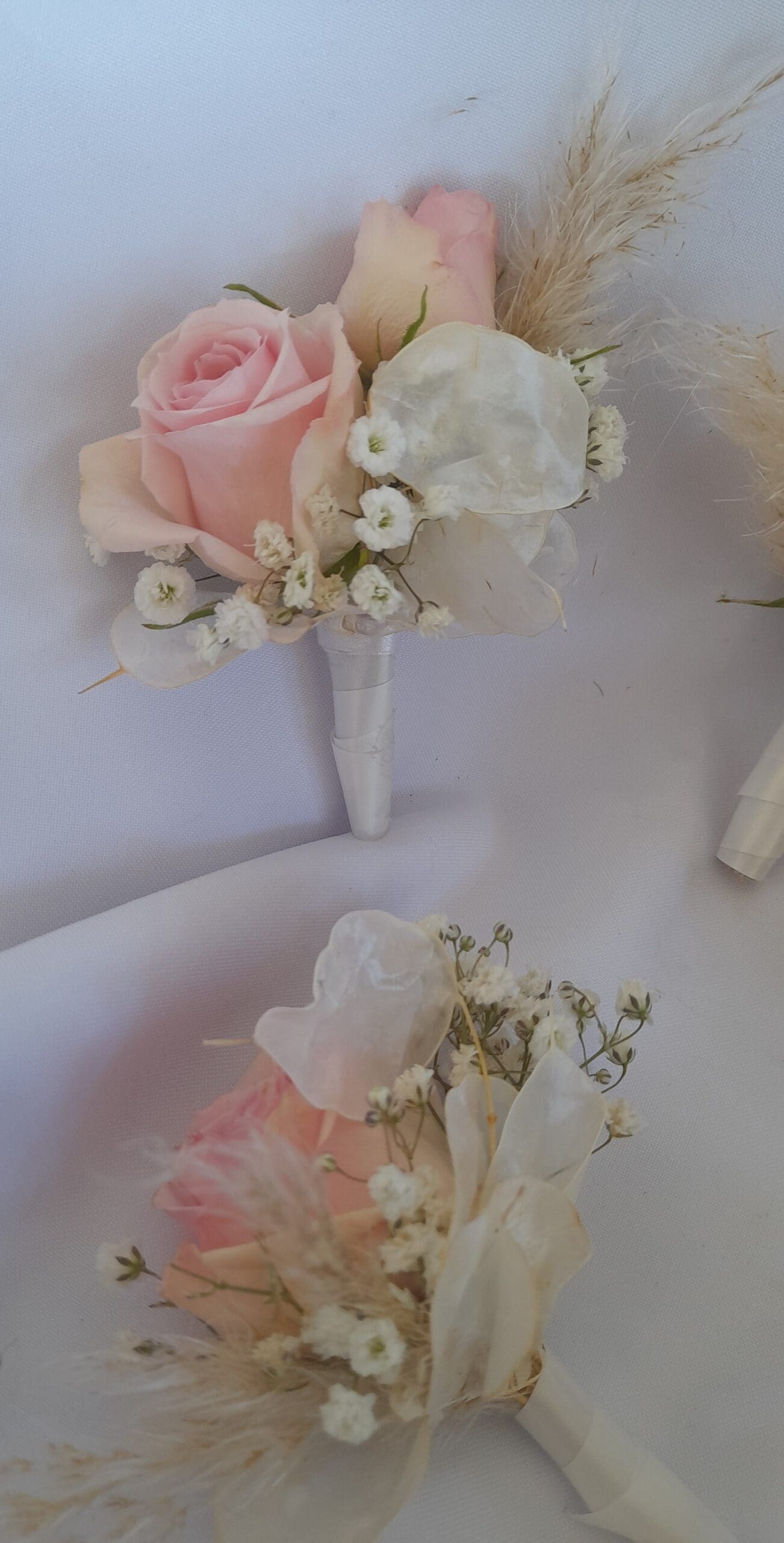 Boutonnière assortie au bouquet de mariée composé de roses et de fleurs séchées