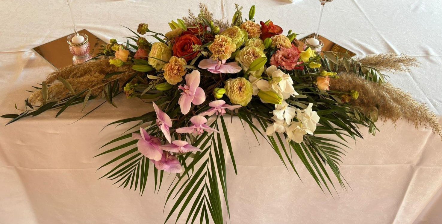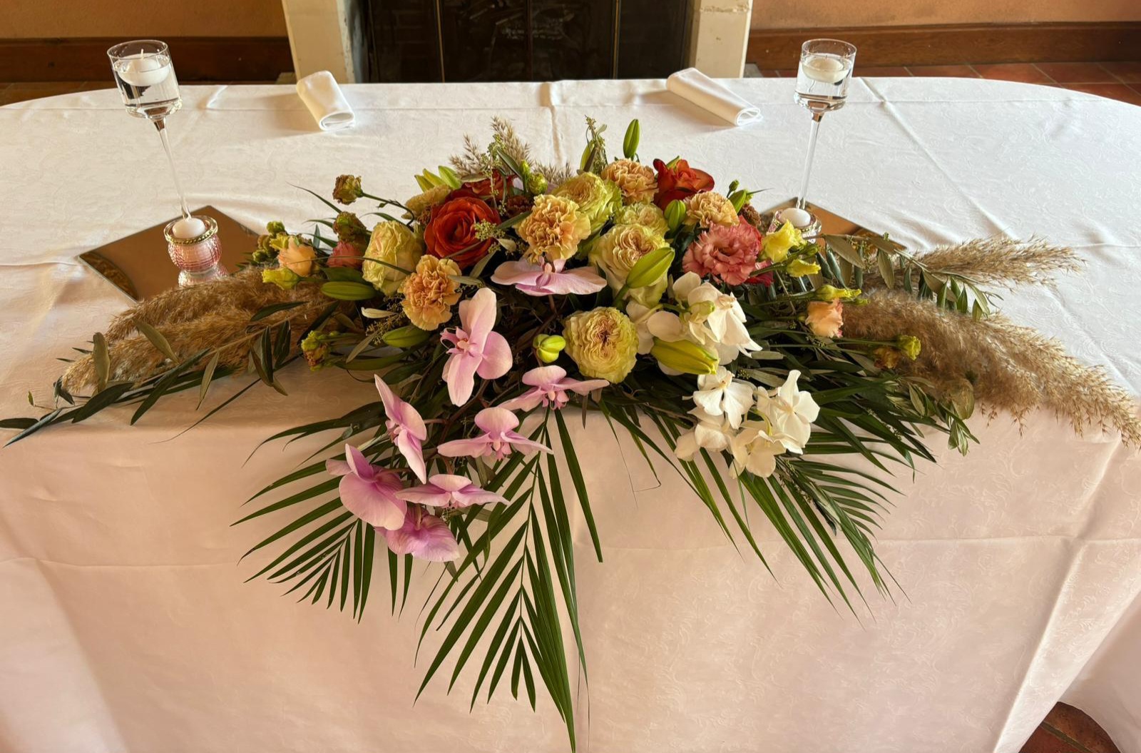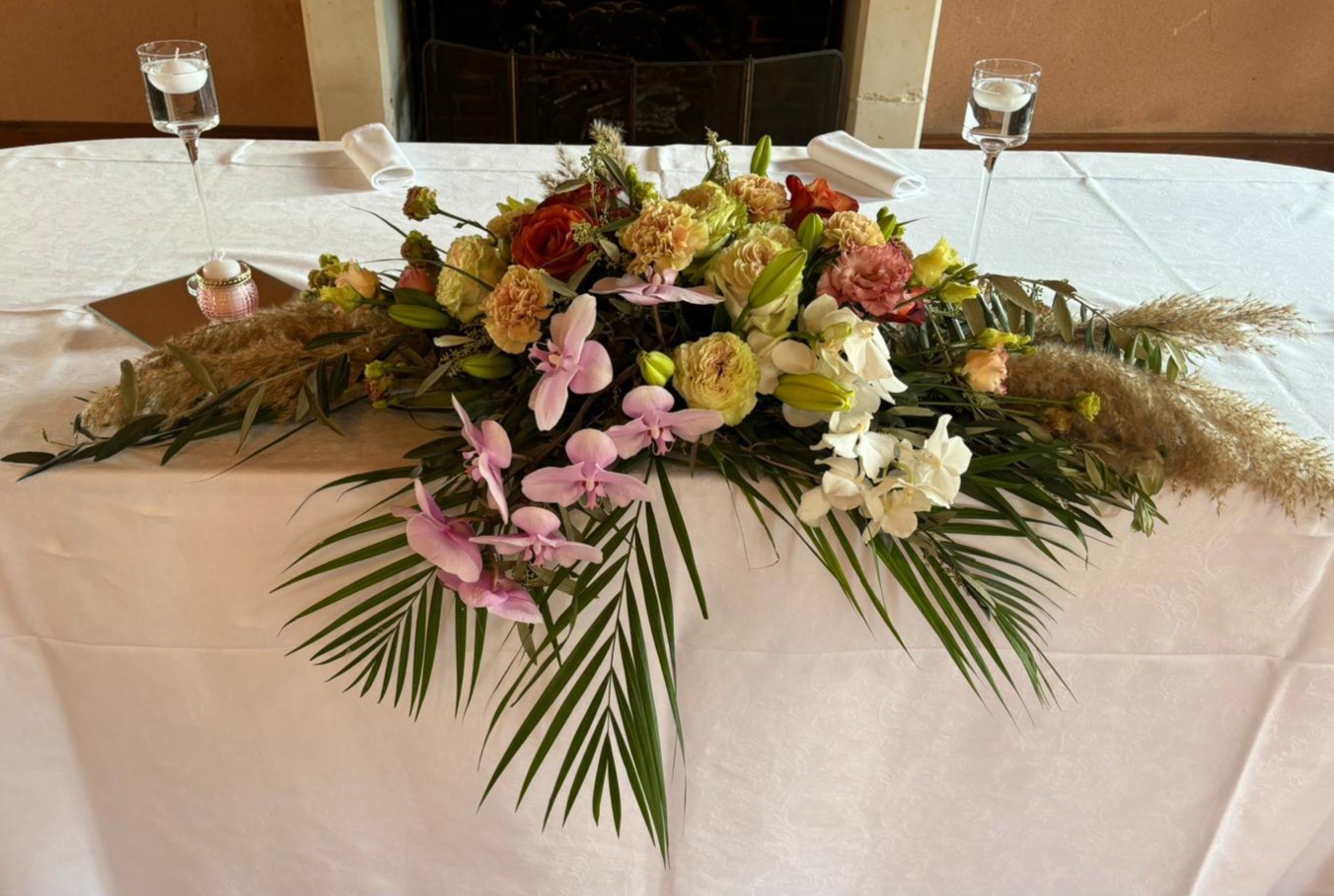Centre de table d’honneur en longueur réalisé avec des fleurs fraîches, des orchidée et des pampa, prix indiqué pour le fleurissent présenté, installation et démontage non inclus