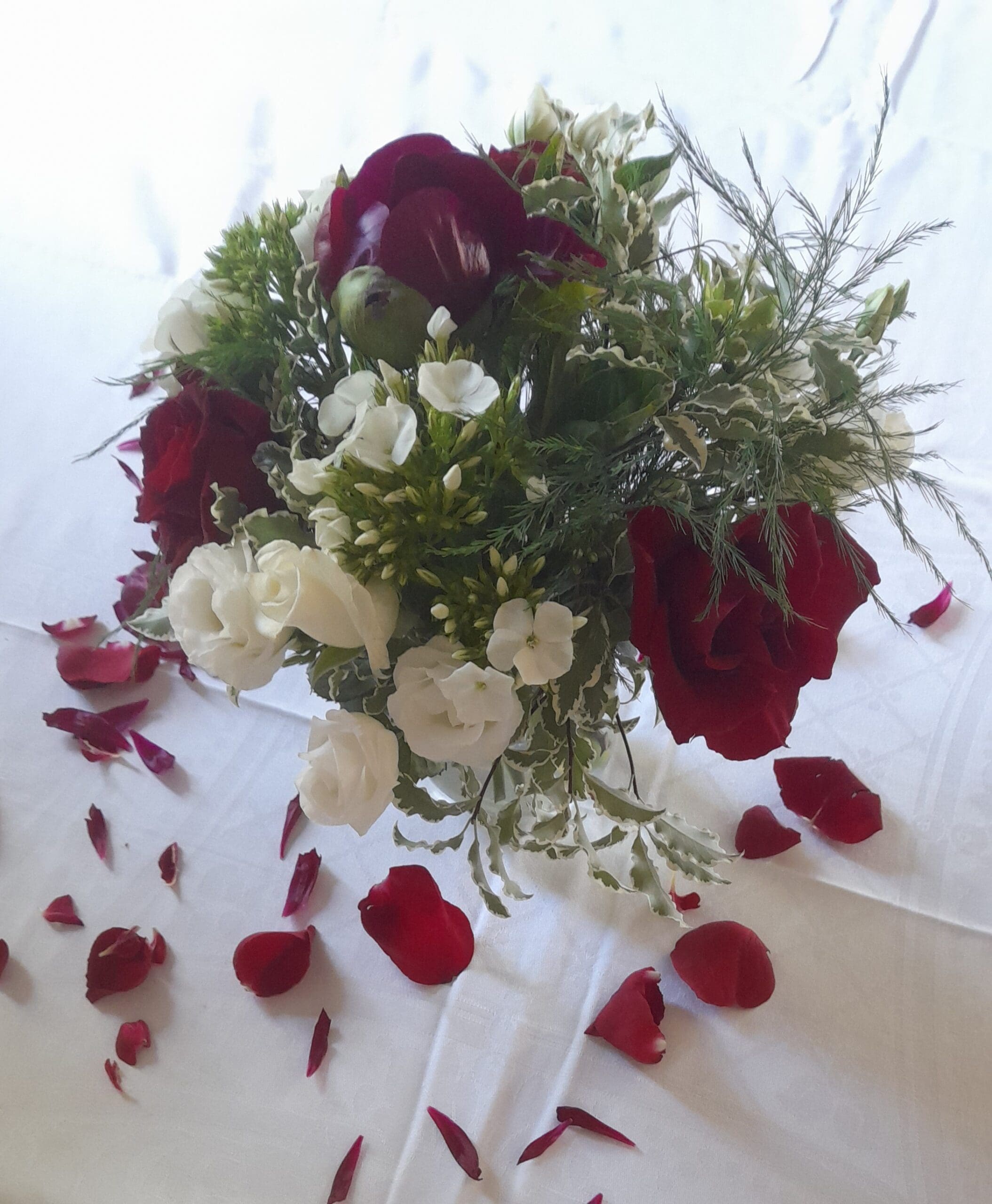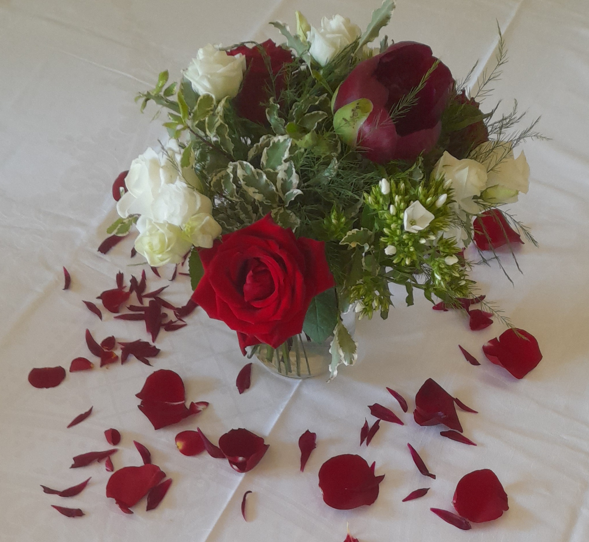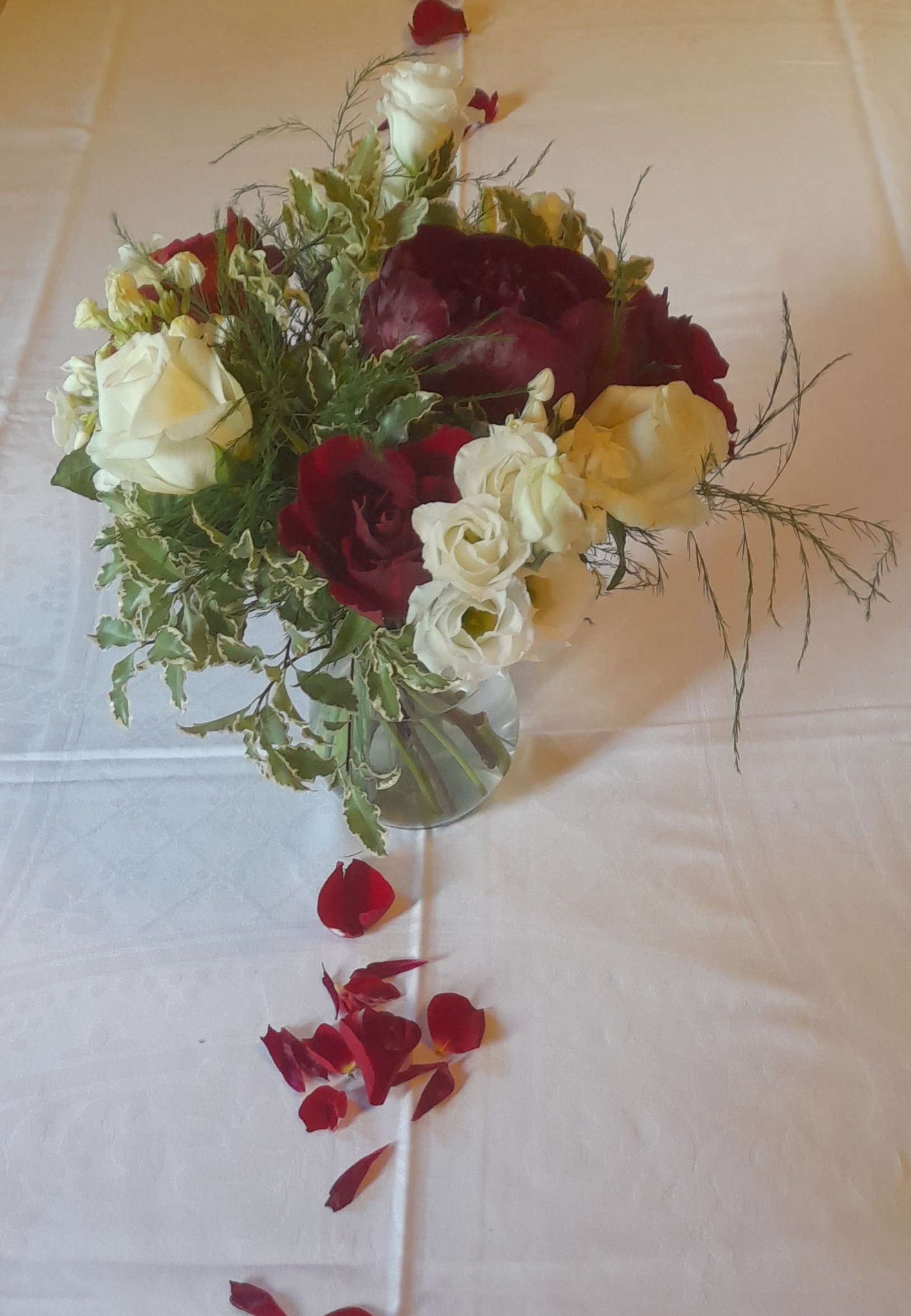 Centre de table rond composé de fleurs de saison rouge et blanc, possibilité de le réalisé dans toutes les couleurs de votre mariage, prix indiqué pour le fleurissent présenté location vases inclus