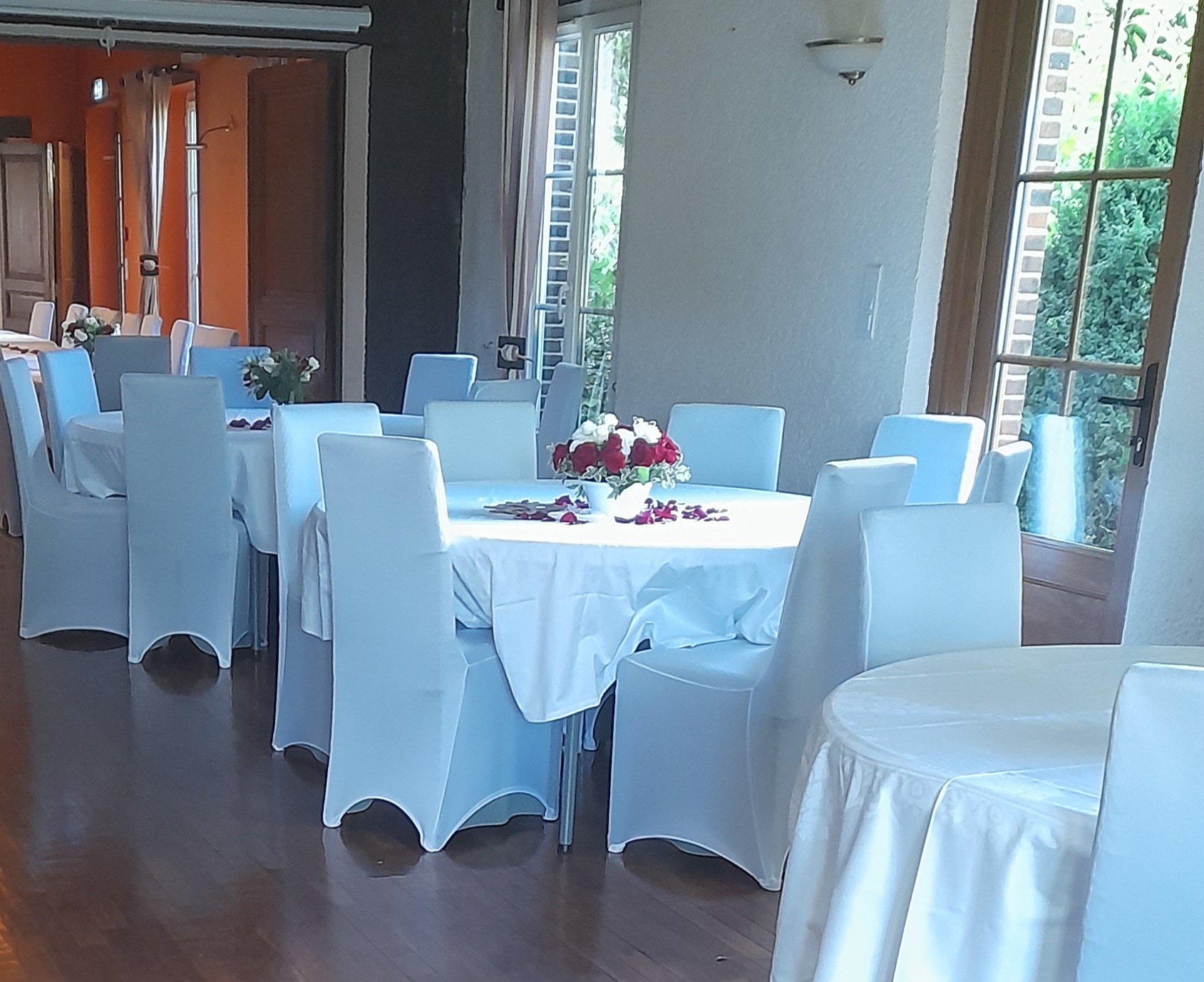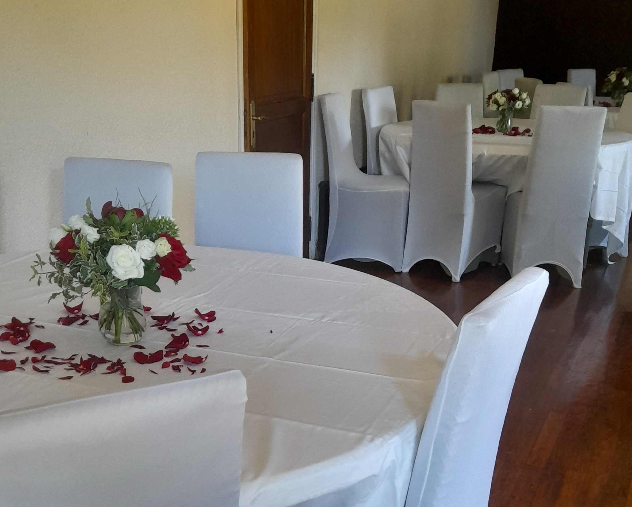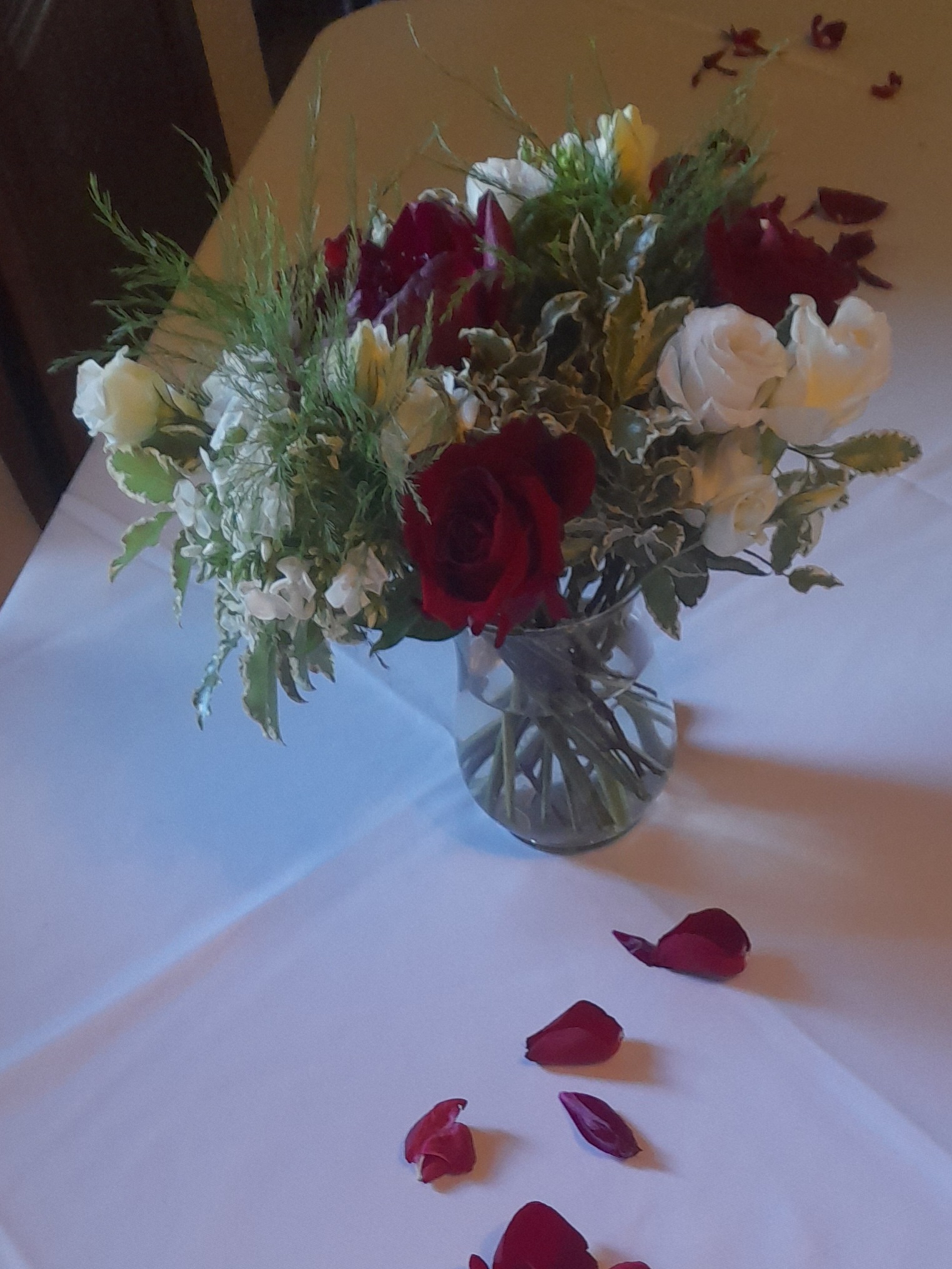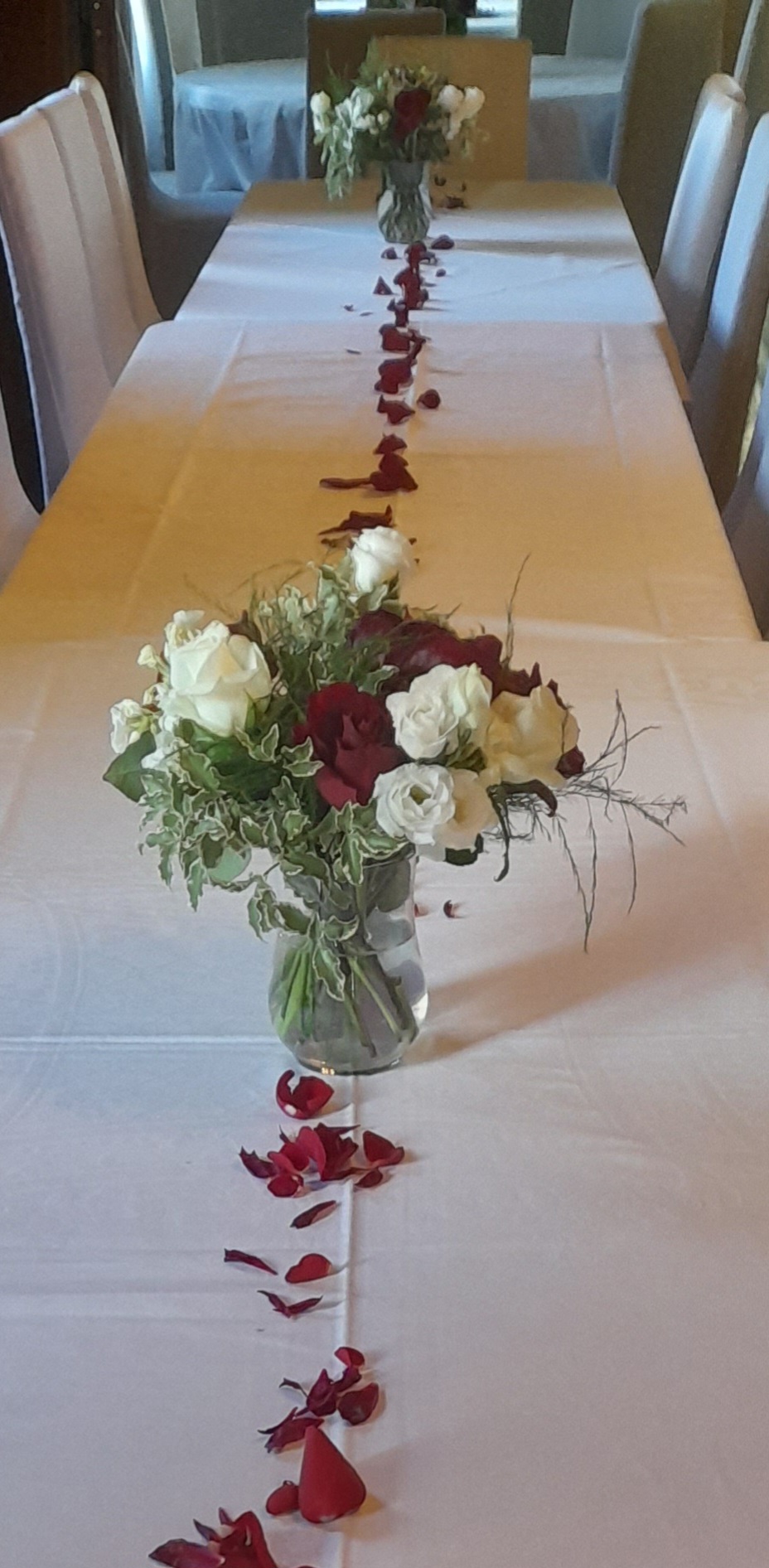 Centre de table rond composé de fleurs de saison rouge et blanc, possibilité de le réalisé dans toutes les couleurs de votre mariage, prix indiqué pour le fleurissent présenté location vases inclus