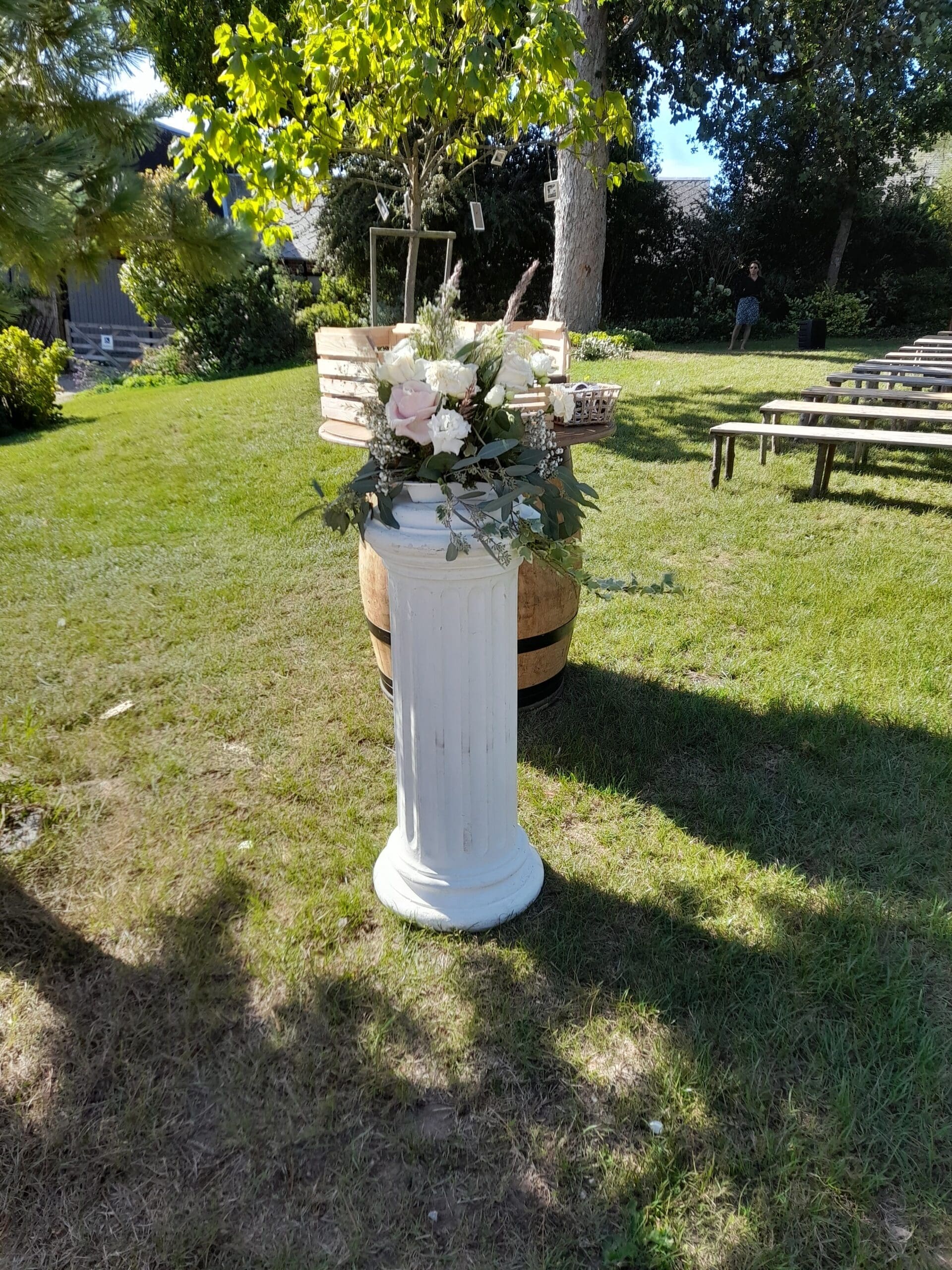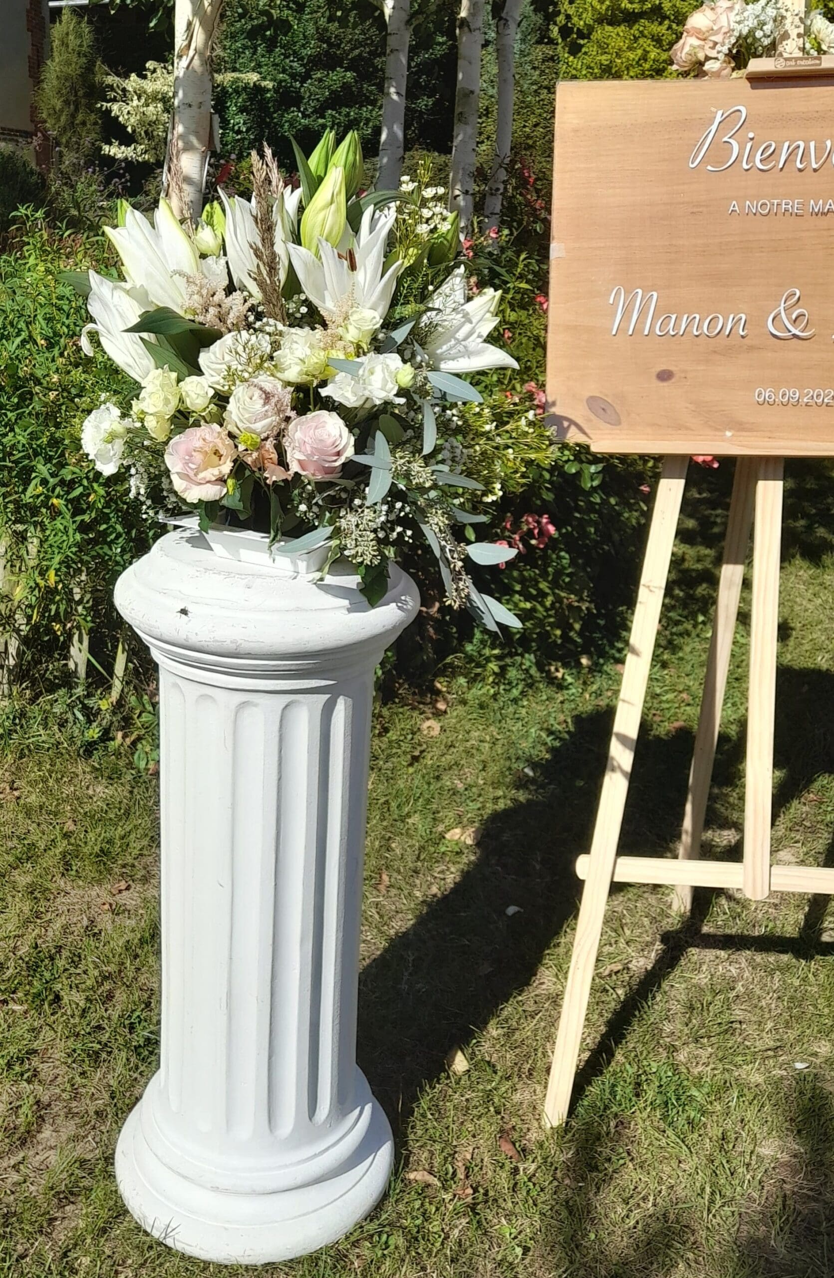 Colonne blanche pour entrée de salle de reception ou cérémonie laïc, 4 disponibles, hauteur 91cm diamètre socle 40cm diamètre plateau 30cm , prix indiqué pour une location sur deux jours installation et démontage non inclus, 50 pour cents du montant de location sera appliqué par jours supplémentaires