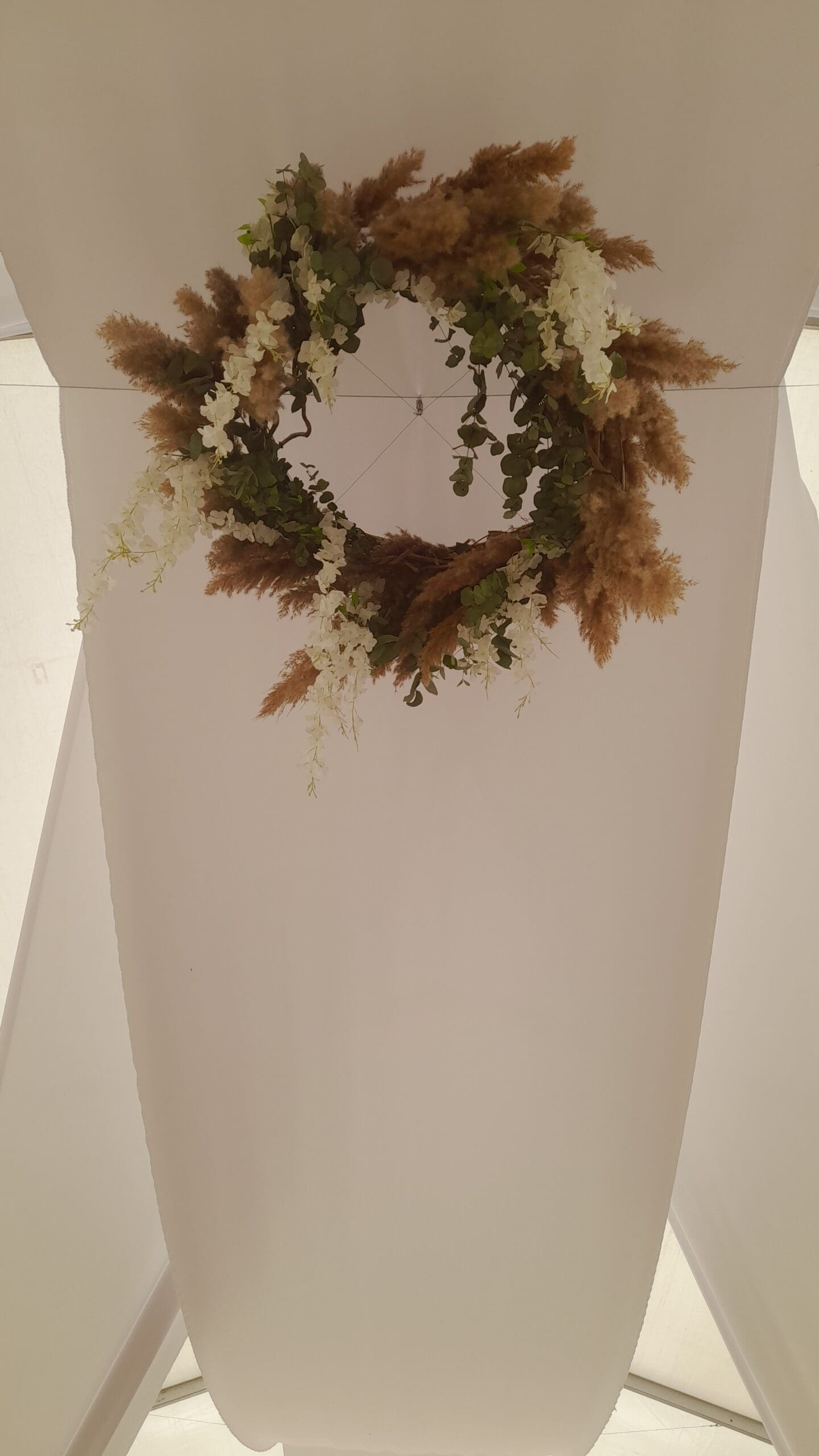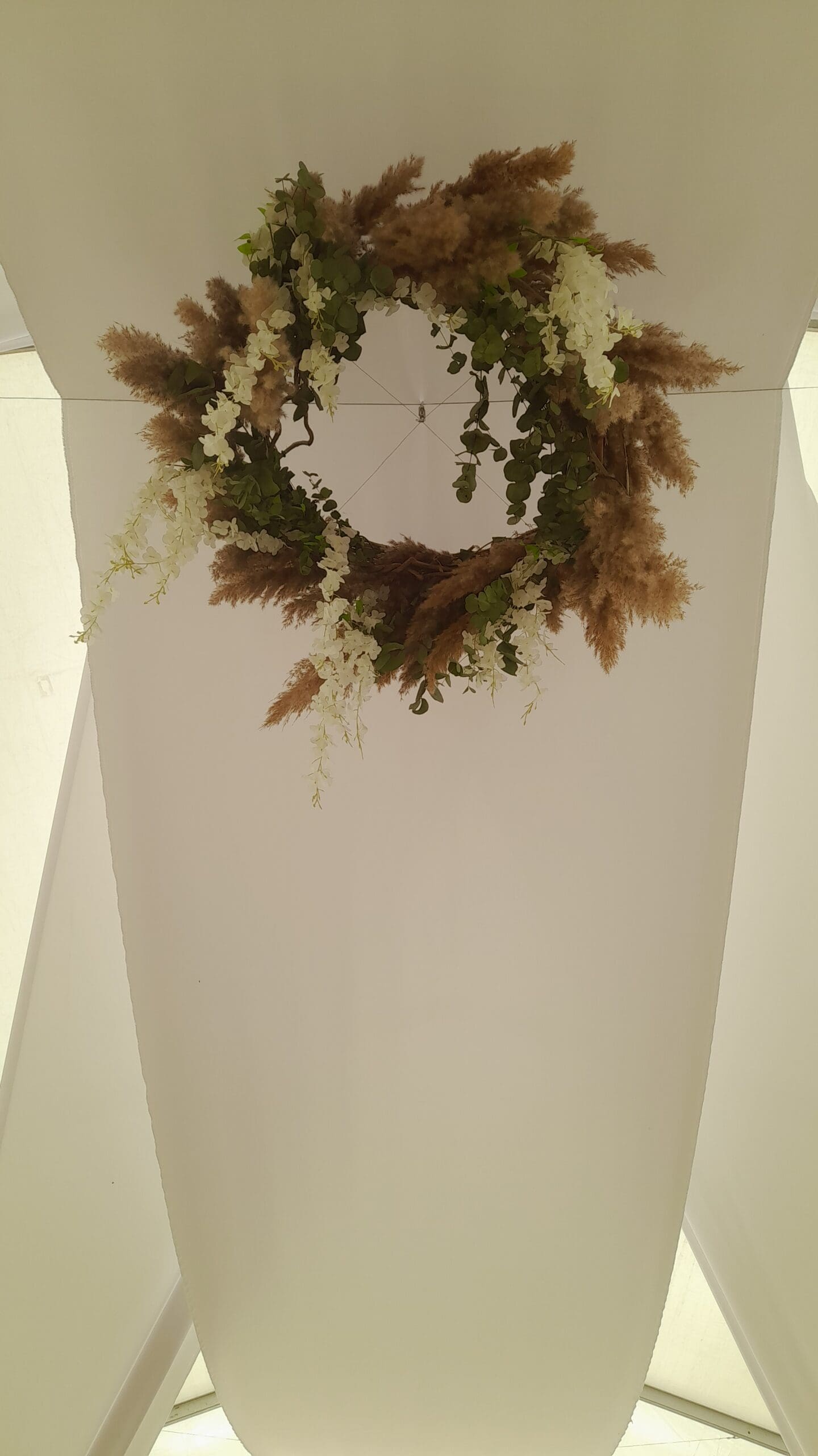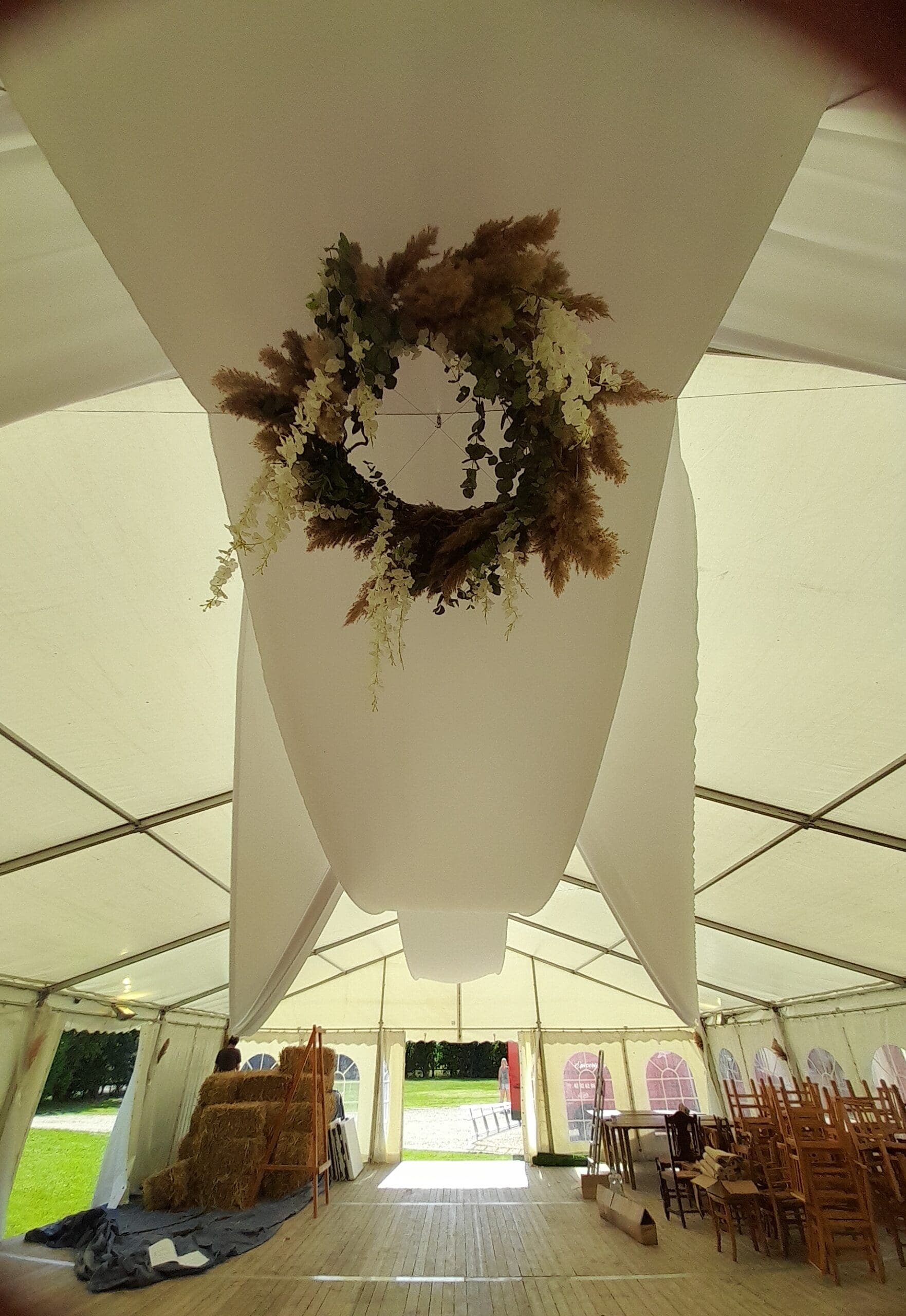 Grande couronne de fleurs a suspendre dans votre salle de réception, réalisable dans toutes les couleurs de votre mariage, réalisable a partir de 250€ , n’hésitez pas à nous consulter pour obtenir votre devis,