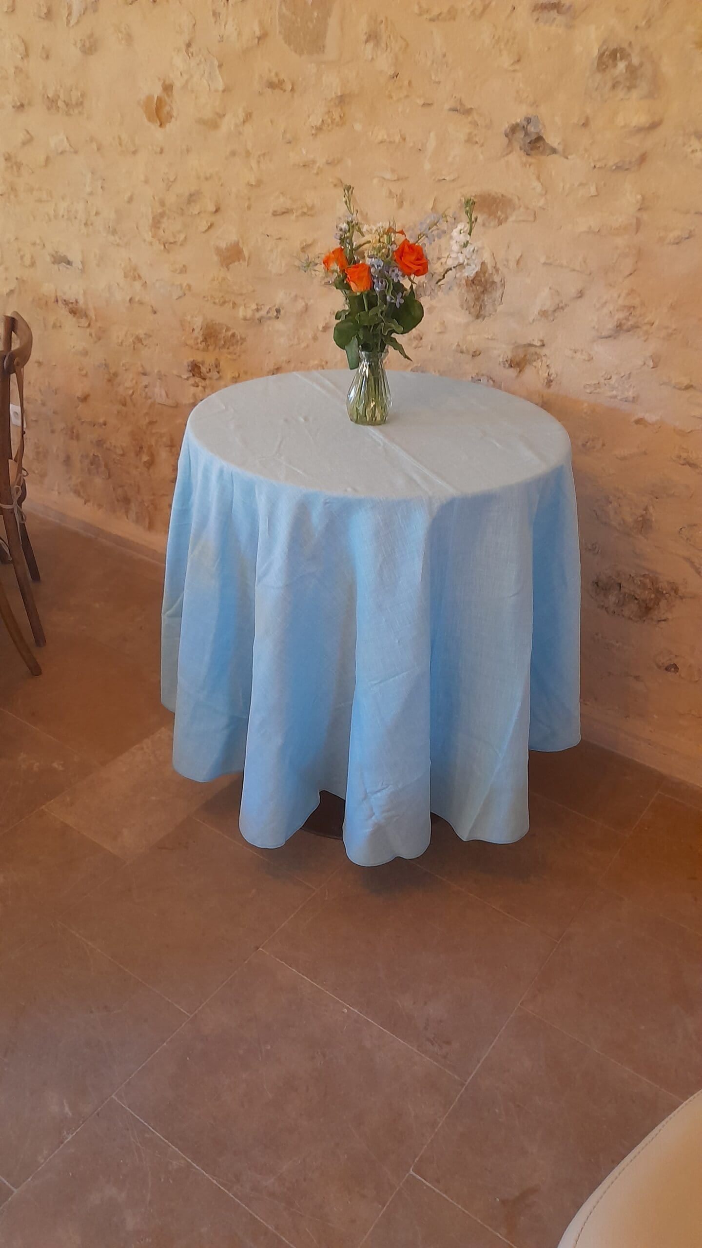 Tres jolie nappe en Cotton bleu clair qui donnera a votre réception une touche original et douce , diametre 228cm , idéale pour table 8 personnes, forfait location indiqué pour deux jours ,nappage a rendre non lavé, 50 pour cents du montant de location sera appliqué par jours supplémentaires, livraison installation et démontage non inclus,