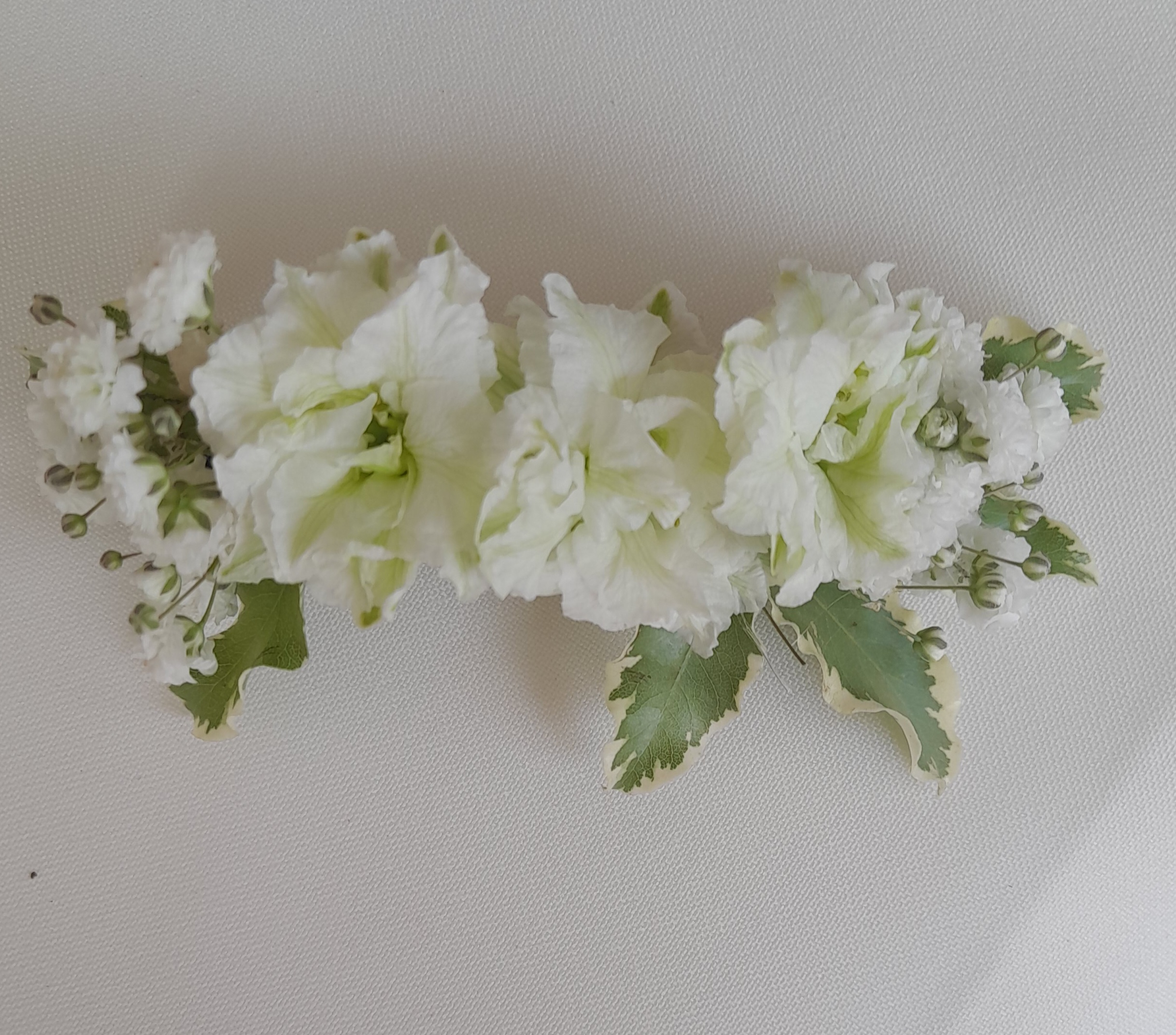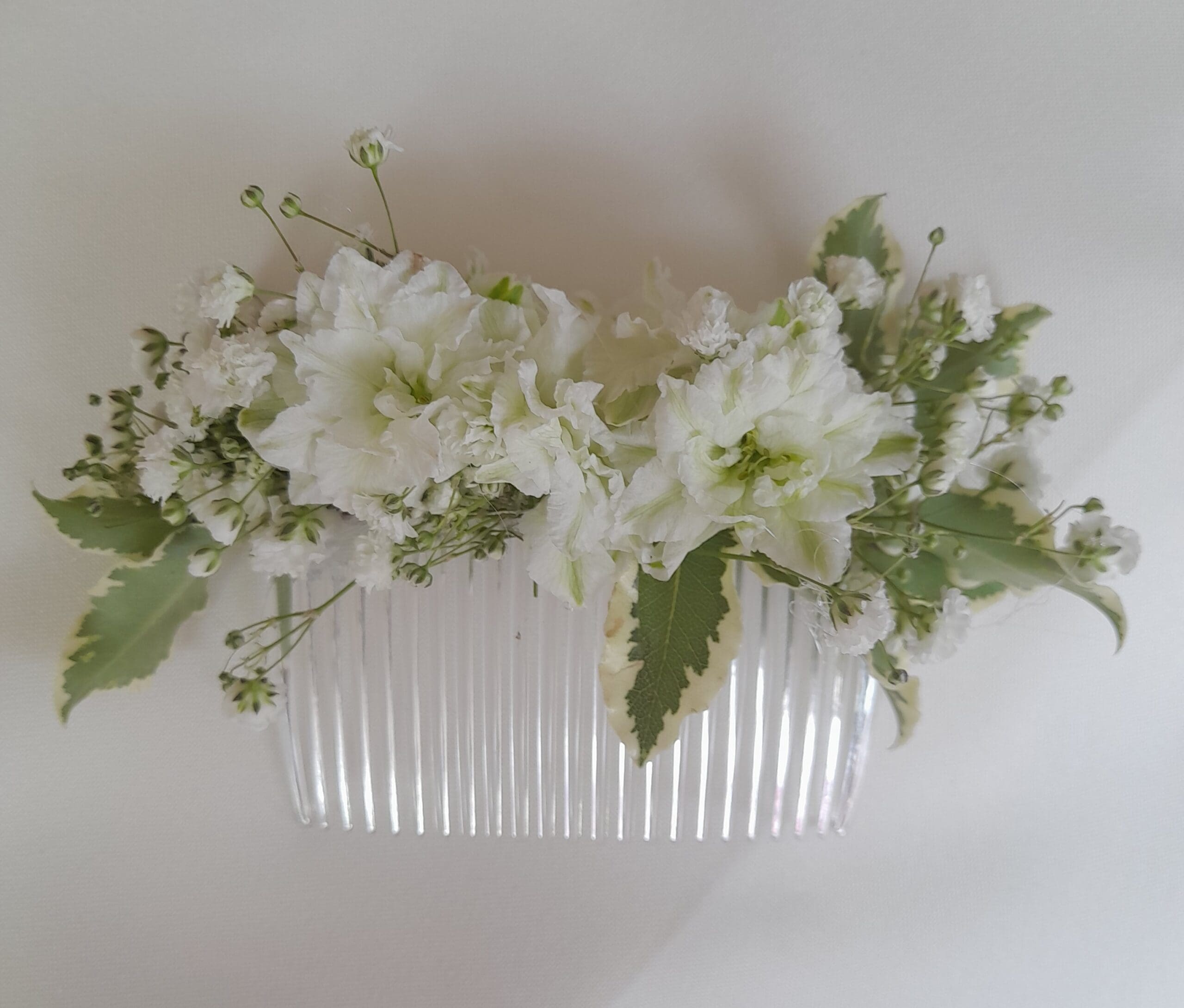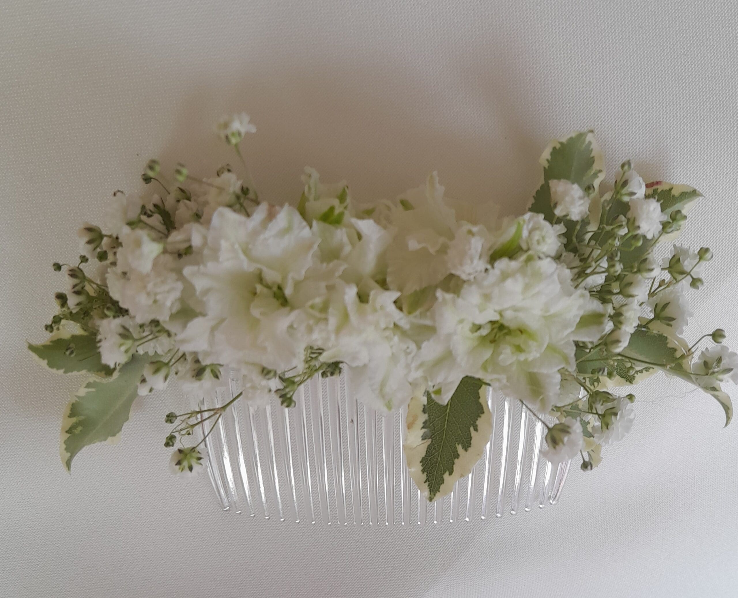 Joli peigne décorer de fleurs blanche pour une coiffure sobre et élégante, possibilité de le réalisé dans toutes les couleurs de votre mariage