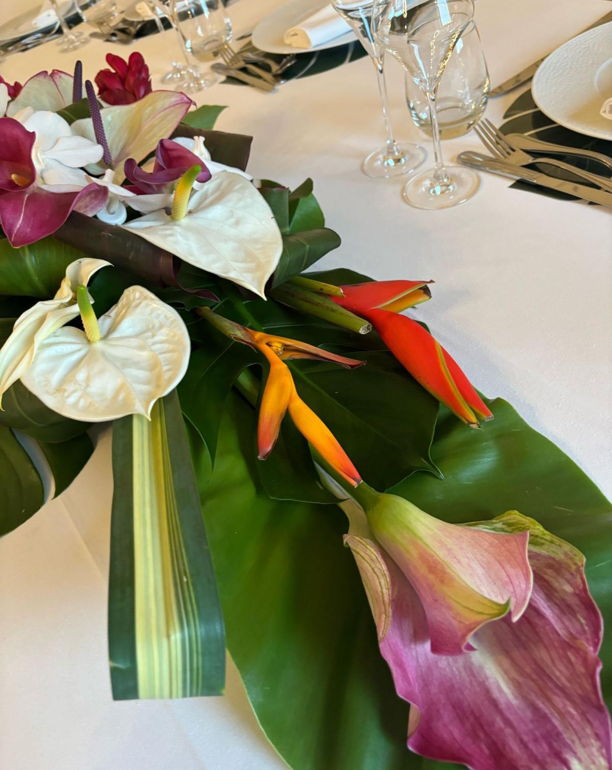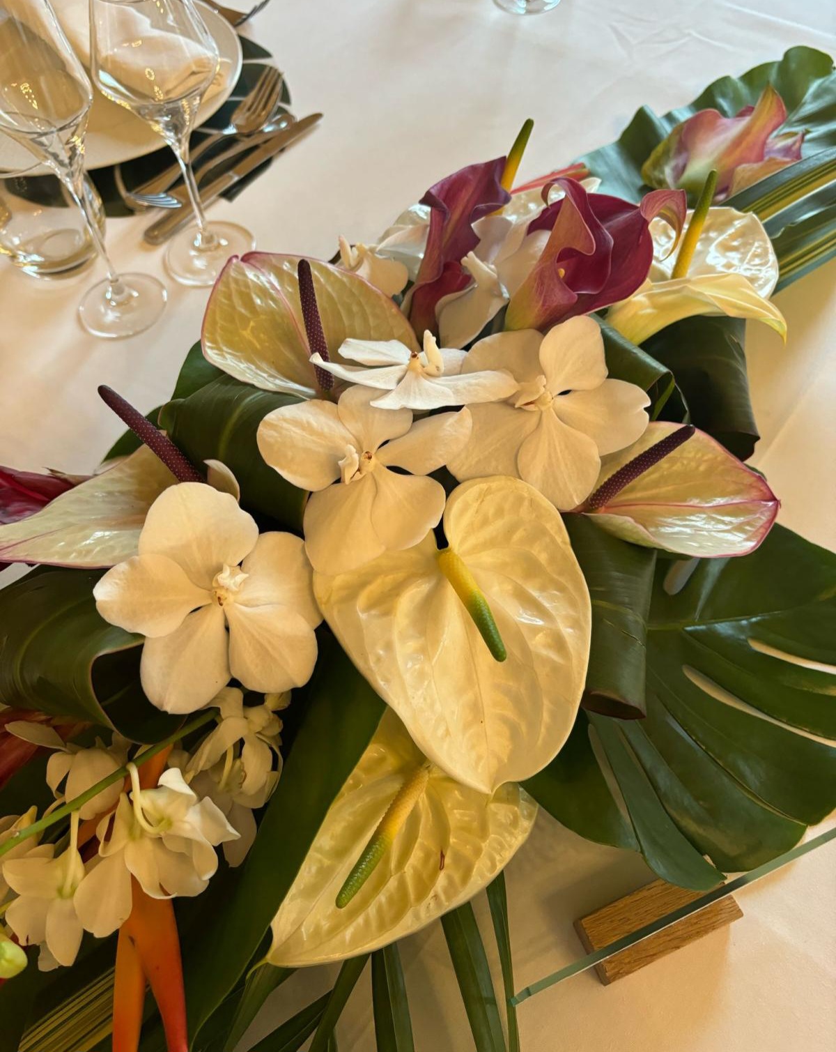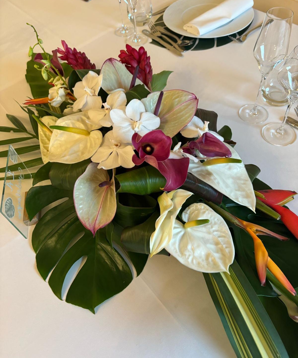 Centre de table d’honneur en longueur composée de fleurs exotique, prix indiqué pour le fleurissent présenté installation et démontage non inclus