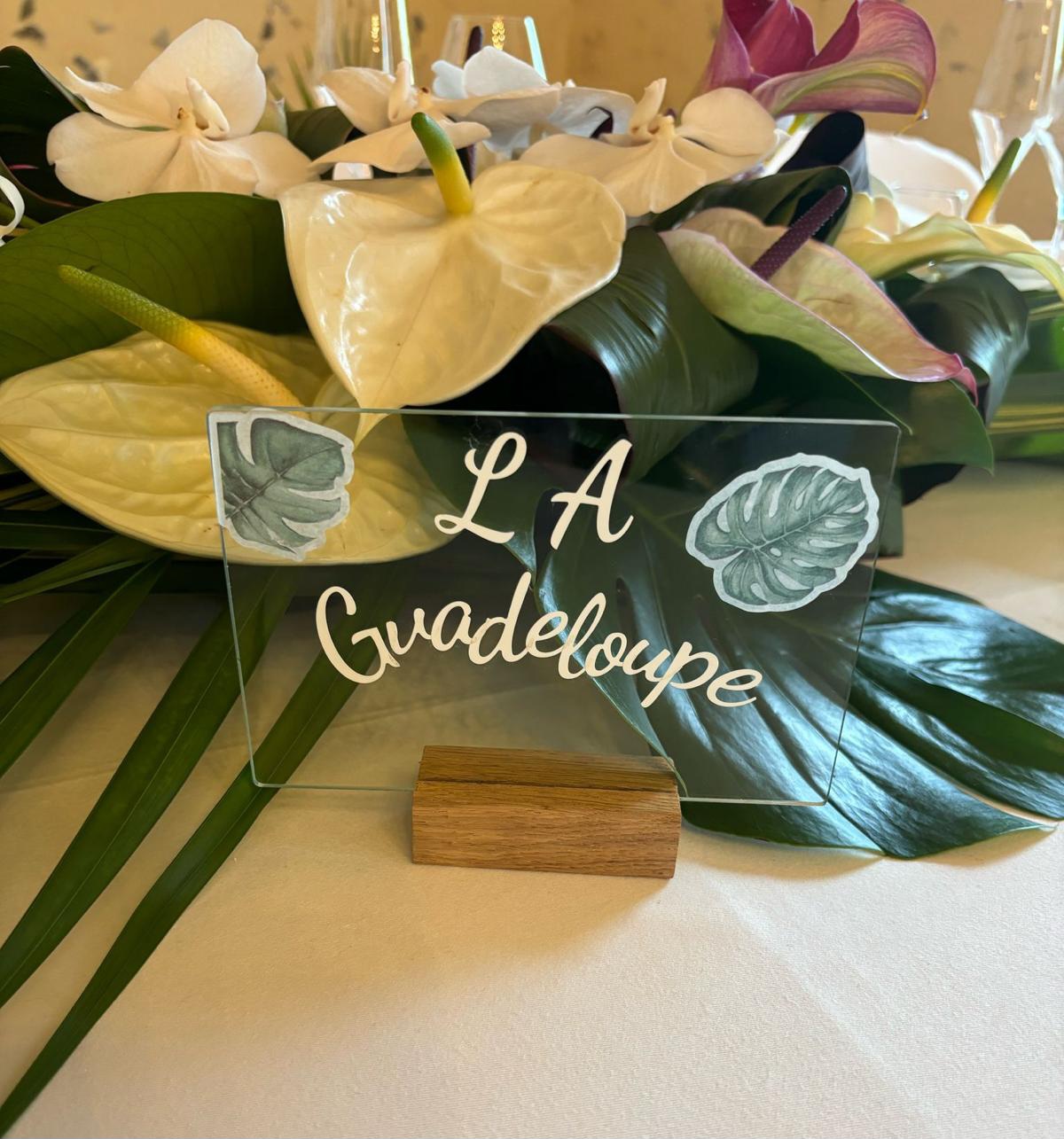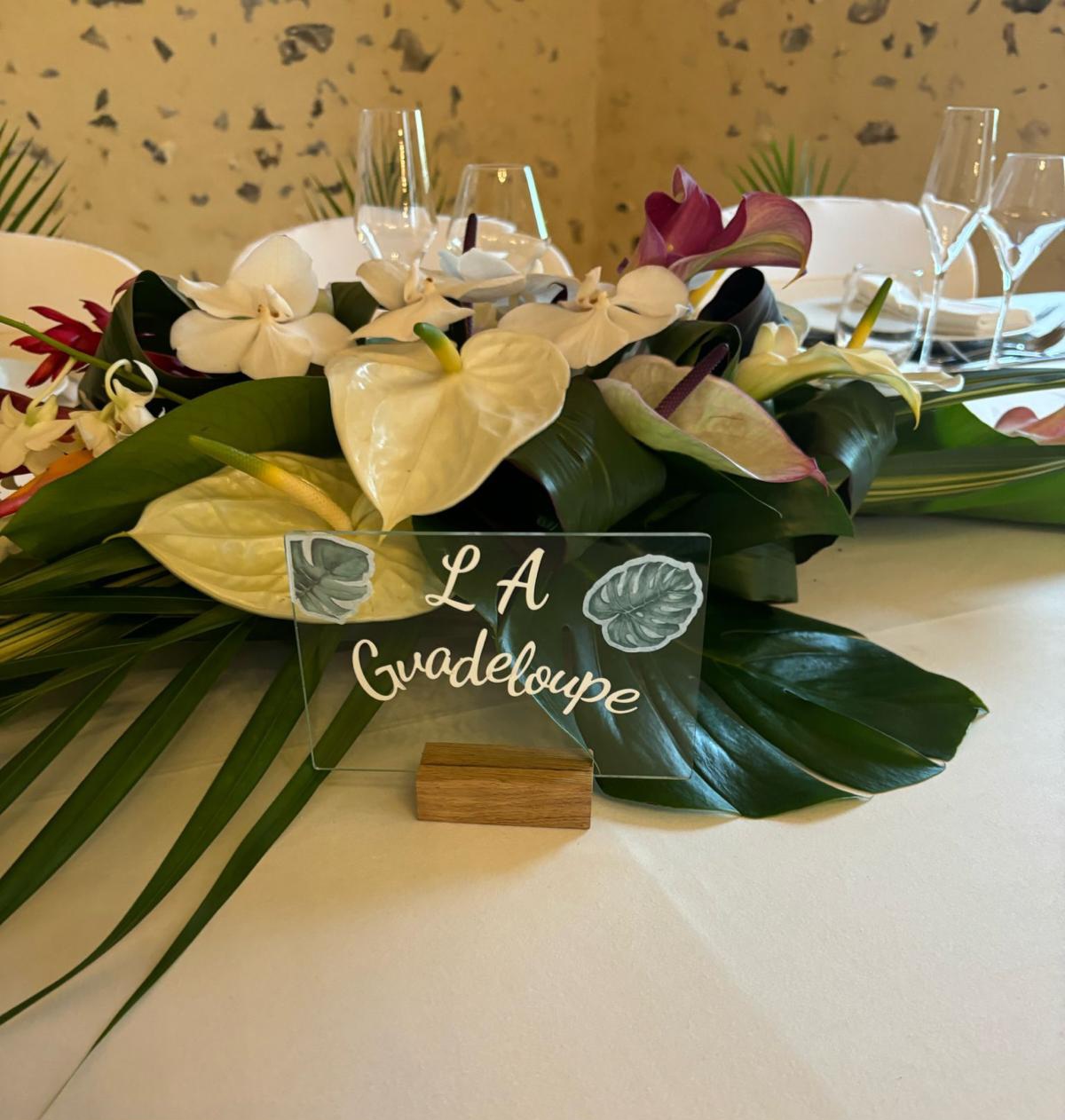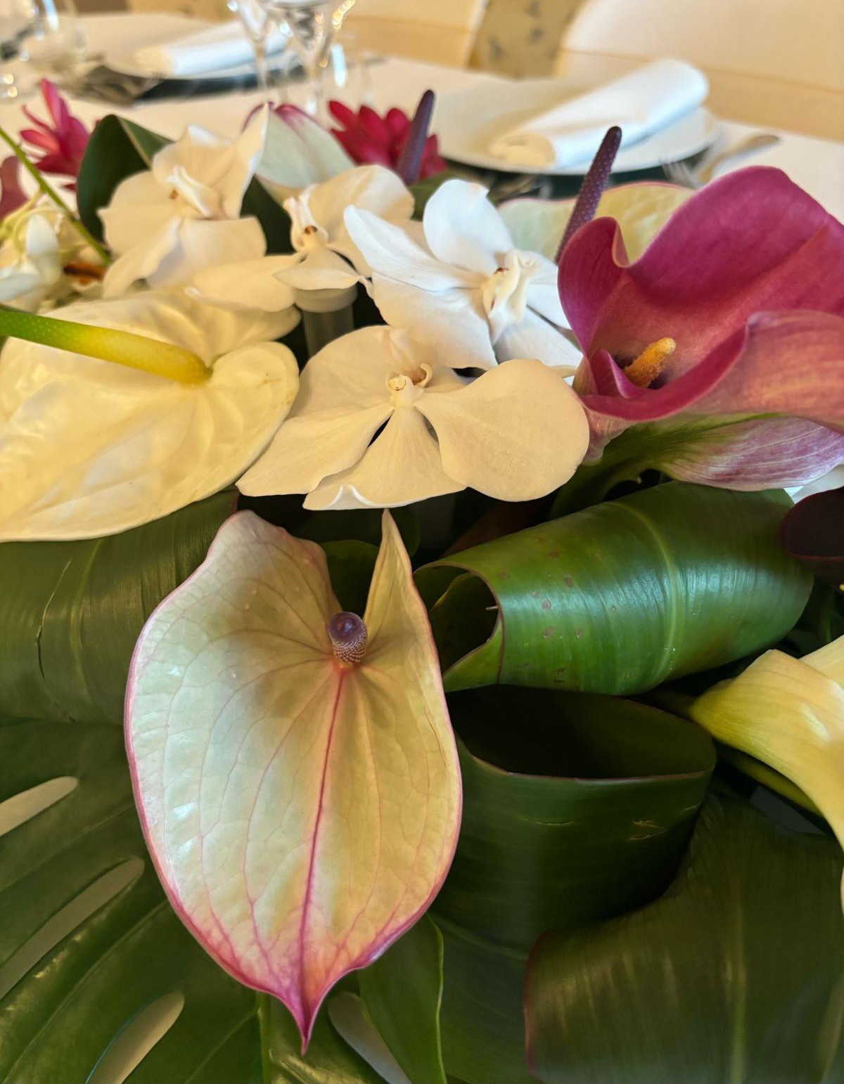 Centre de table d’honneur en longueur composée de fleurs exotique, prix indiqué pour le fleurissent présenté installation et démontage non inclus