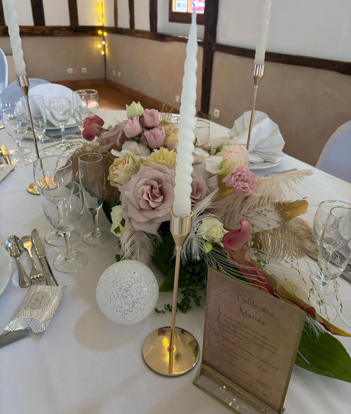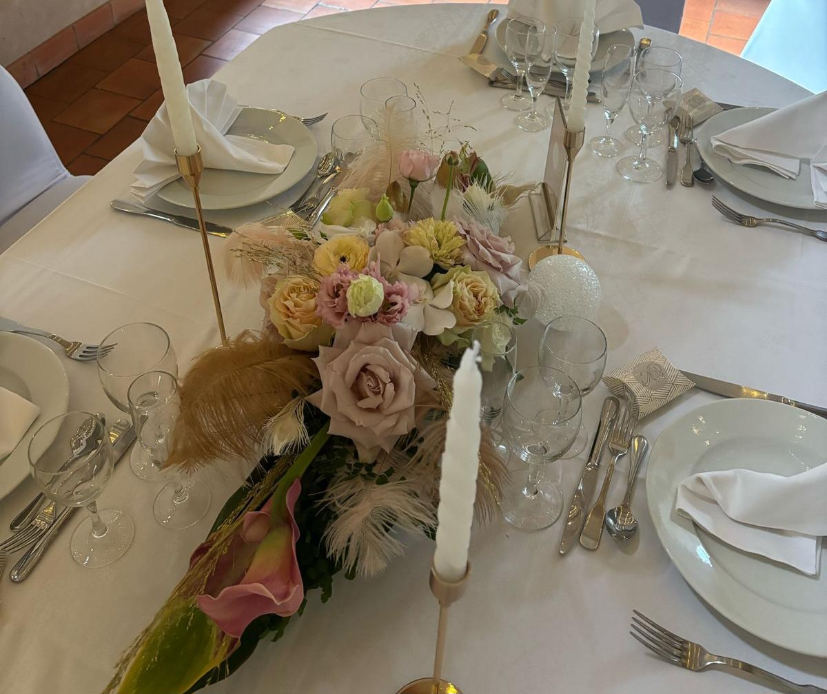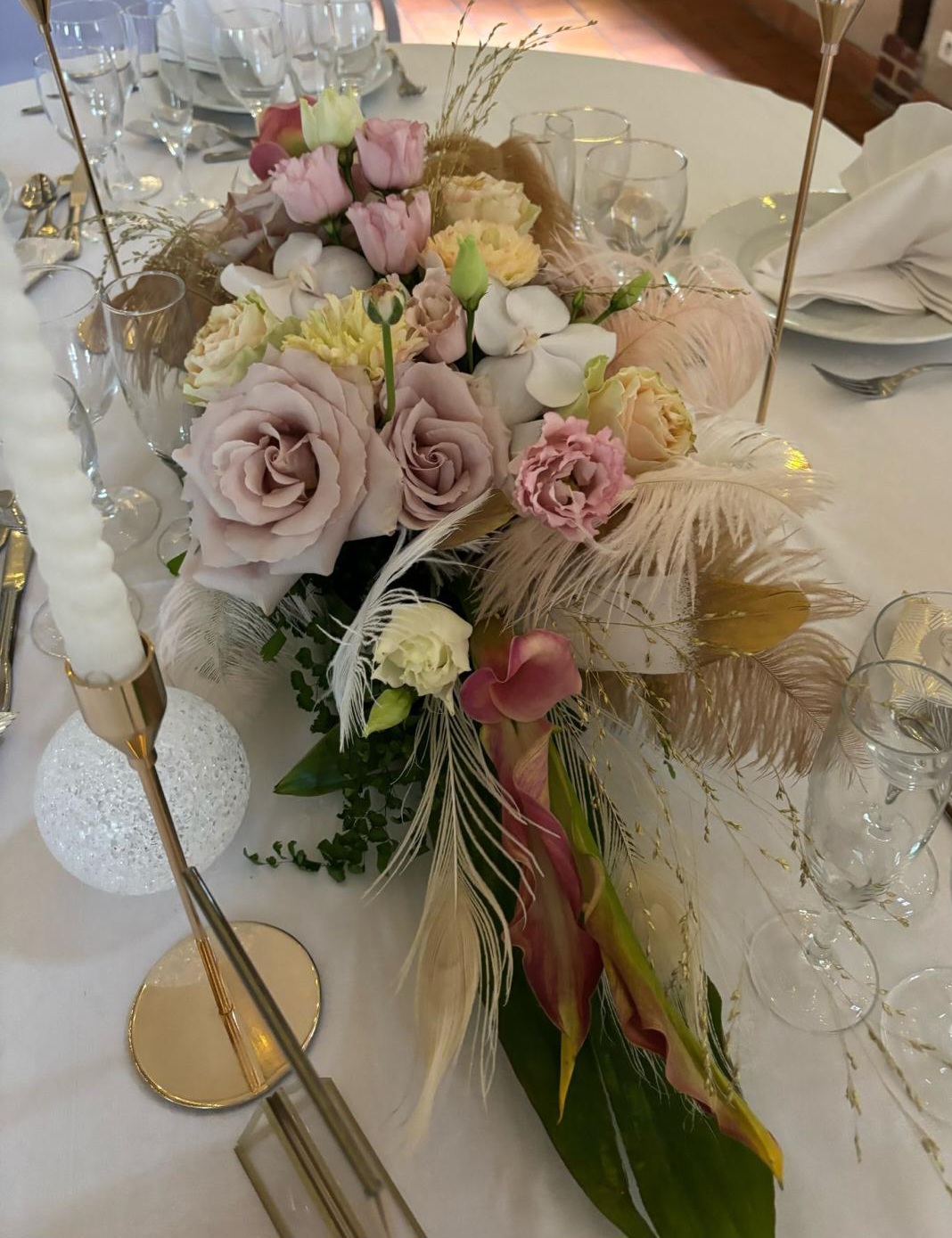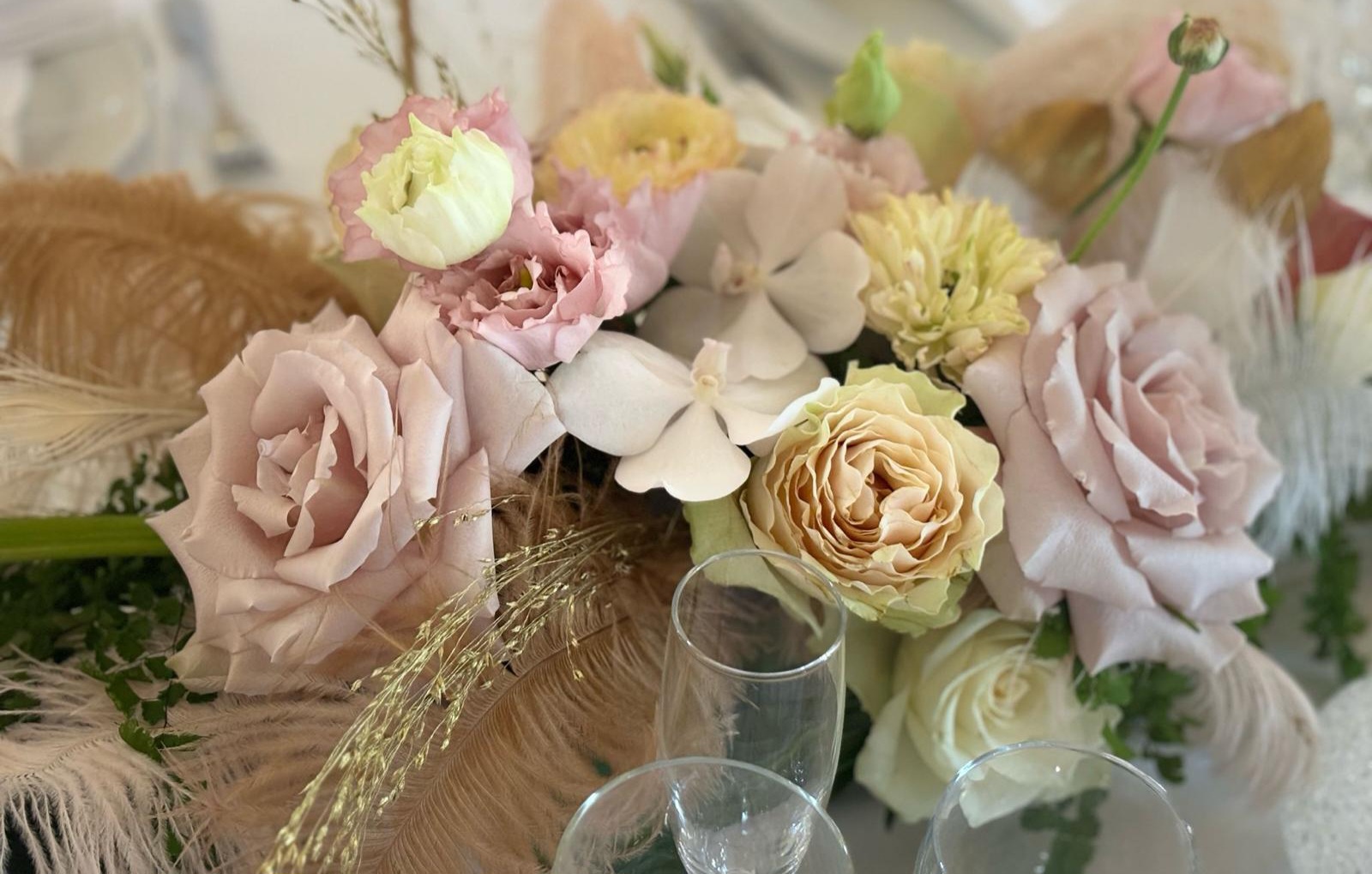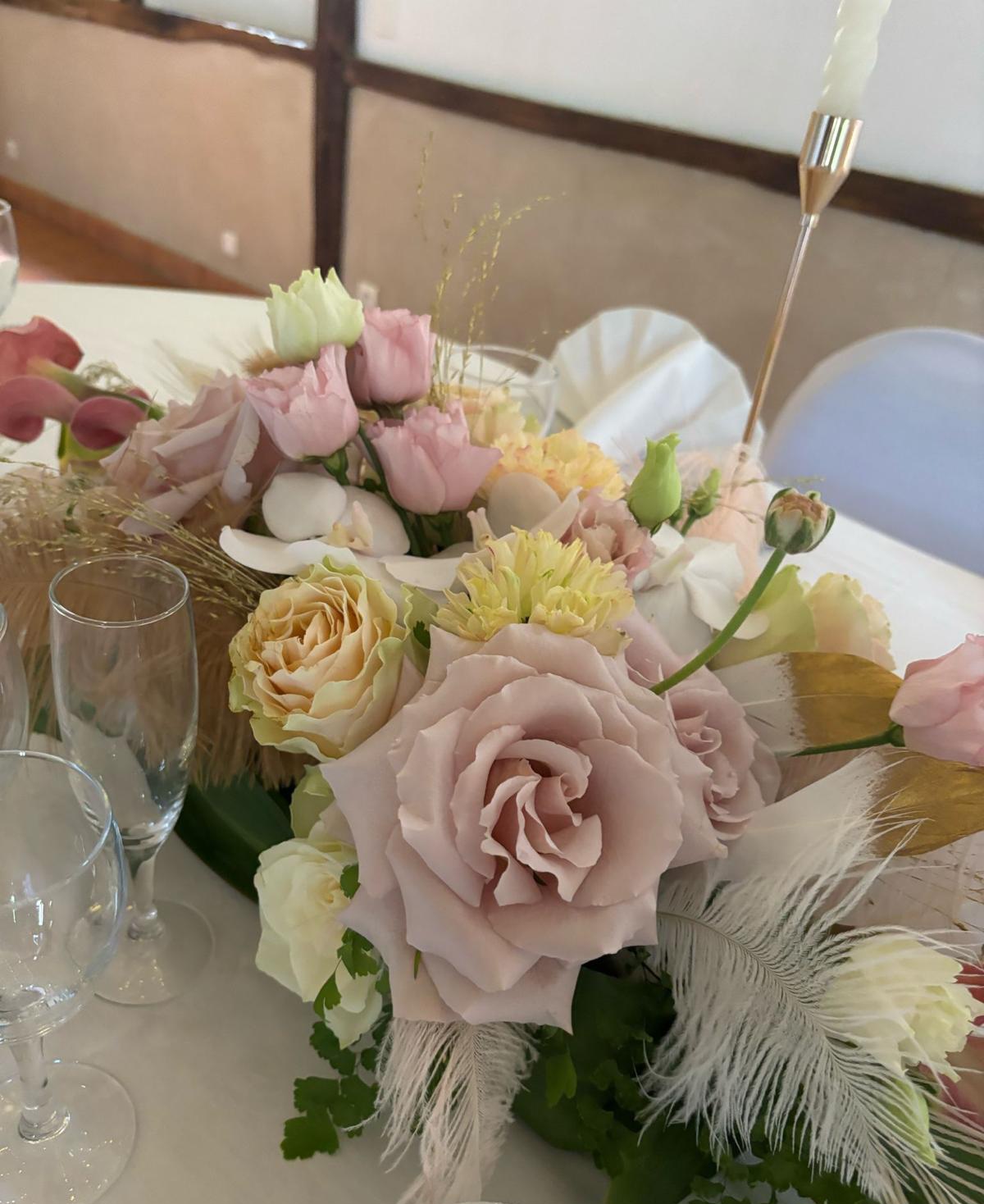Centre de table d’honneur en longueur composé de fleurs pastel et plume, une création sur mesure qui eblouira vos invités par sa délicatesse et son originalité, prix indiqué pour le fleurissent présenté, installation et démontage non inclus