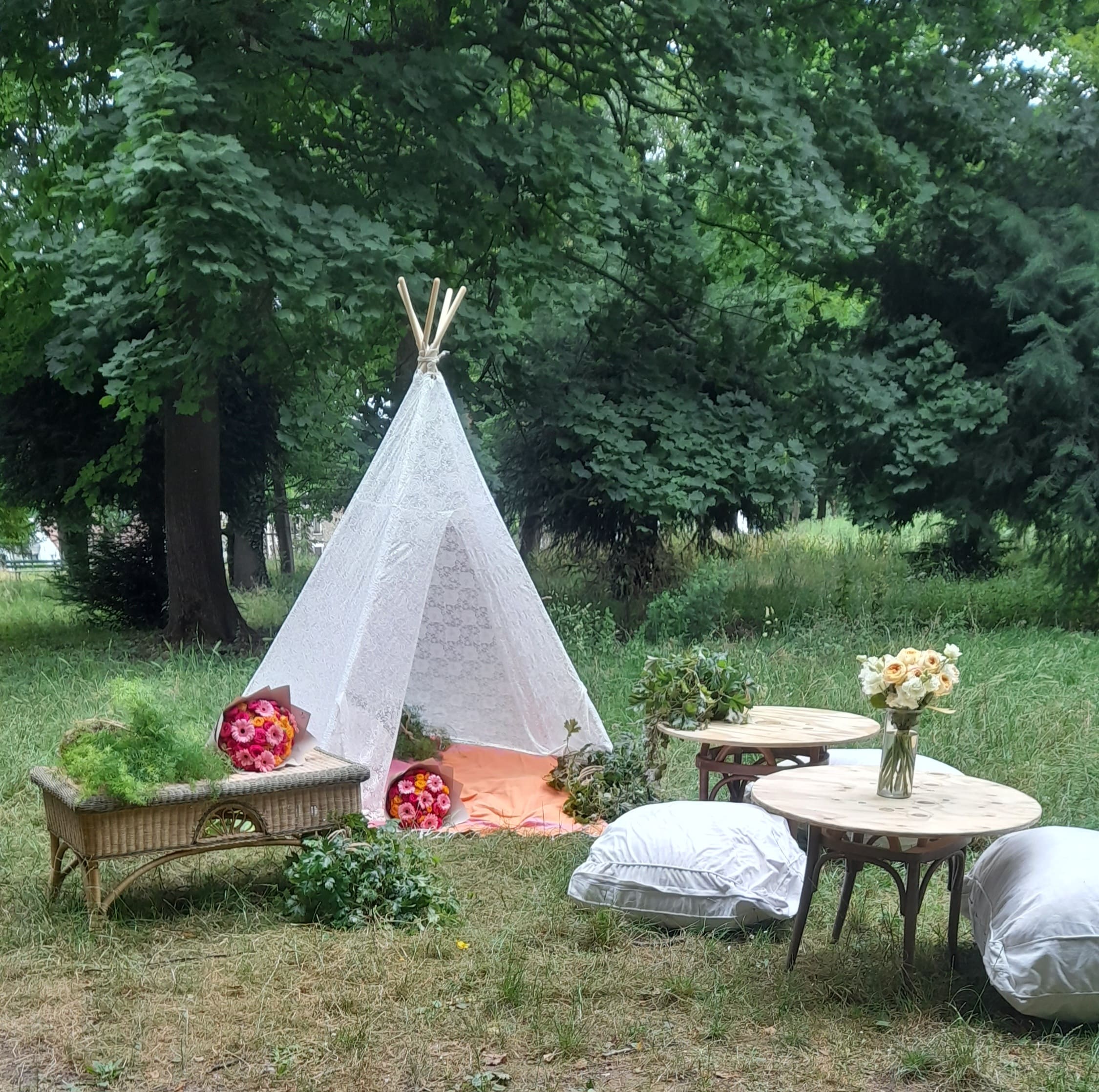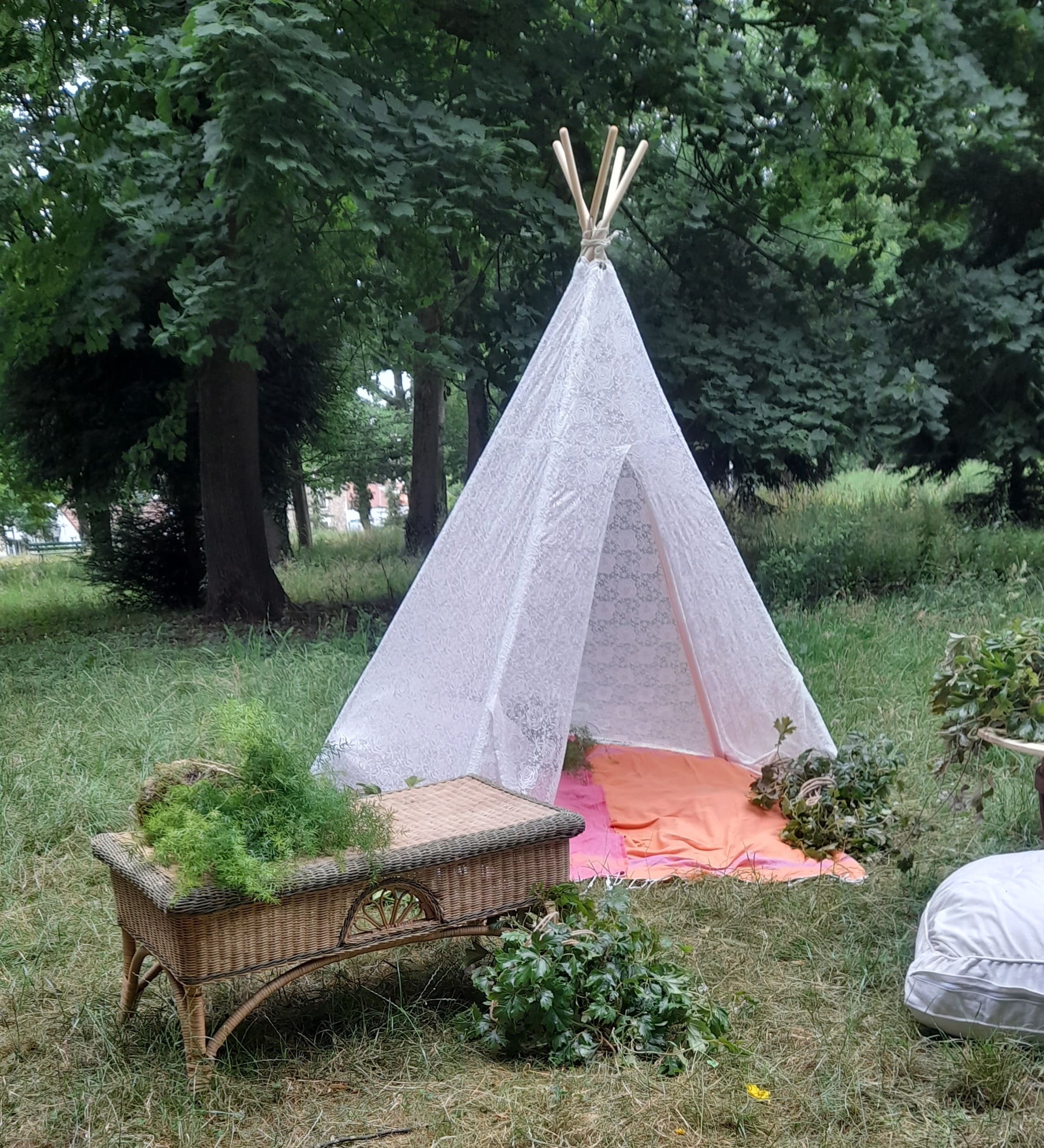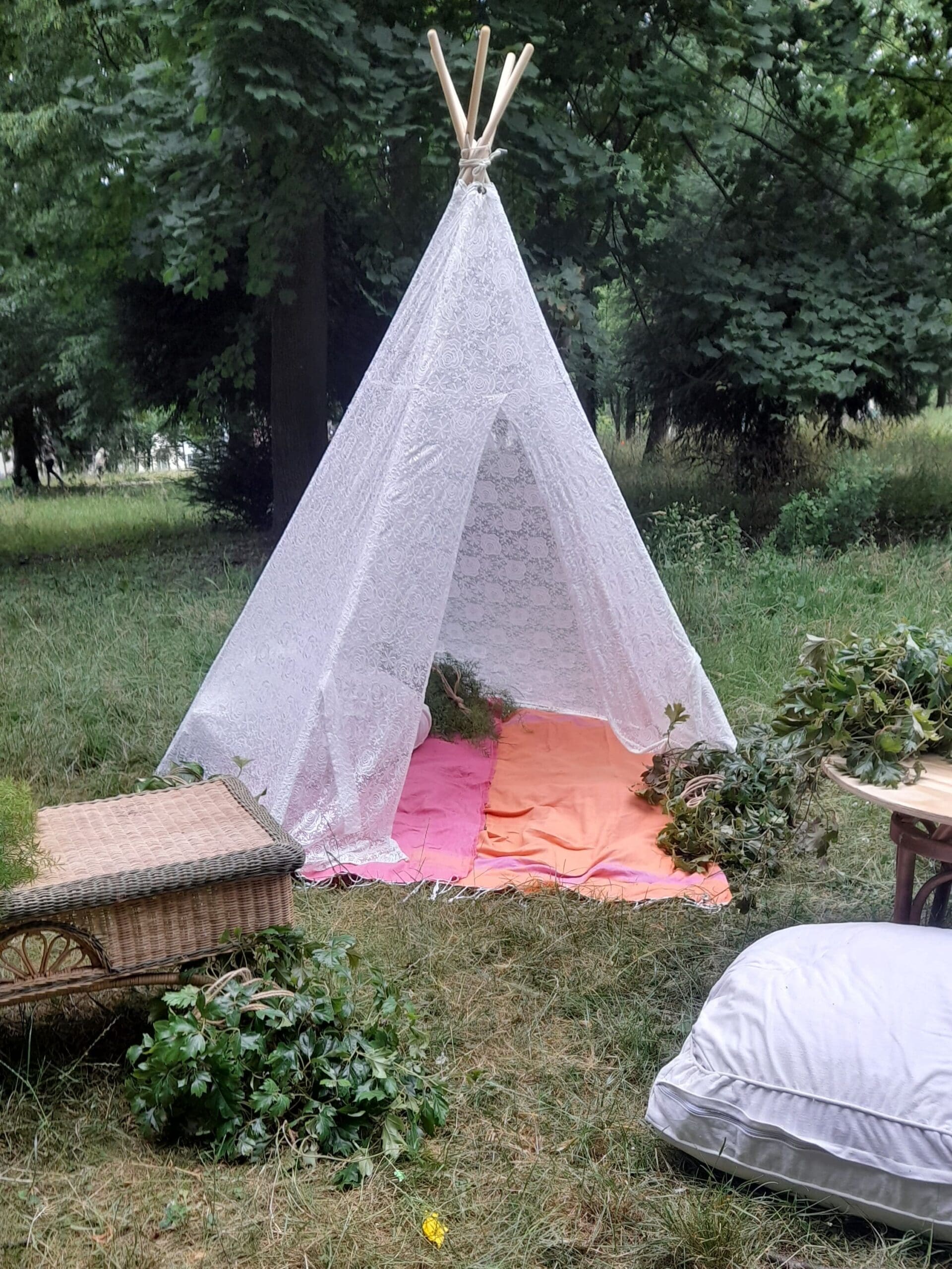 Joli tippie en dentelle idéale pour cérémonie laïque ou créer un espace cocon sur votre lieu de réception, disponible en location prix indiqué pour une location sur deux jours, installation et démontage non inclus, 50 pour cent du montant par pièce sera appliqué par journée supplémentaire de location