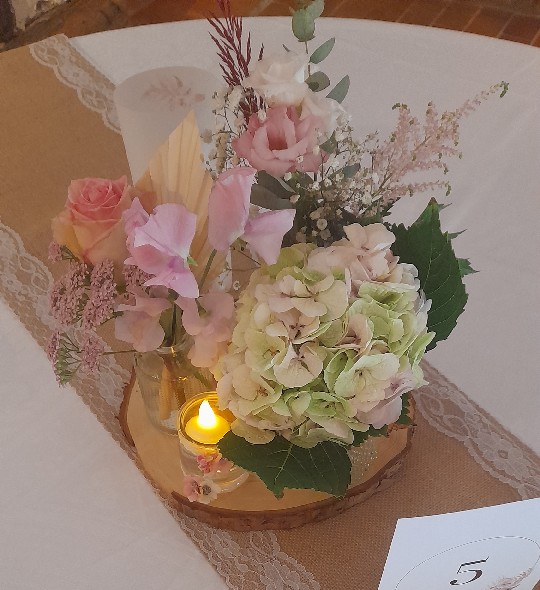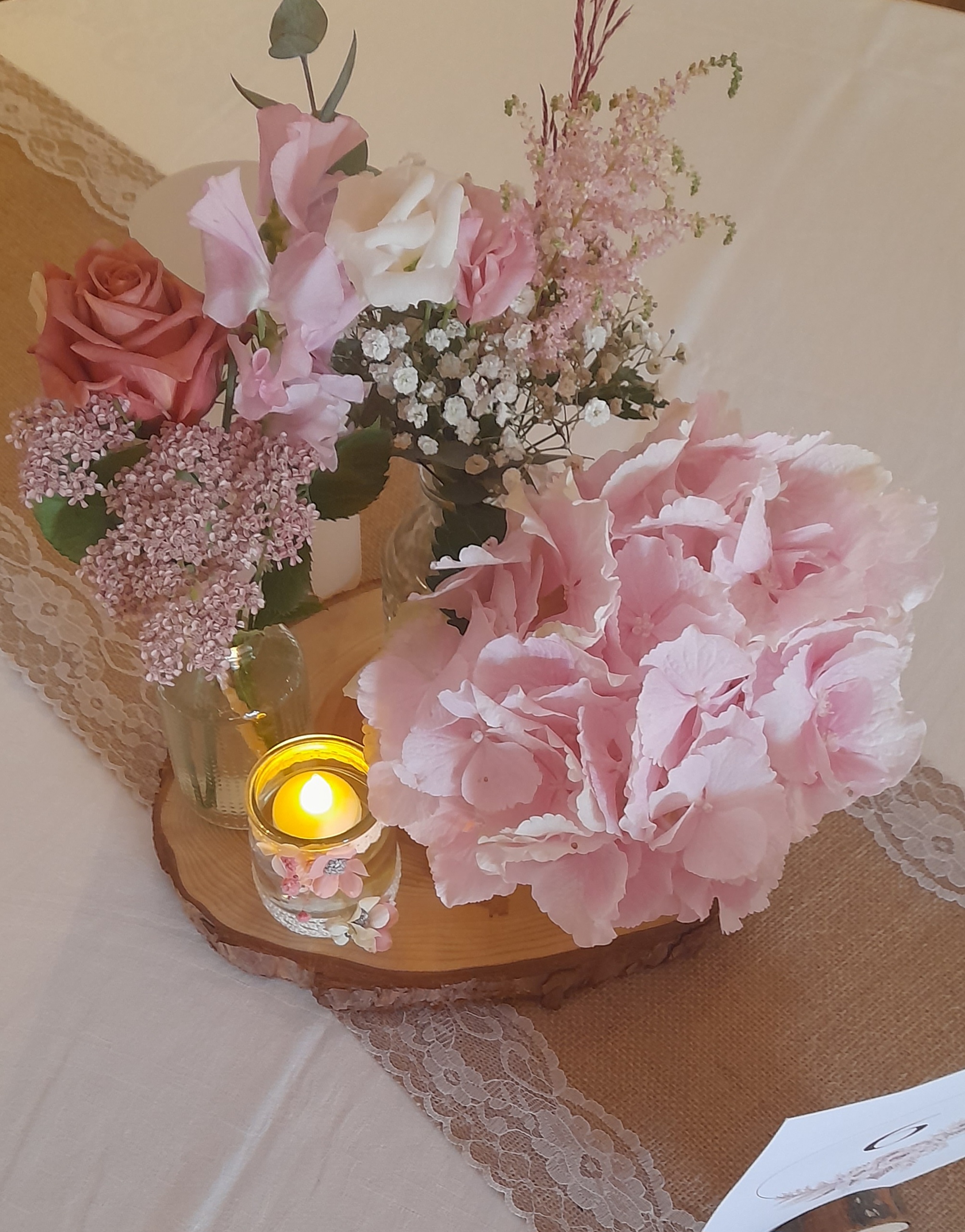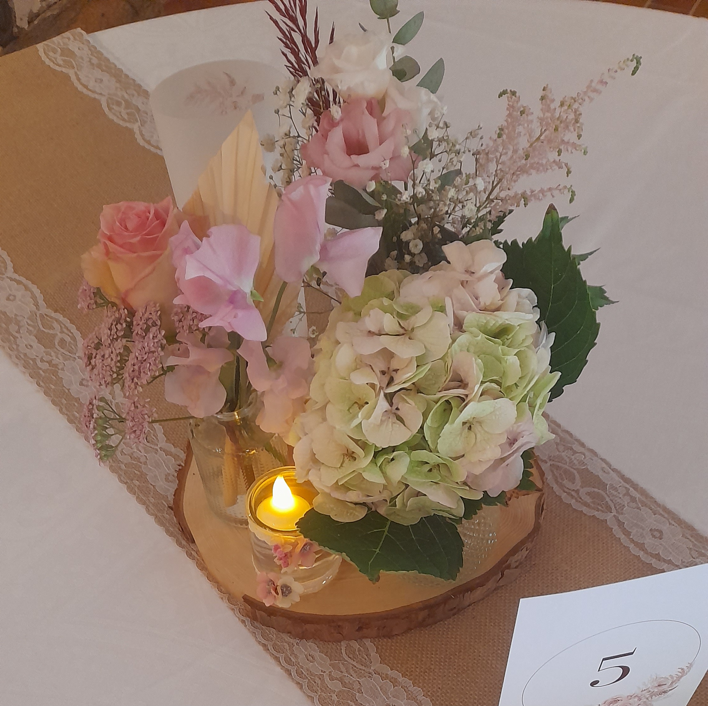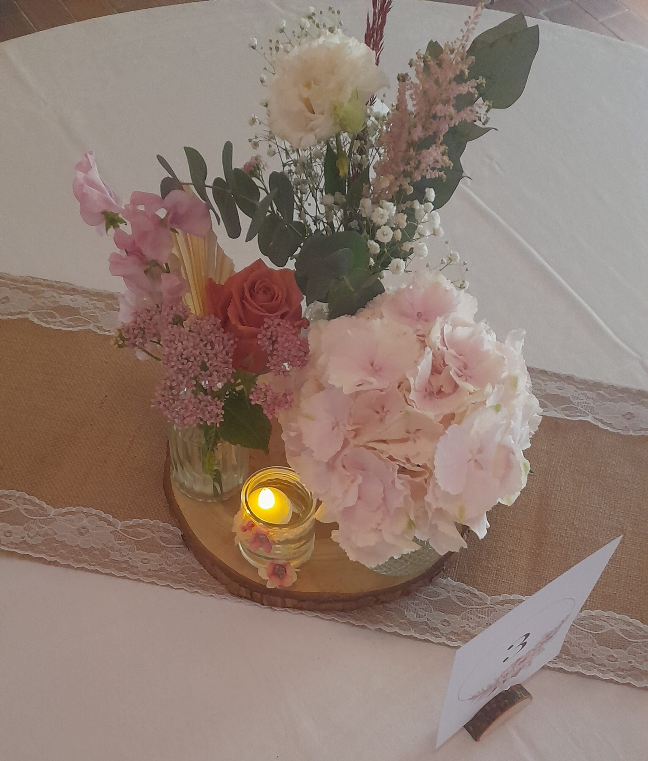 Magnifique centre de table composé de trois mini vases de différentes hauteurs, prix indiqué pour le fleurissent et la location des mini vase inclus, installation et démontage non inclus